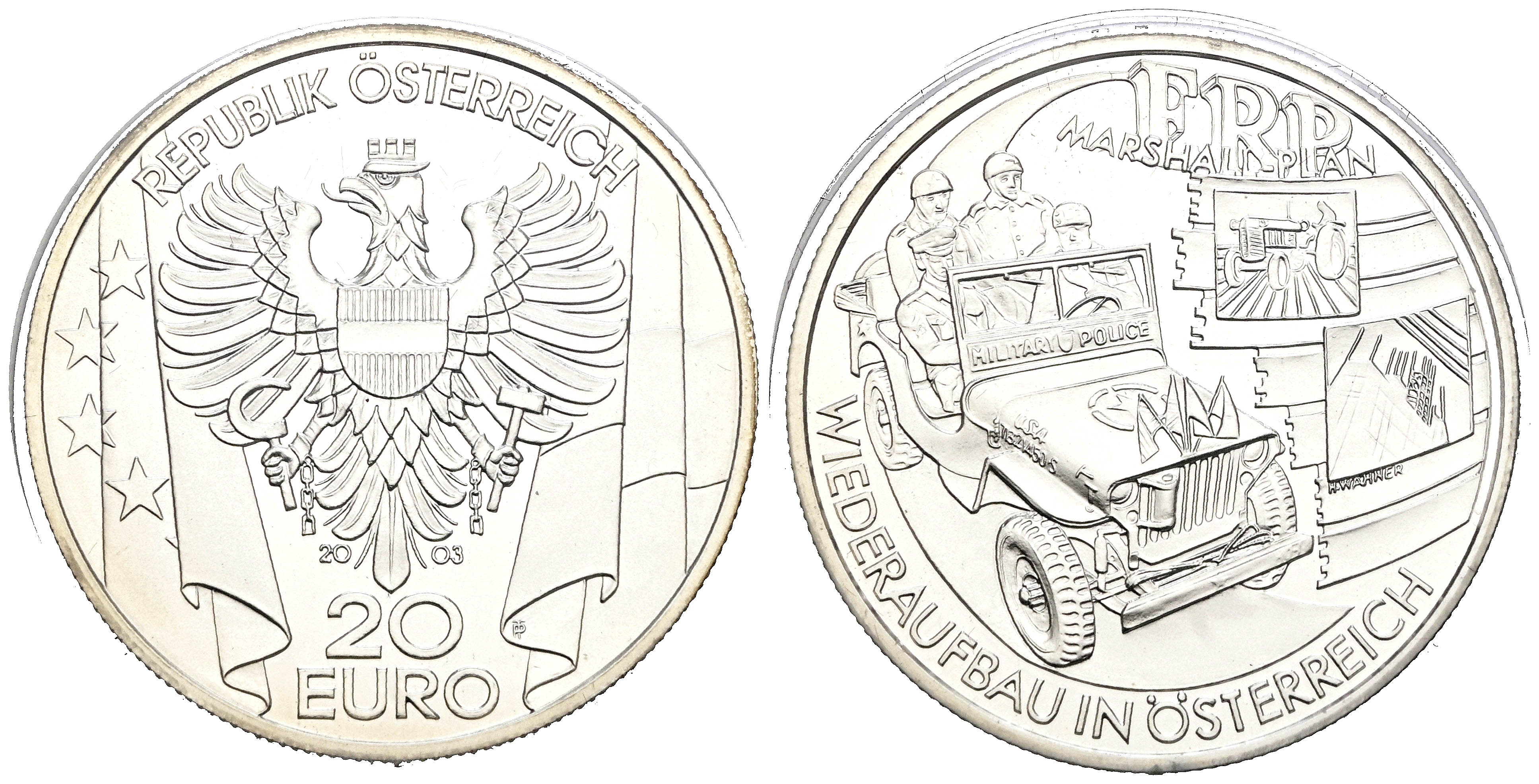AUSTRIA. 20 Euros. (Ar. 20,01g/34mm). 2003. Plan Marshall. (Km#3107). PROOF. Incluye estuche y certificado de autenticidad.