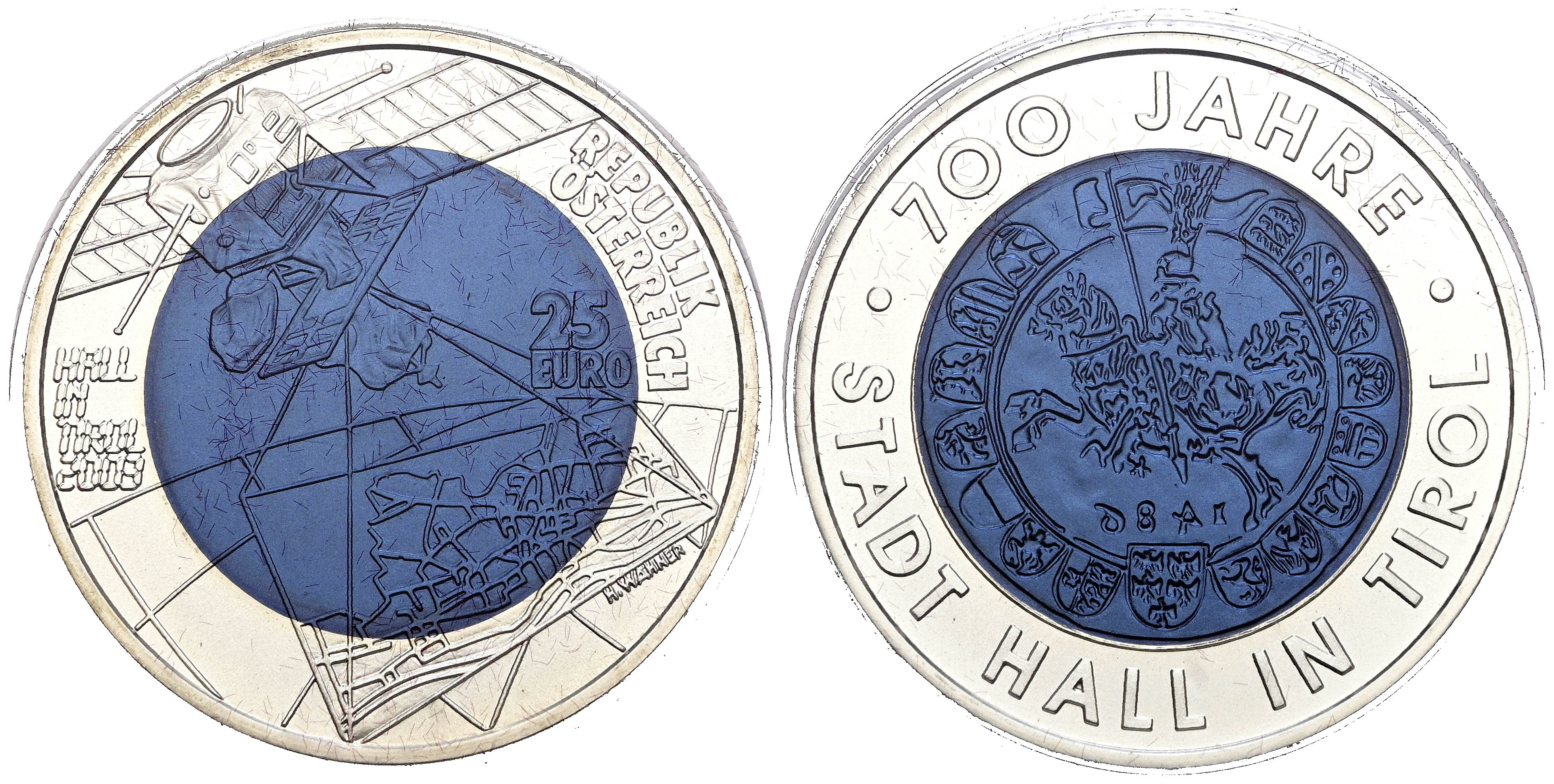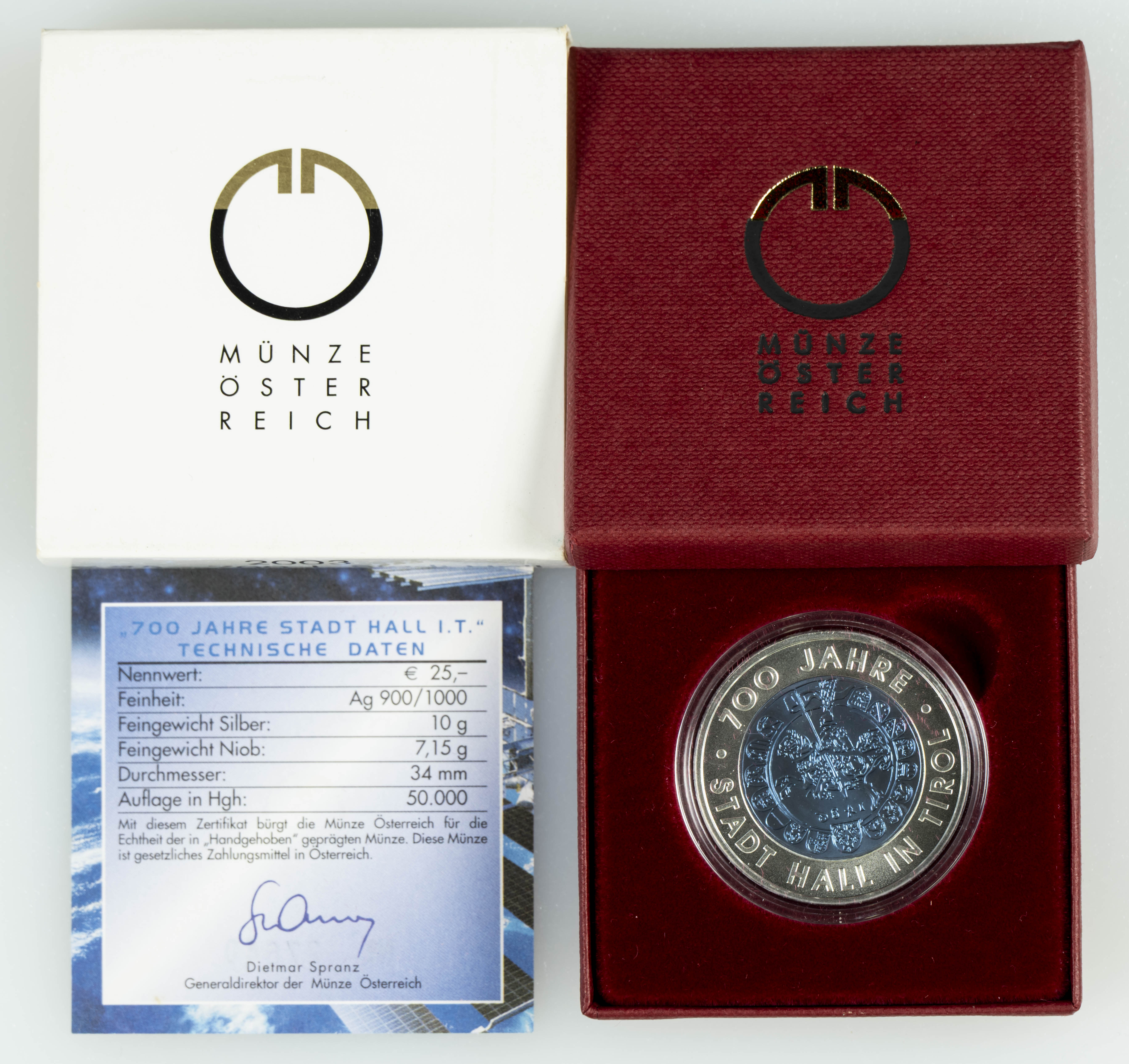 AUSTRIA. 25 Euros. (Niobio-Ar. 17,08/34mm). 2003. 700 Aniversario del Ayuntamiento del Tirol. (Km#3101). SC. Incluye estuche y certificado de autenticidad.