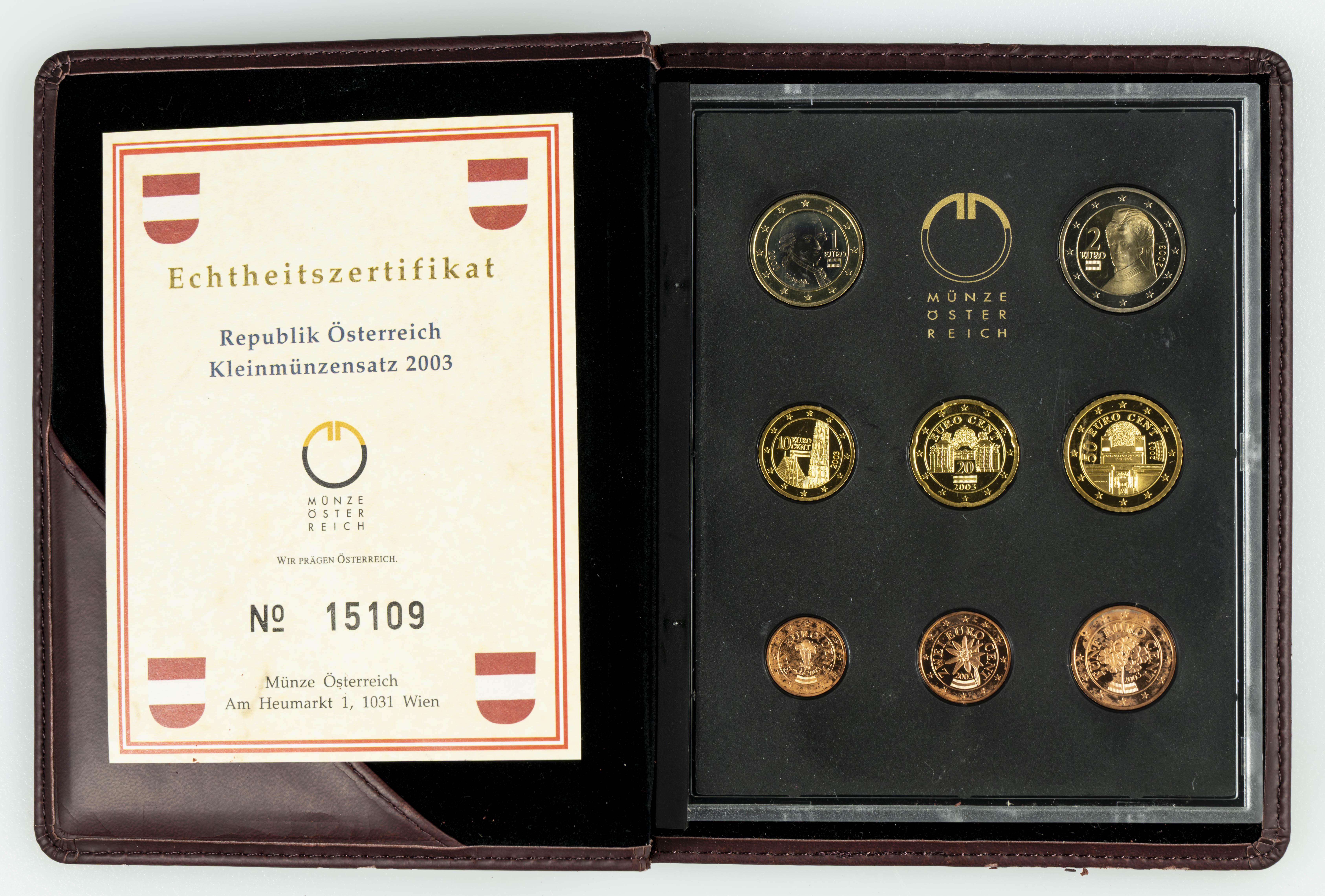 AUSTRIA. Estuche completo con 8 valores de Euro. 2003. PROOF. Incluye certificado de autenticidad.