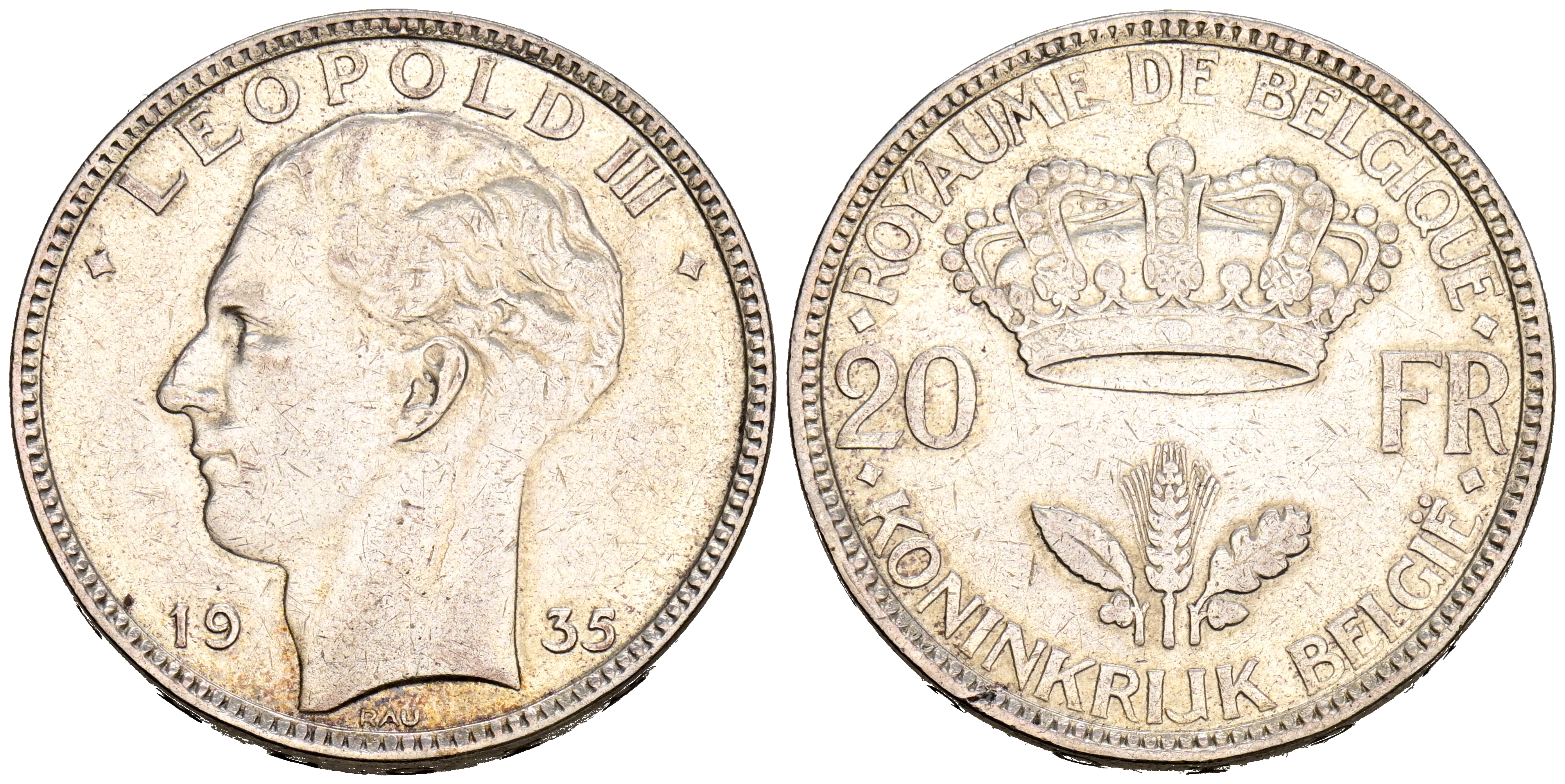 BÉLGICA, Leopoldo III. 20 Francos. (Ar. 10,88g/28mm). 1935. (Km#105). MBC+
