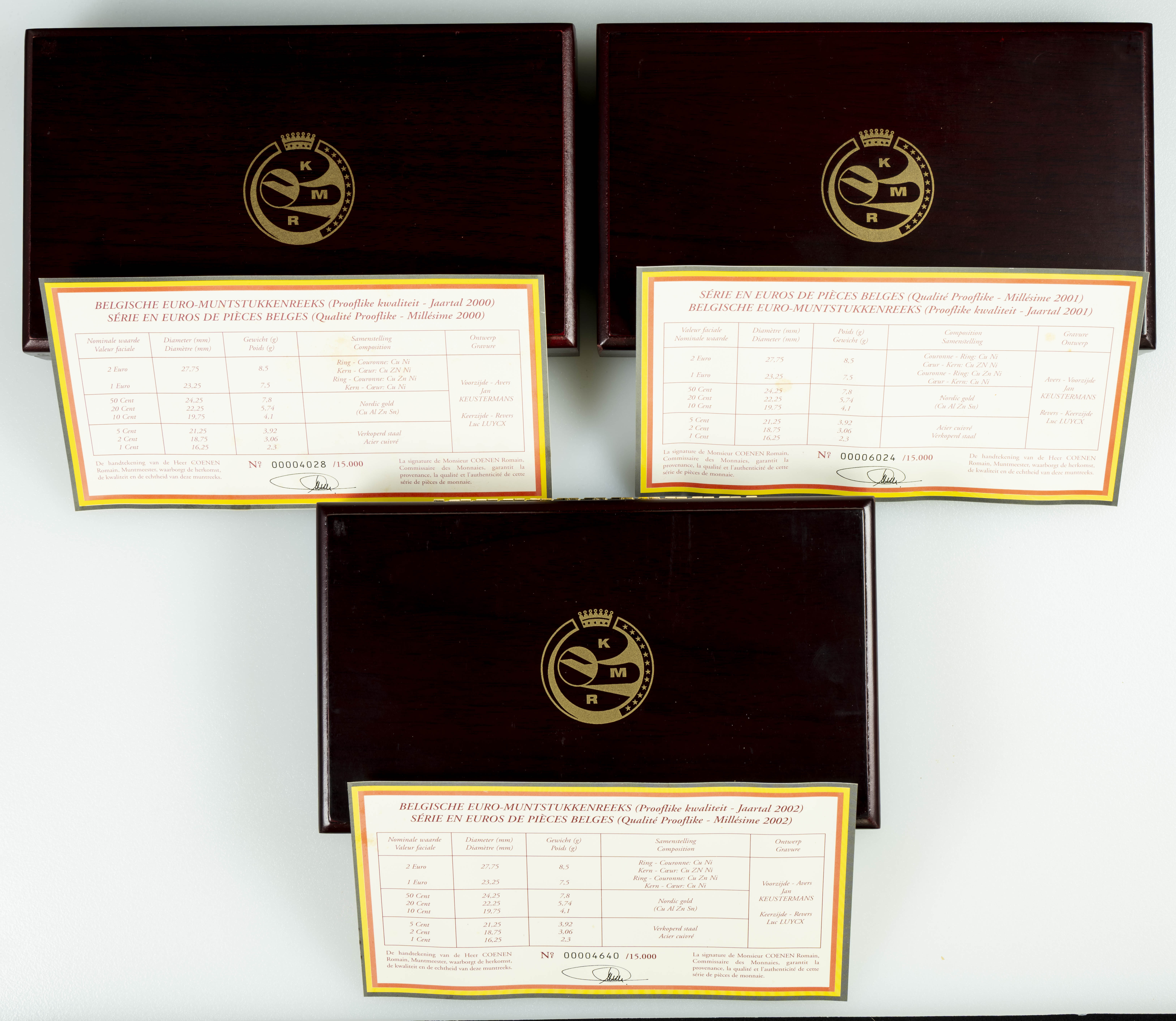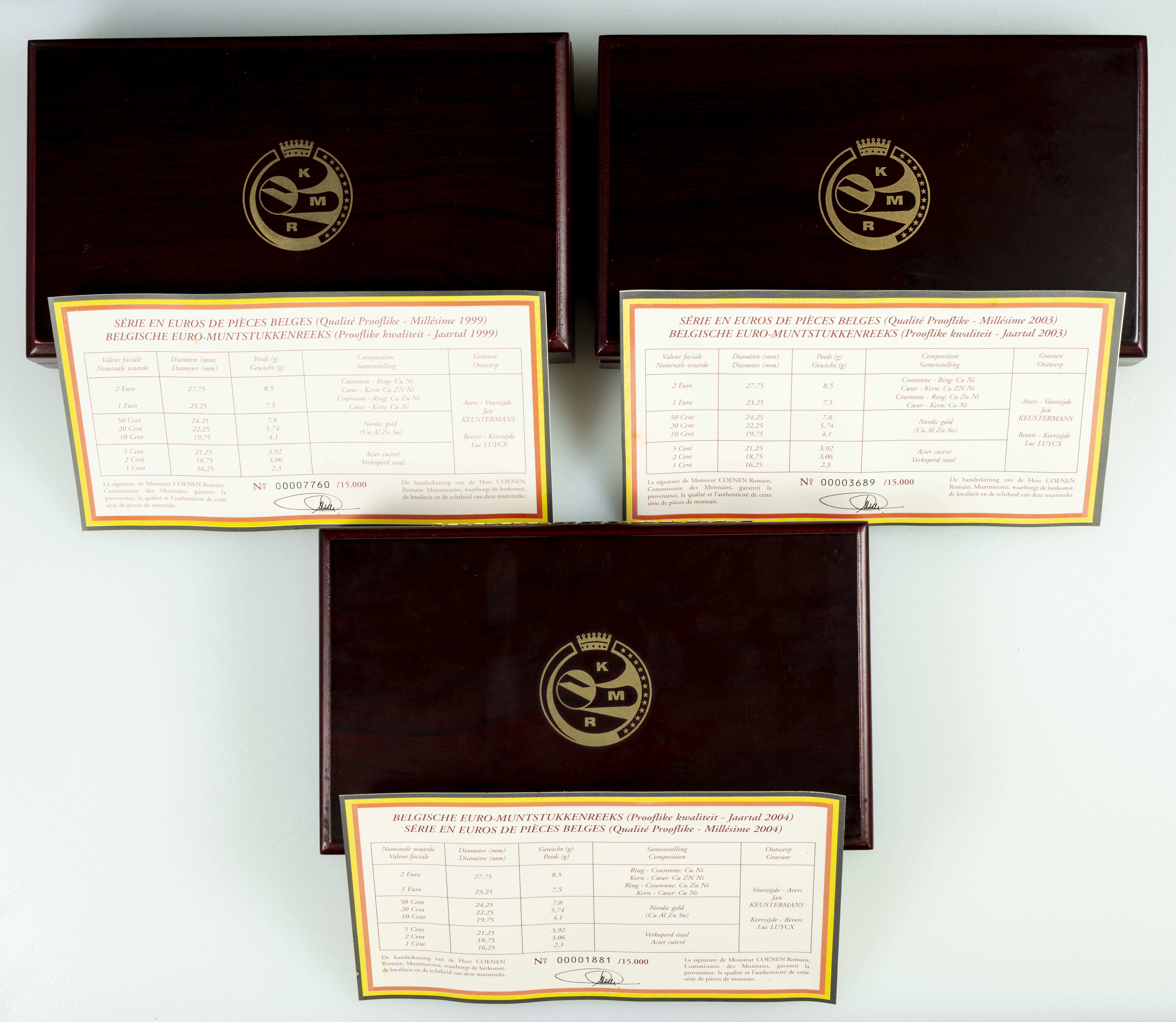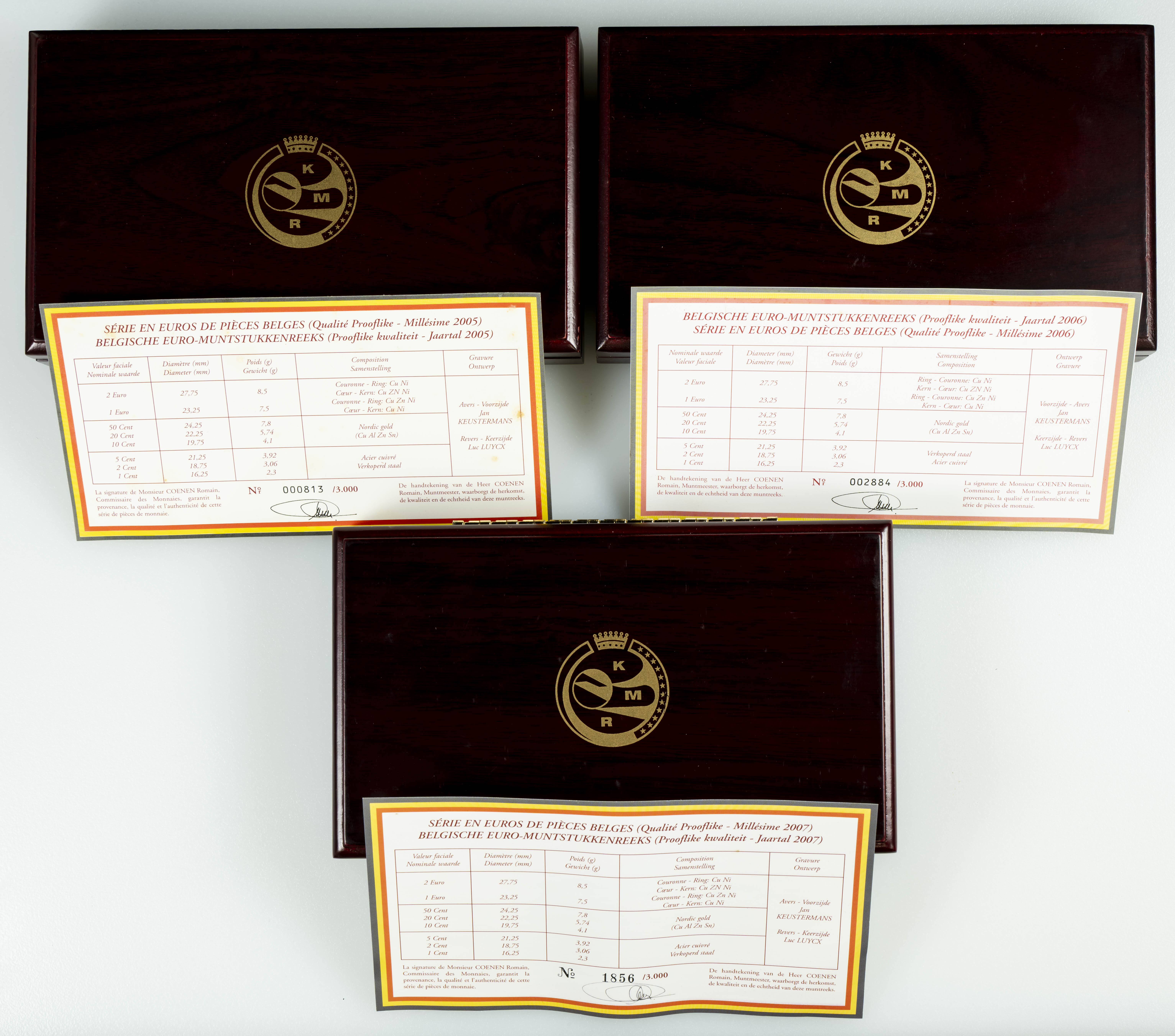 BÉLGICA. Conjunto de 9 estuches con las series completa de Euros (8 valores). Años: 1999-2007. Sin fechas repetidas. PROOF. Sets completos incluyendo certificados de autenticidad. A EXAMINAR.