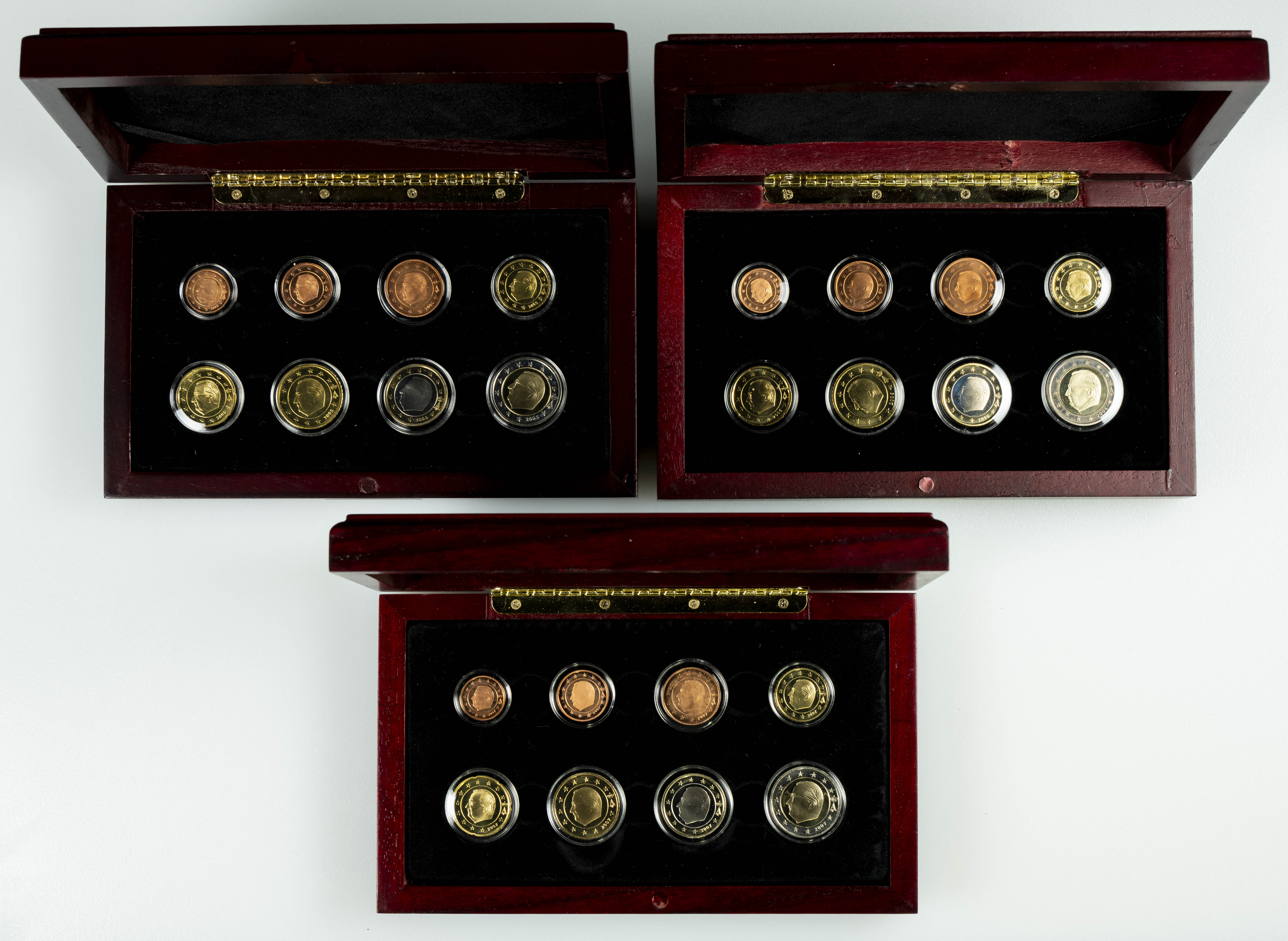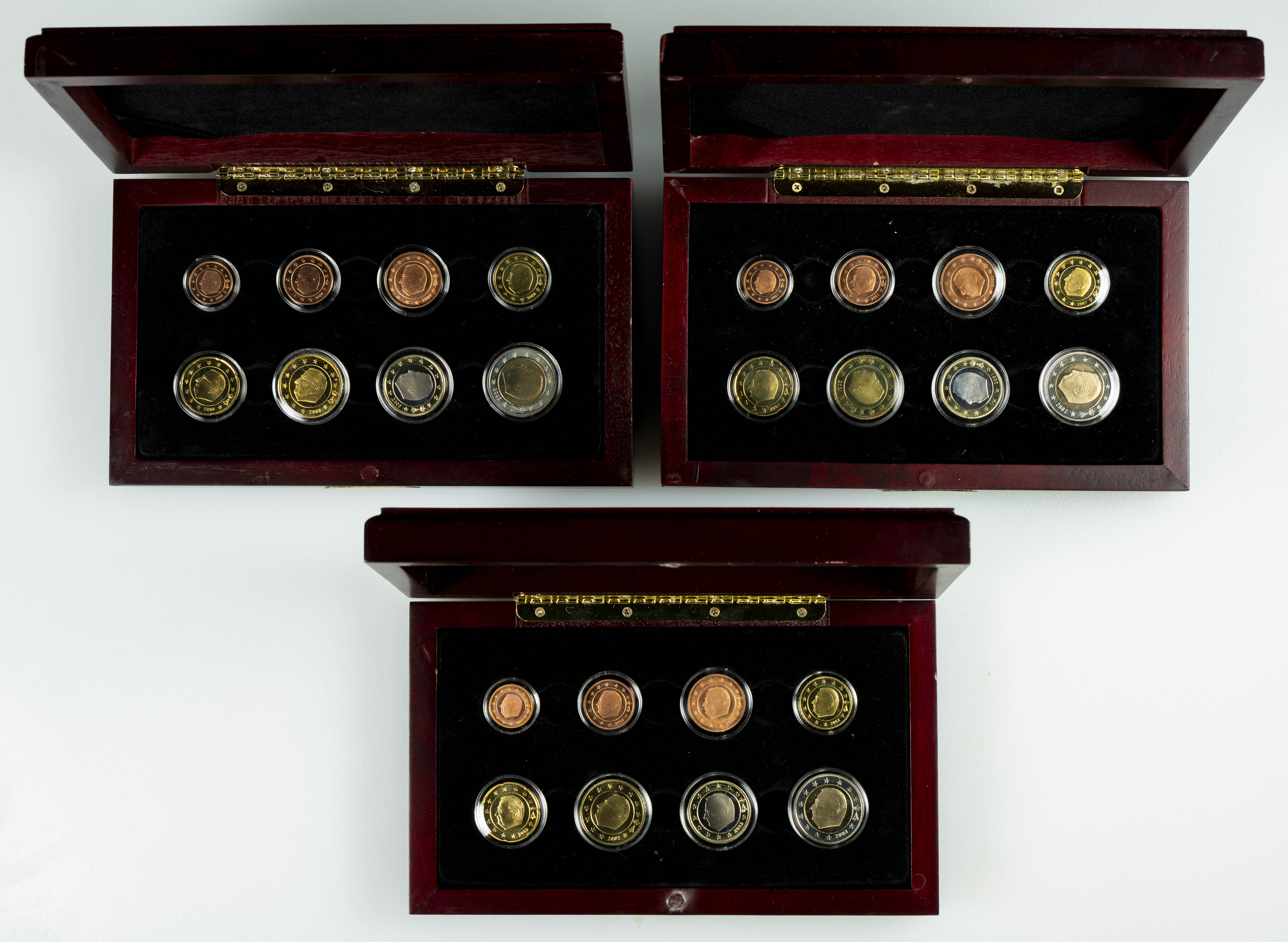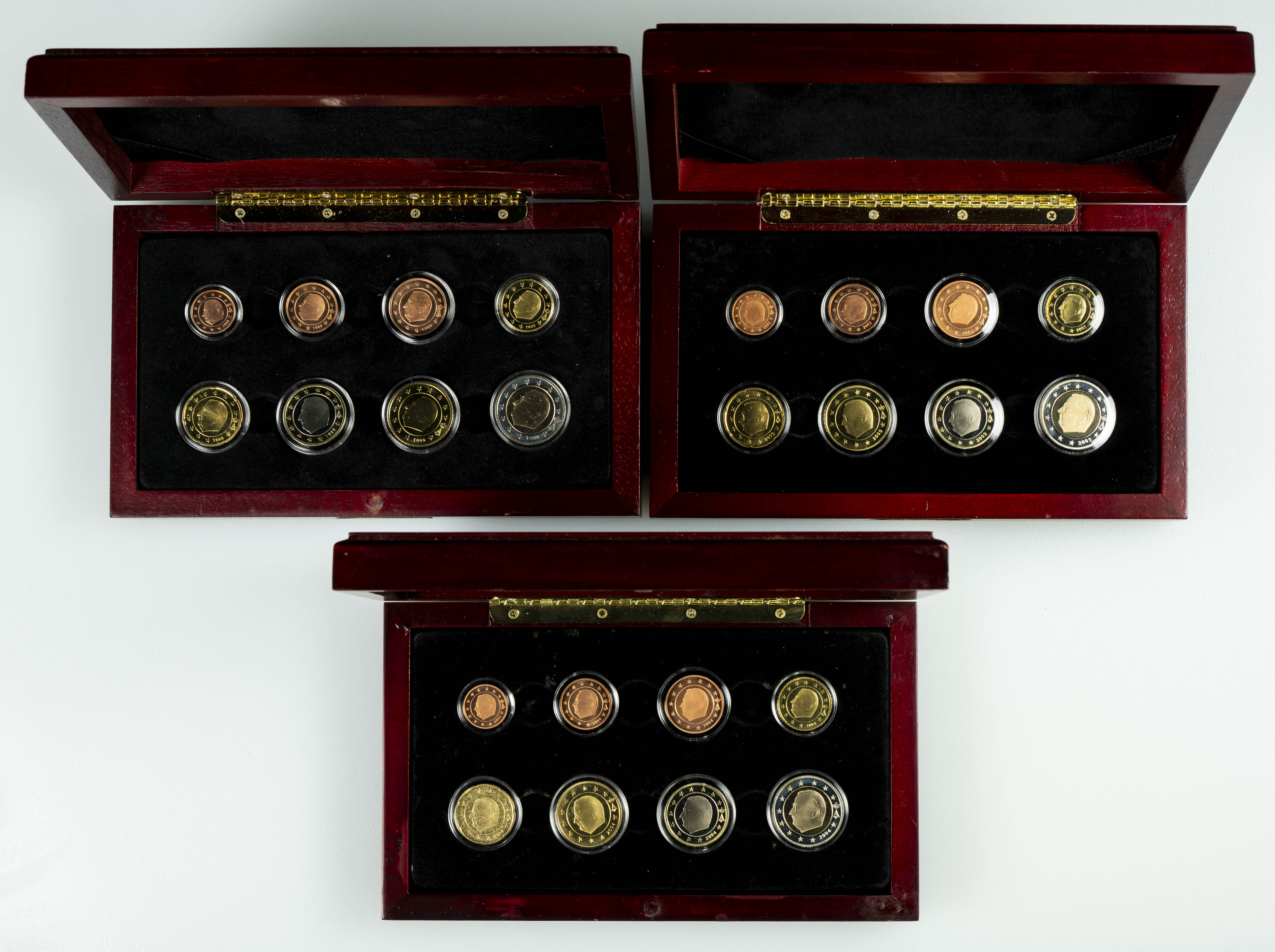 BÉLGICA. Conjunto de 9 estuches con las series completa de Euros (8 valores). Años: 1999-2007. Sin fechas repetidas. PROOF. Sets completos incluyendo certificados de autenticidad. A EXAMINAR.