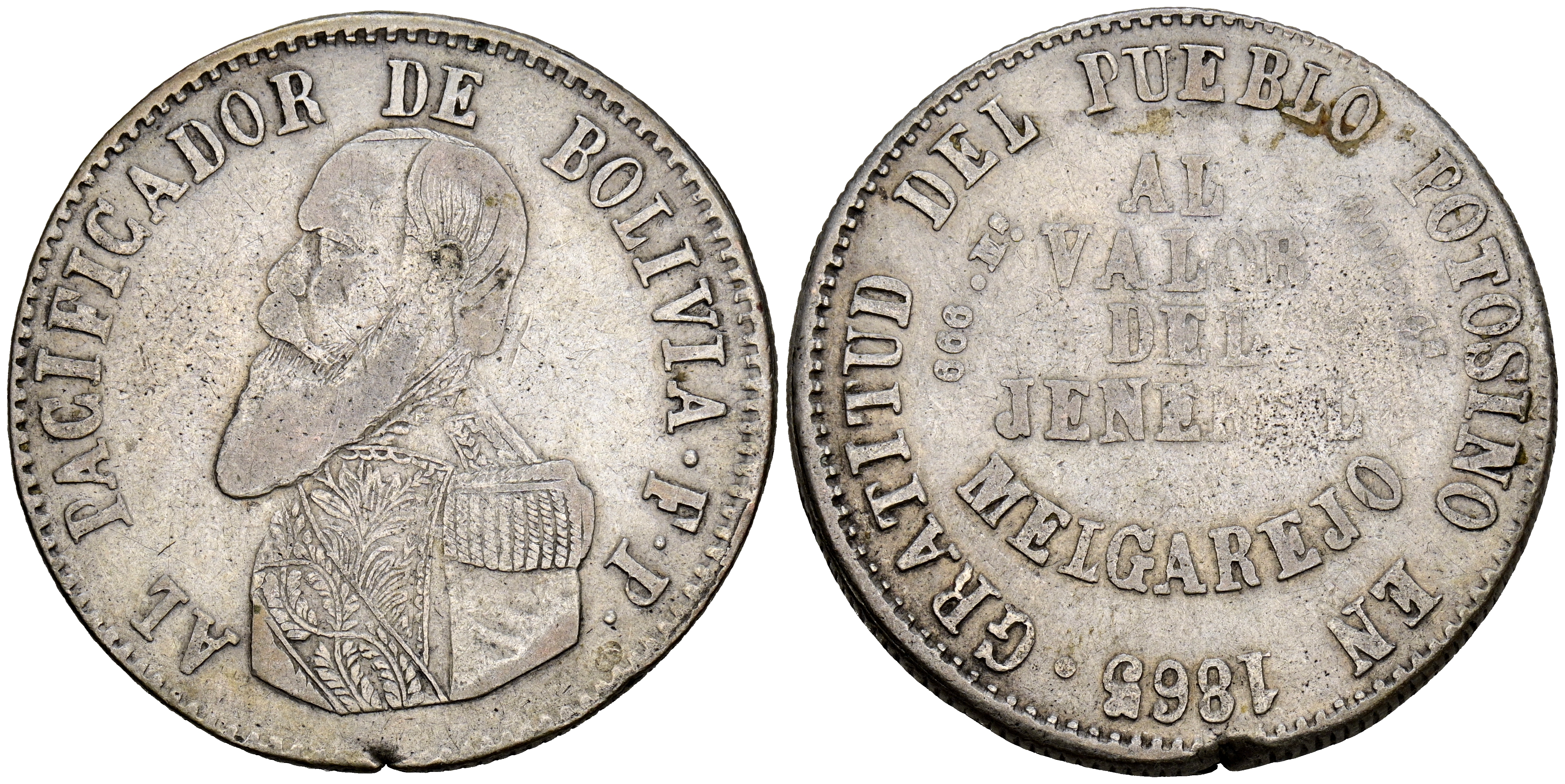 BOLIVIA. 1 Melgarejo. (Ar. 18,10g/36mm). 1865. Potosí FP. (Km#146). BC+. Escaso.