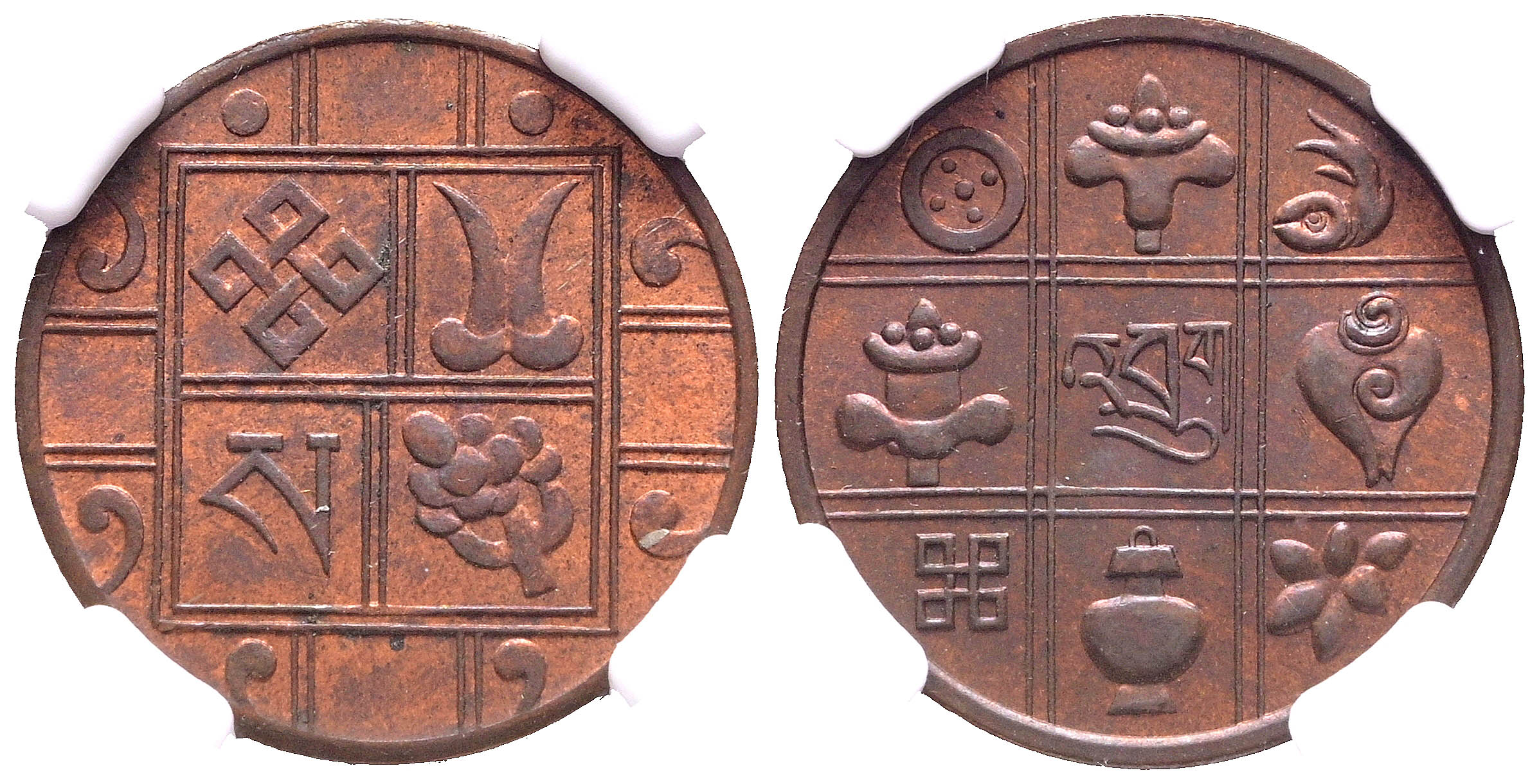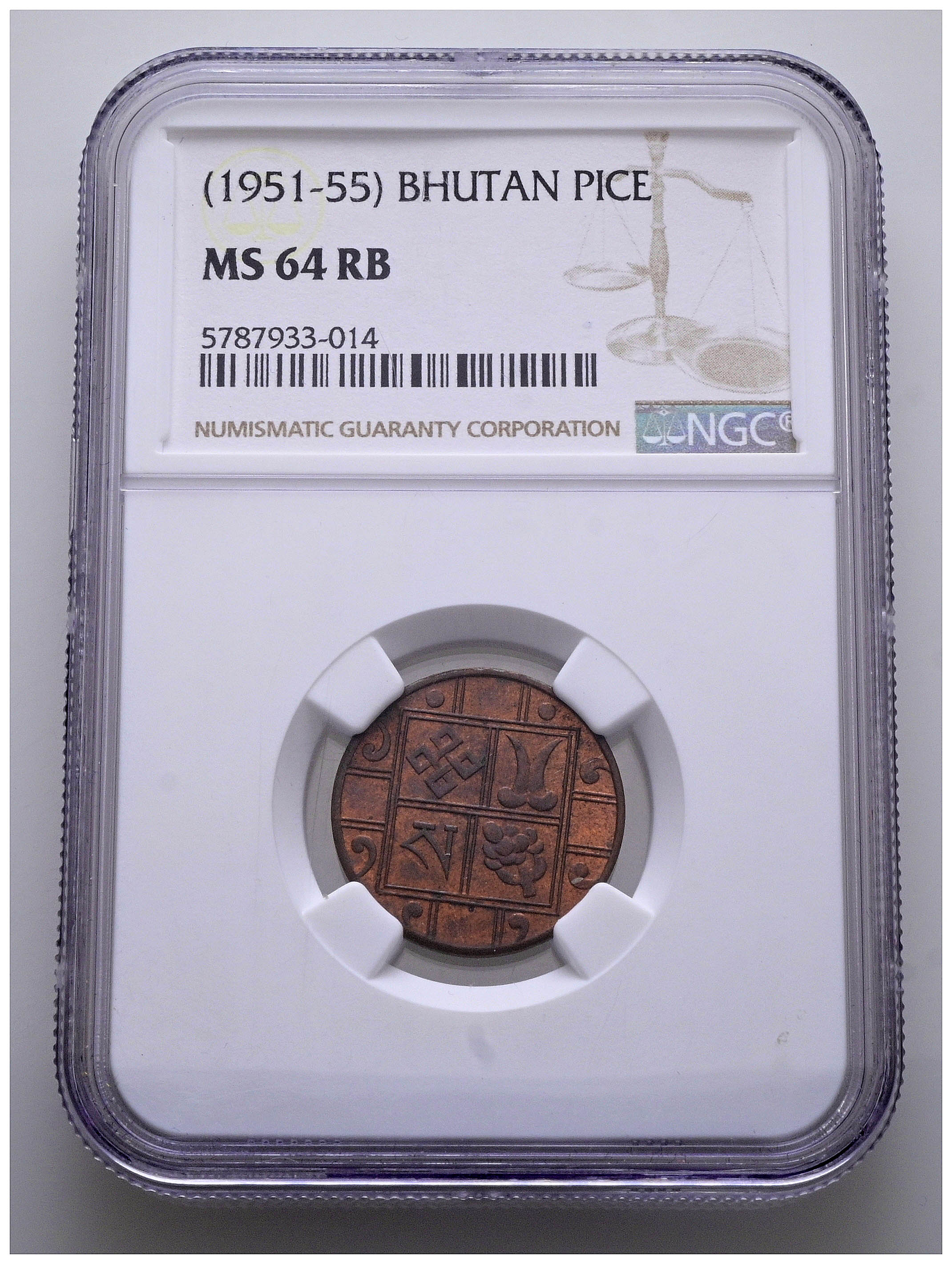 BUTÁN. 1 Paise. (Ae. 2,90g/21mm)*. 1951-1955. (Km#27). Encapasulada por NGC MS 64 RB. *Peso y medidas teóricos.