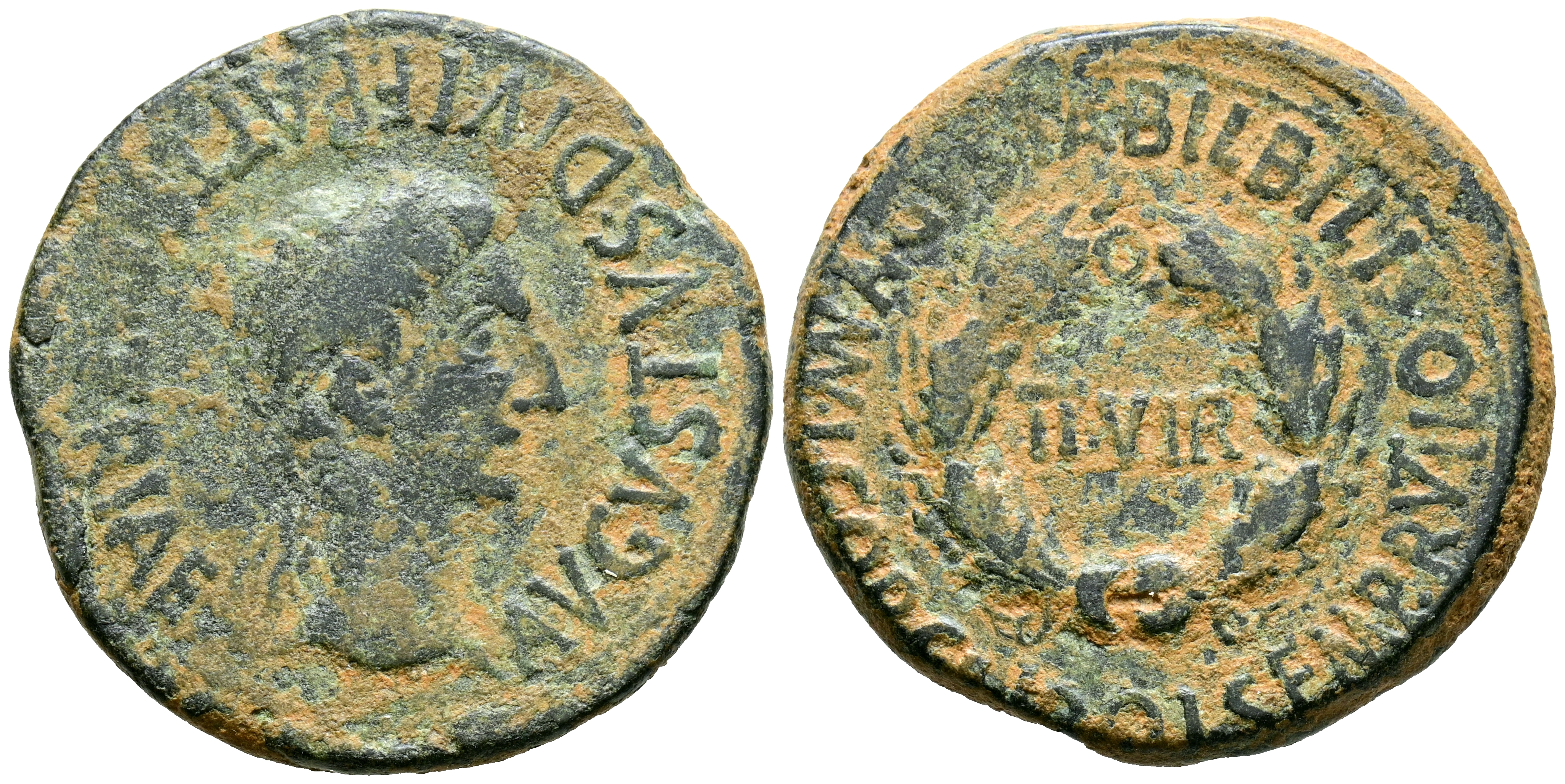 BILBILIS (Calatayud, Zaragoza). As. (Ae. 12,69g/29mm). 27 a.C.-14 d.C. (FAB-278). Anv: Cabeza laureada de Augusto a derecha, alrededor leyenda: AVGVSTVS DIVI F PATER PATRIAE. Rev: Corona de laurel, dentro: II VIR, alrededor leyenda: MVN AVGVSTA BILBILIS M SEMP TIBERI L LICI VARO. MBC-.