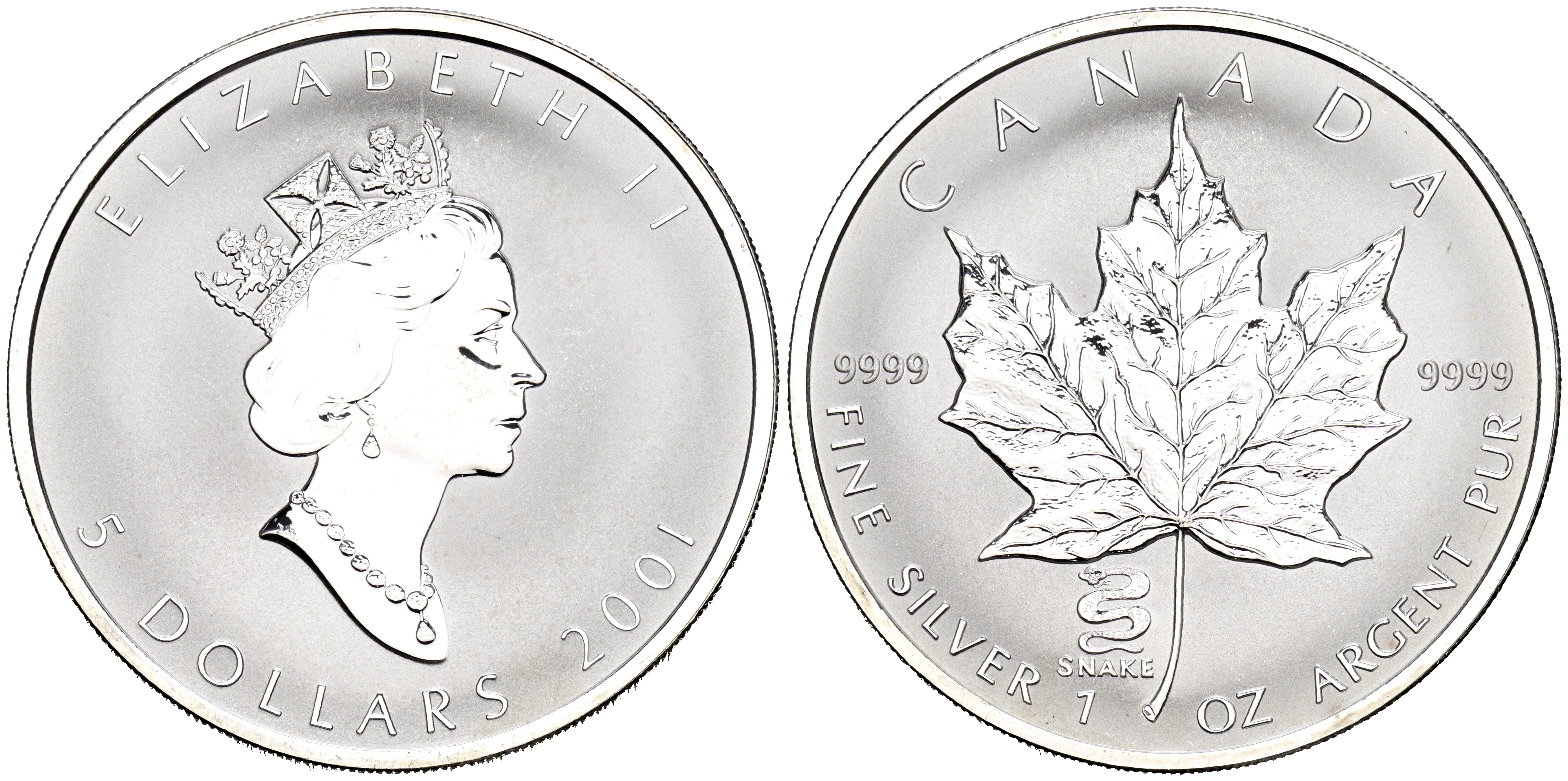 CANADÁ. 5 Dollars (Ar. 31,48/38mm). 2001. Maple leaf. Marca: Snake. (Km#187). SC.