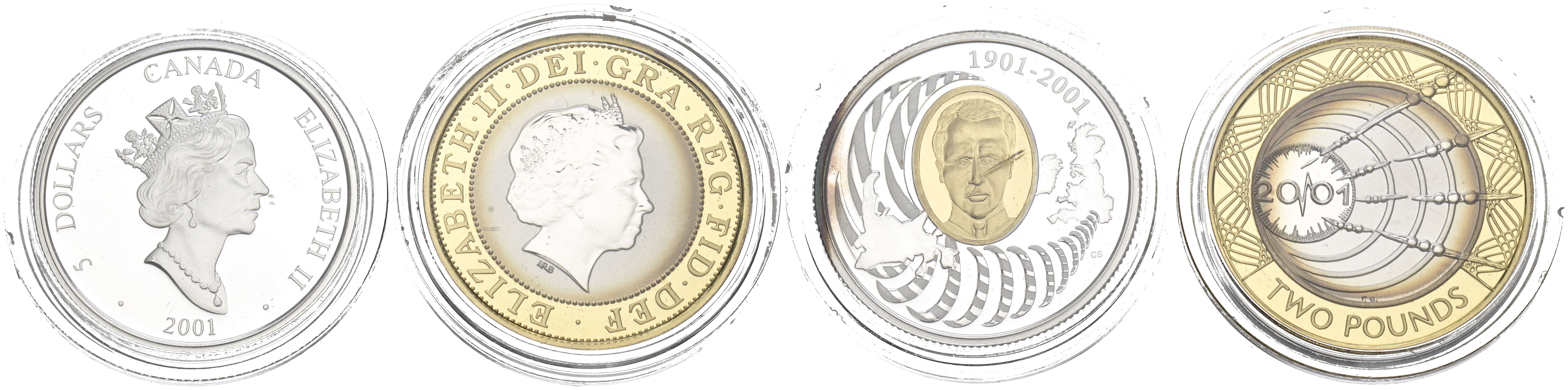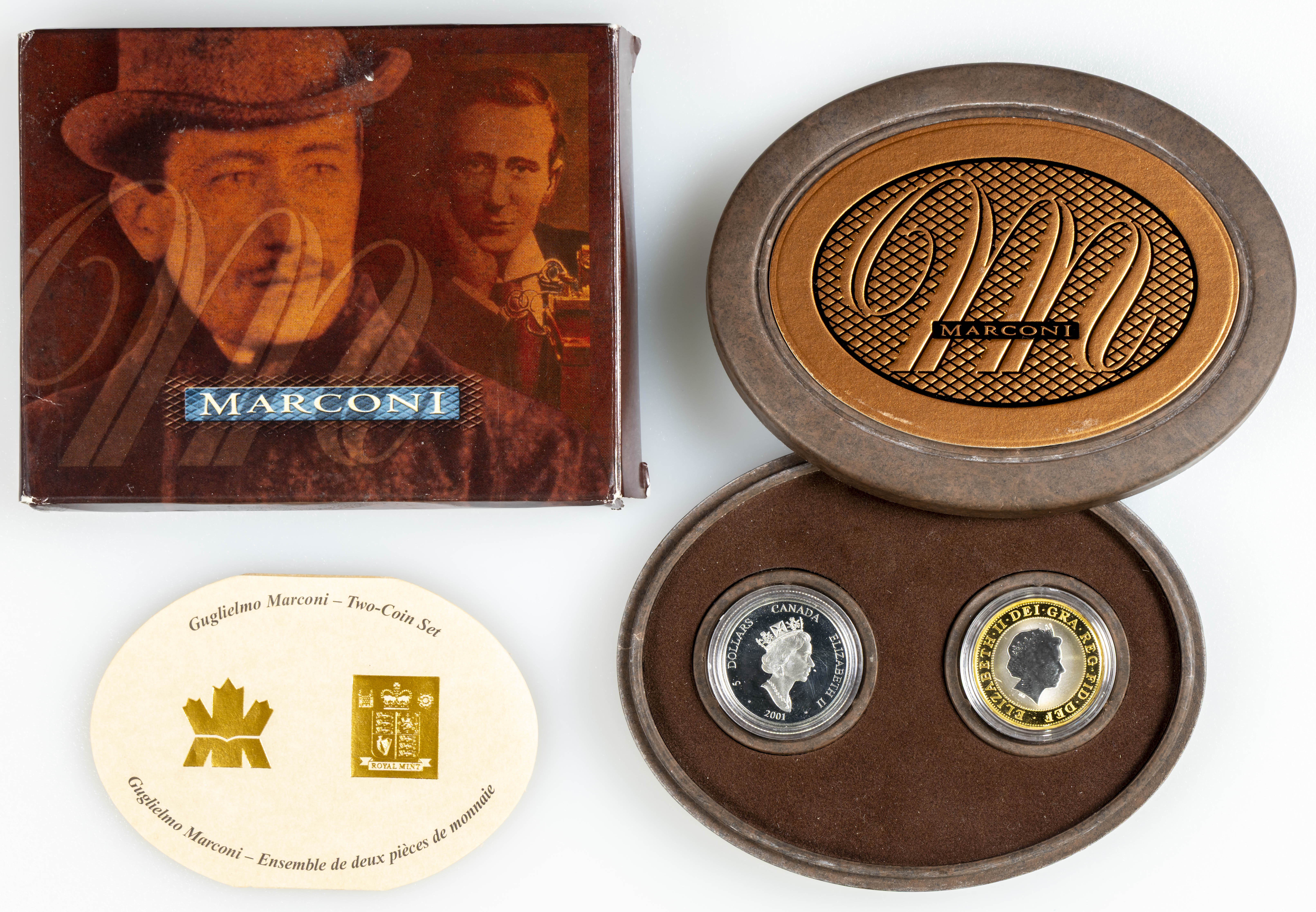 CANADÁ Y GRAN BRETAÑA. Set de 2 monedas en plata de 5 Dollars y 2 Pounds. Homenaje a Marconi. 2001. Estuche completo incluyendo certificado de autenticidad. A EXAMINAR. PROOF. Tirada de 30.000 unidades.