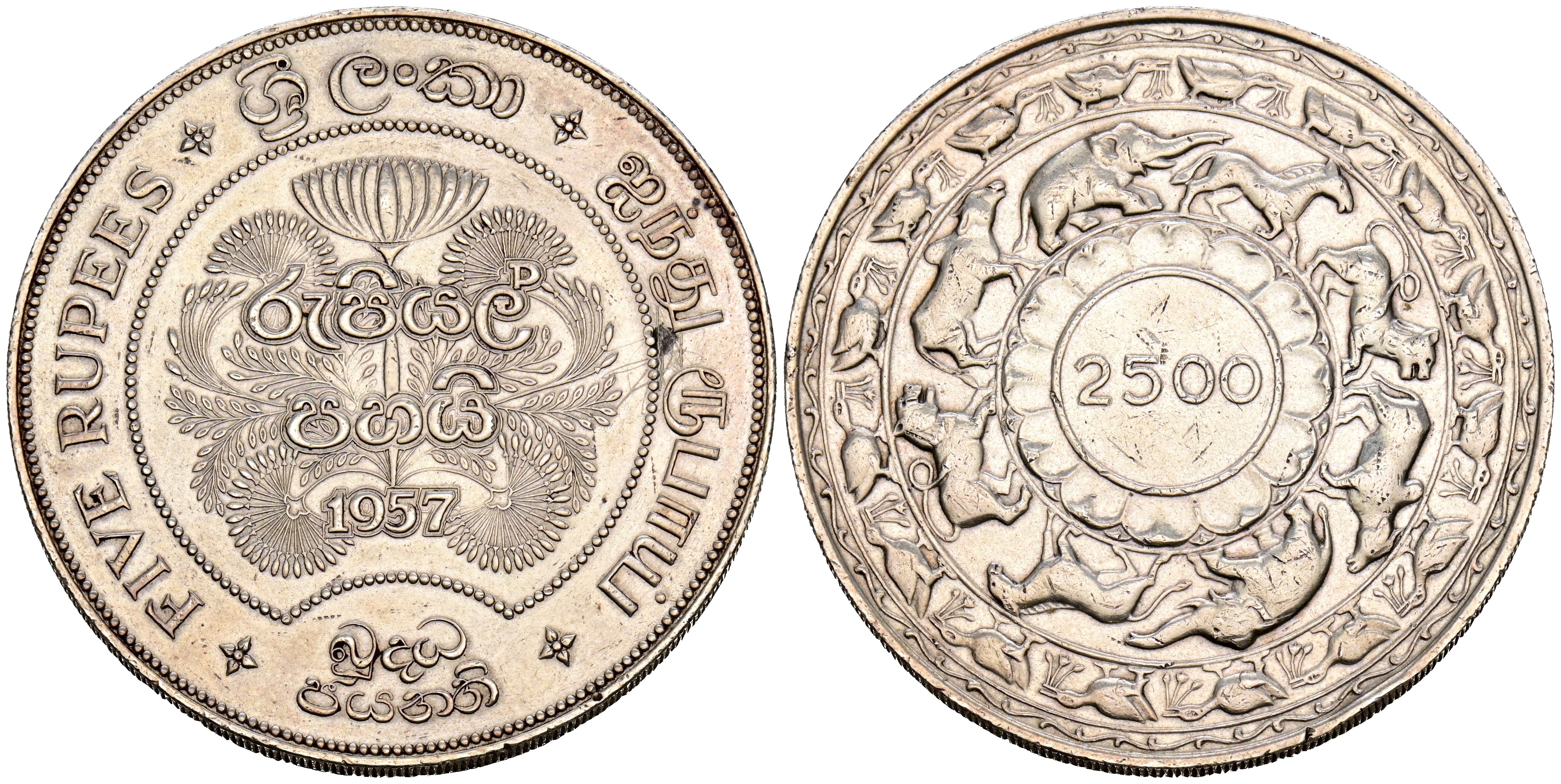 CEILÁN (Sri Lanka). 5 Rupias. (Ar. 28,20g/39mm). 1957. 2500 Aniversario de Budismo. (Km#126). EBC-.