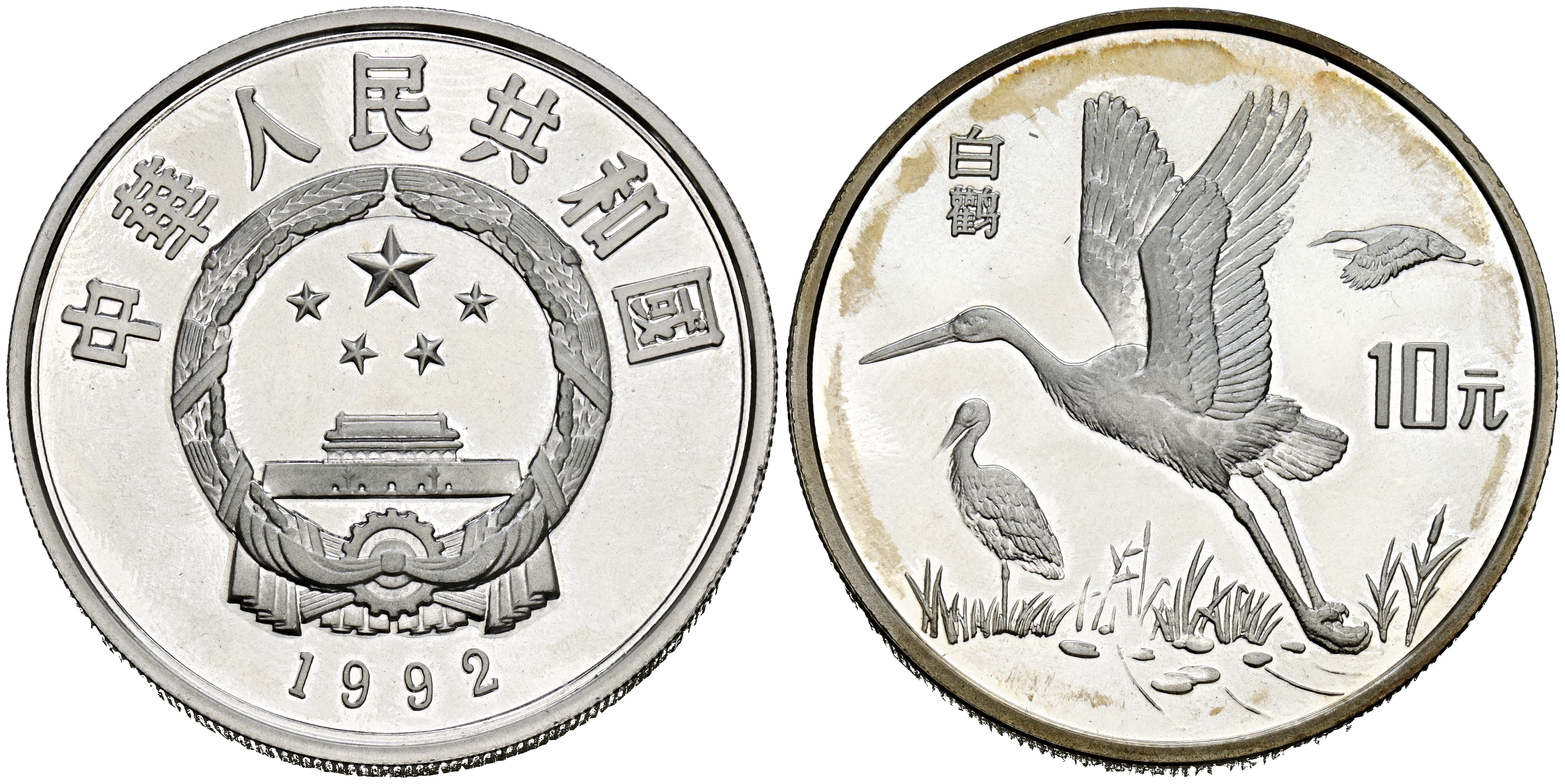 CHINA. 10 Yuan. (Ar. 27,24g/39mm). 1992. Cigüeña blanca. (Km#454). PROOF.