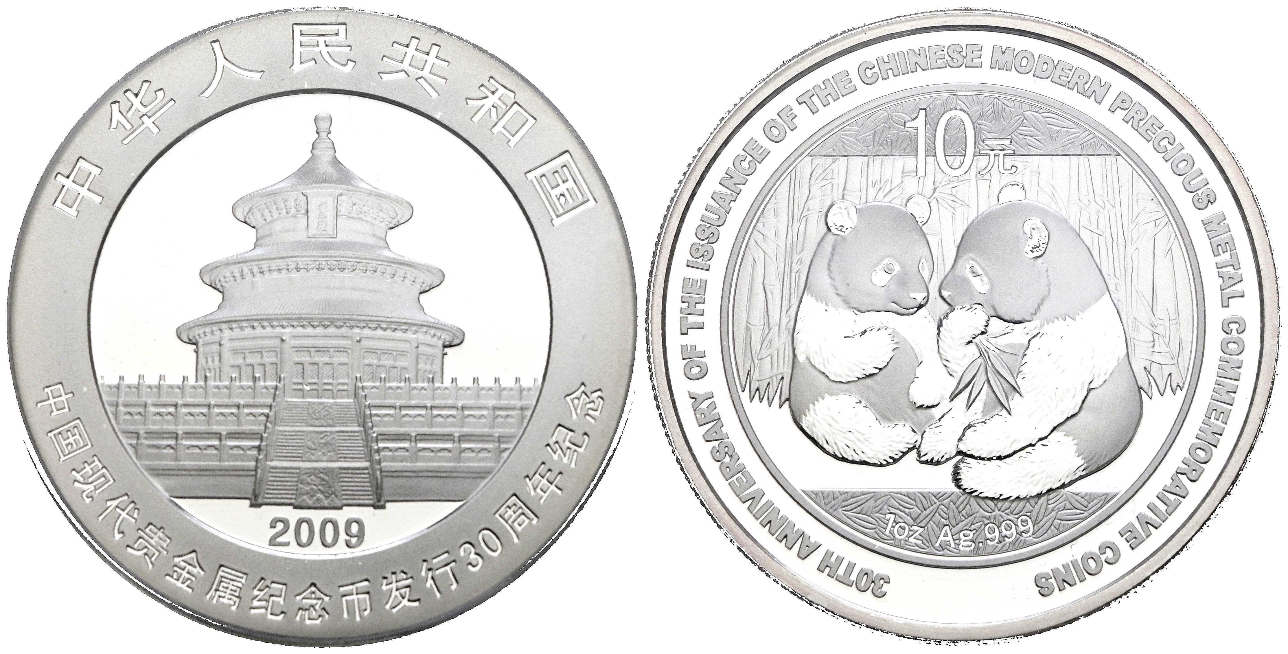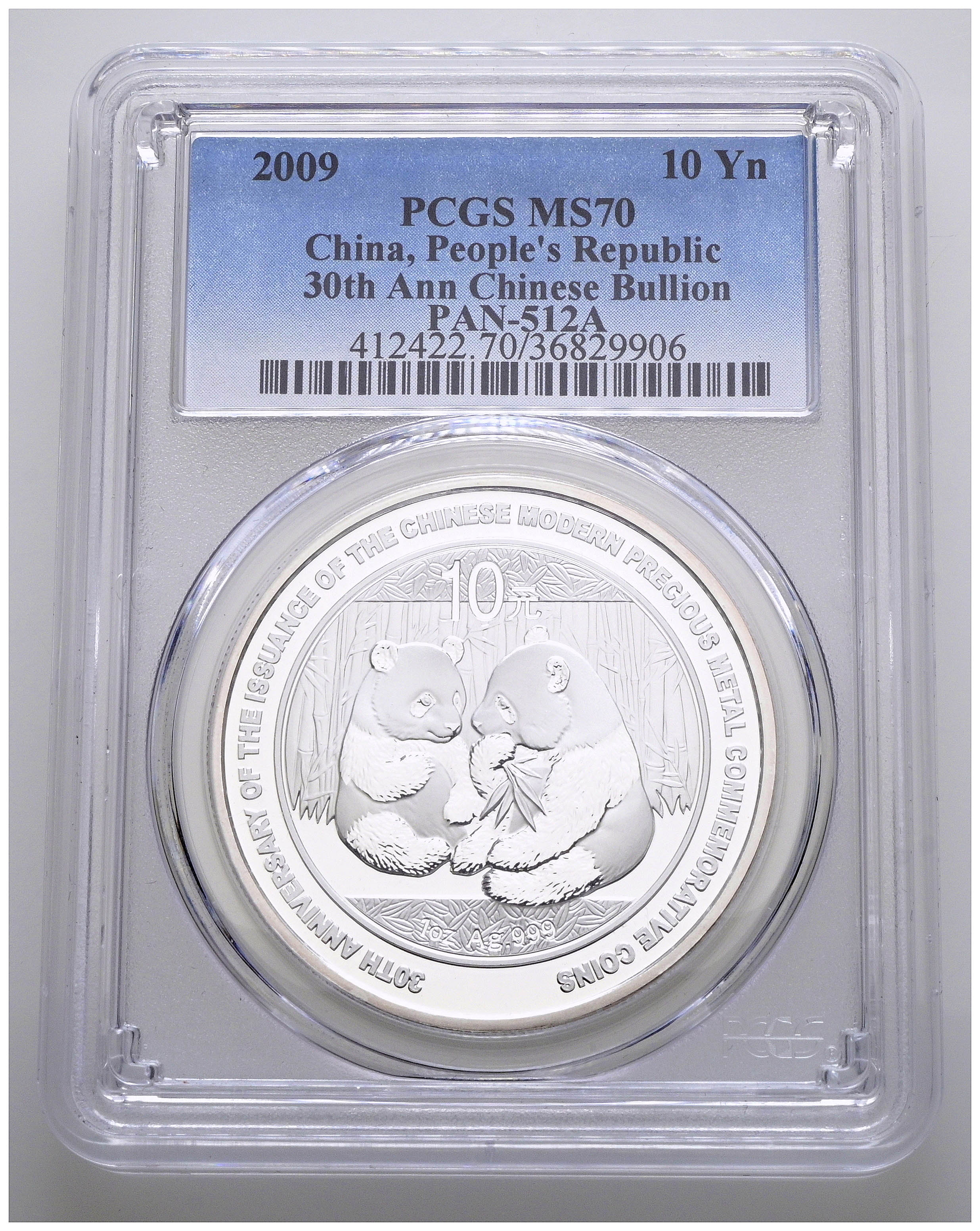 CHINA. 10 Yuan. (Ar. 30,00g/40mm)*. 2009. Serie Panda. 30 Aniversario de las monedas Bullion en China. Encapsulado por PCGS MS 70. *Peso y medidas teóricos.