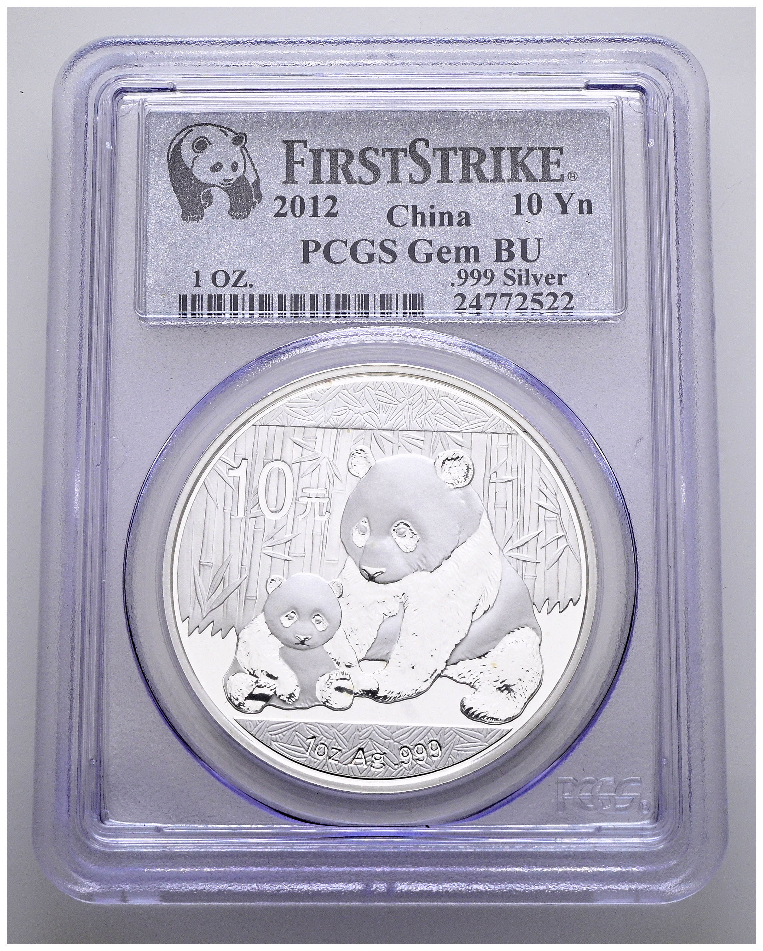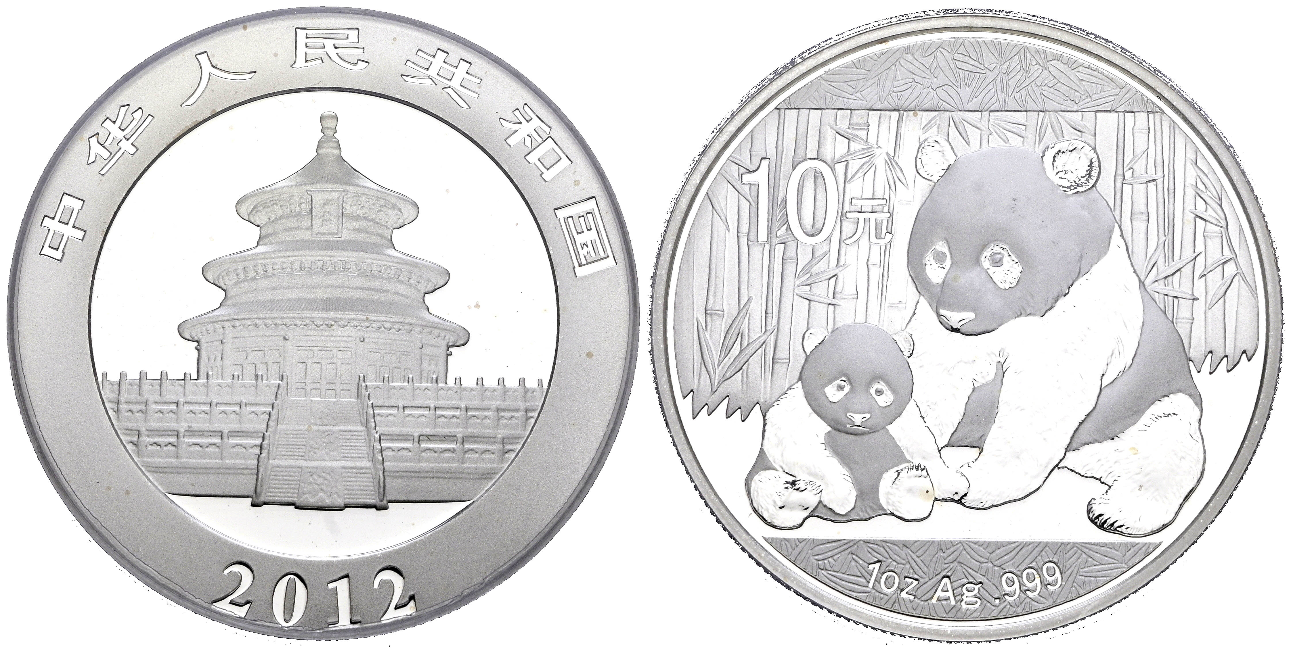 CHINA. 10 Yuan. (Ar. 30,00g/40mm)*. 2012. Serie Panda. First Strike. Encapsulado por PCGS Gem BU. *Peso y medidas teóricos.