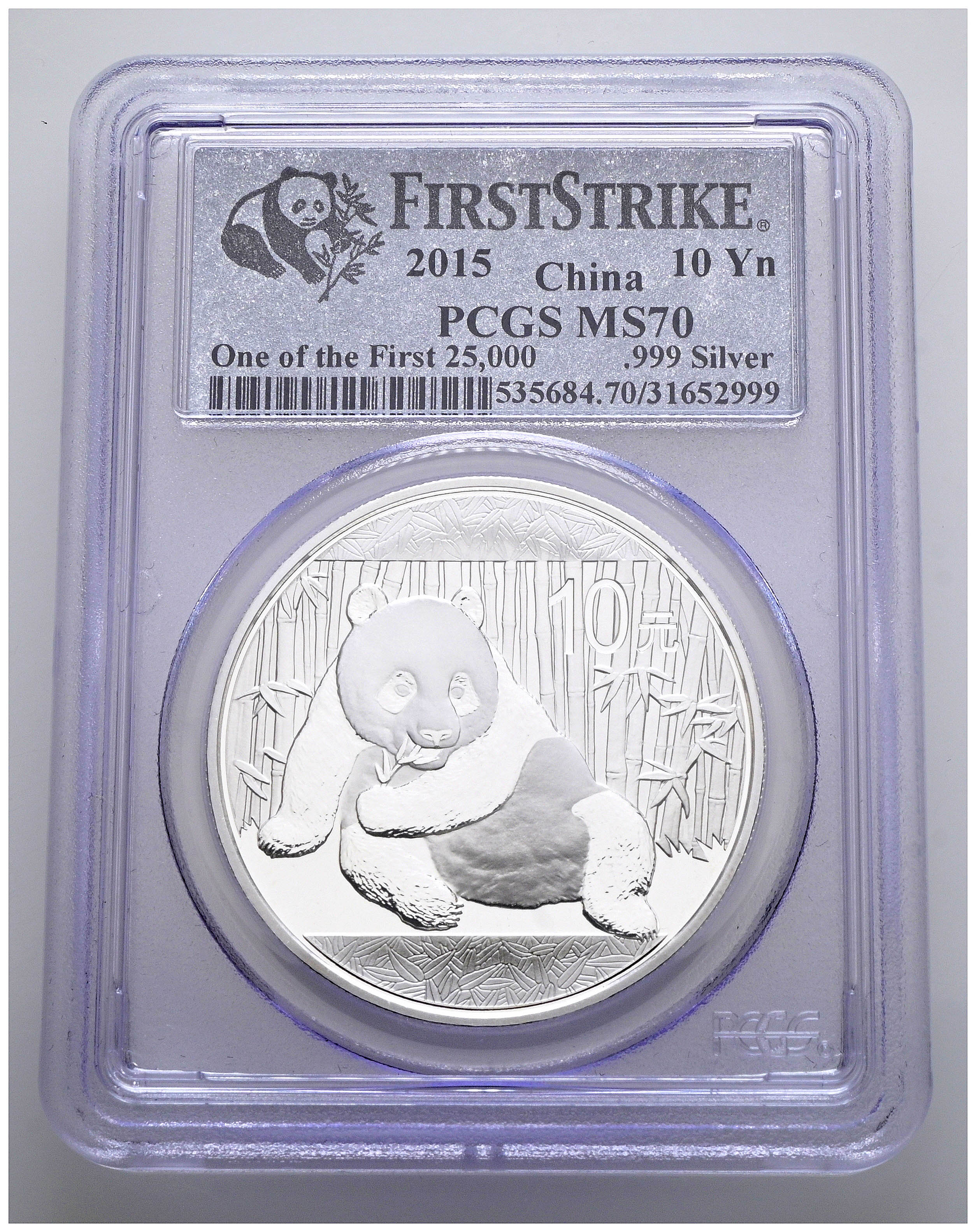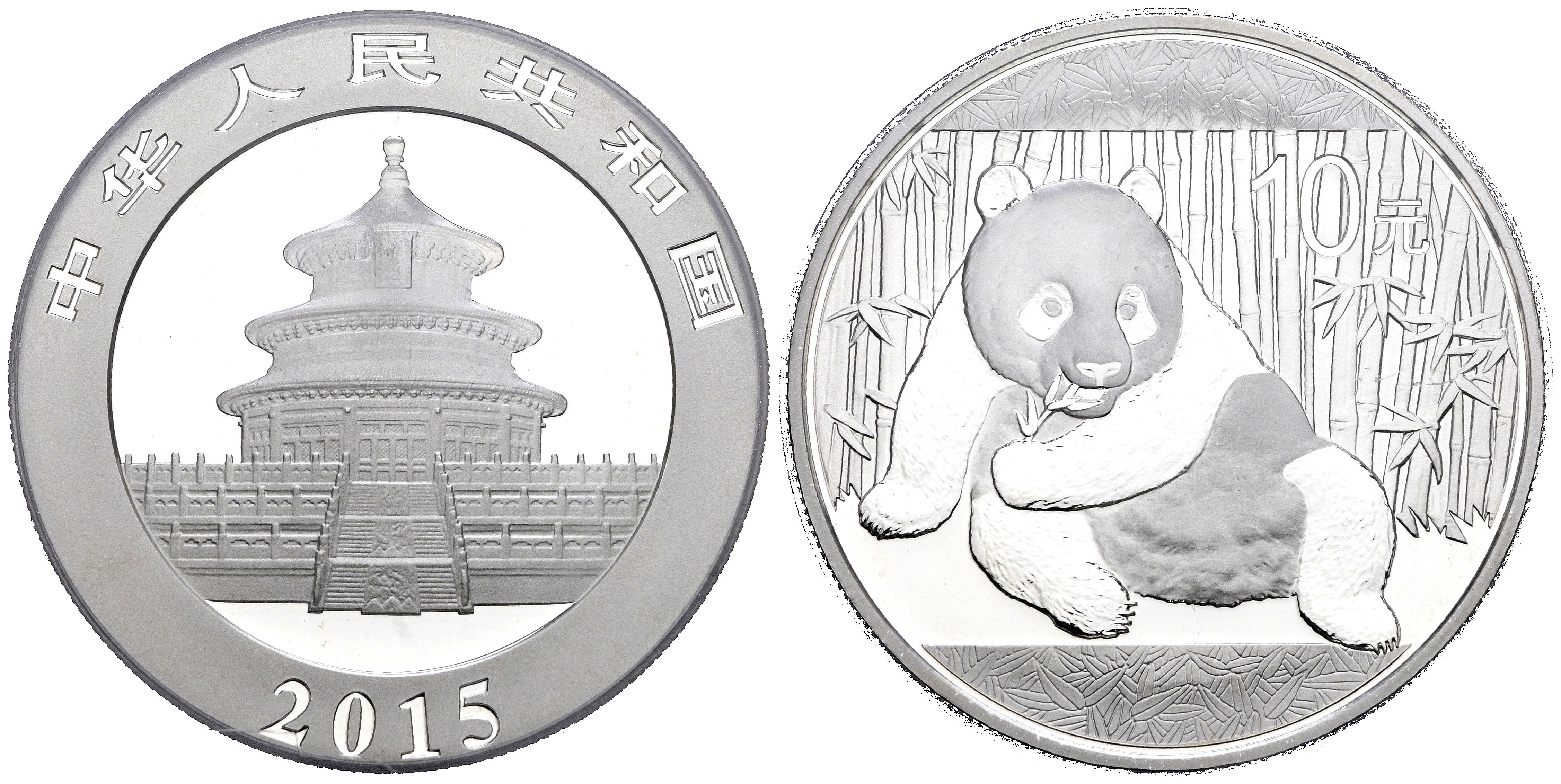 CHINA. 10 Yuan. (Ar. 30,00g/40mm)*. 2015. Serie Panda. First Strike. Encapsulado por PCGS MS 70. *Peso y medidas teóricos.