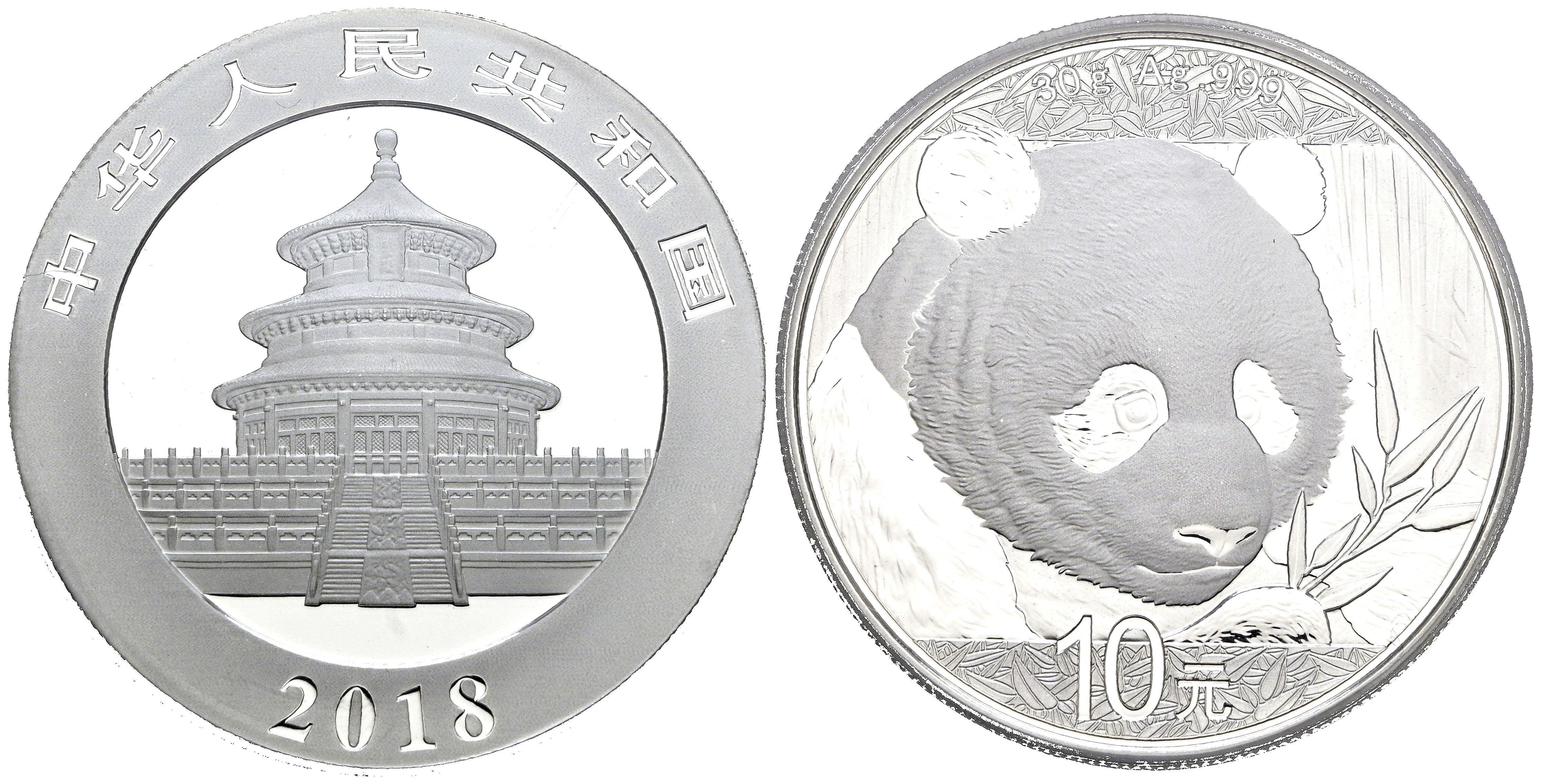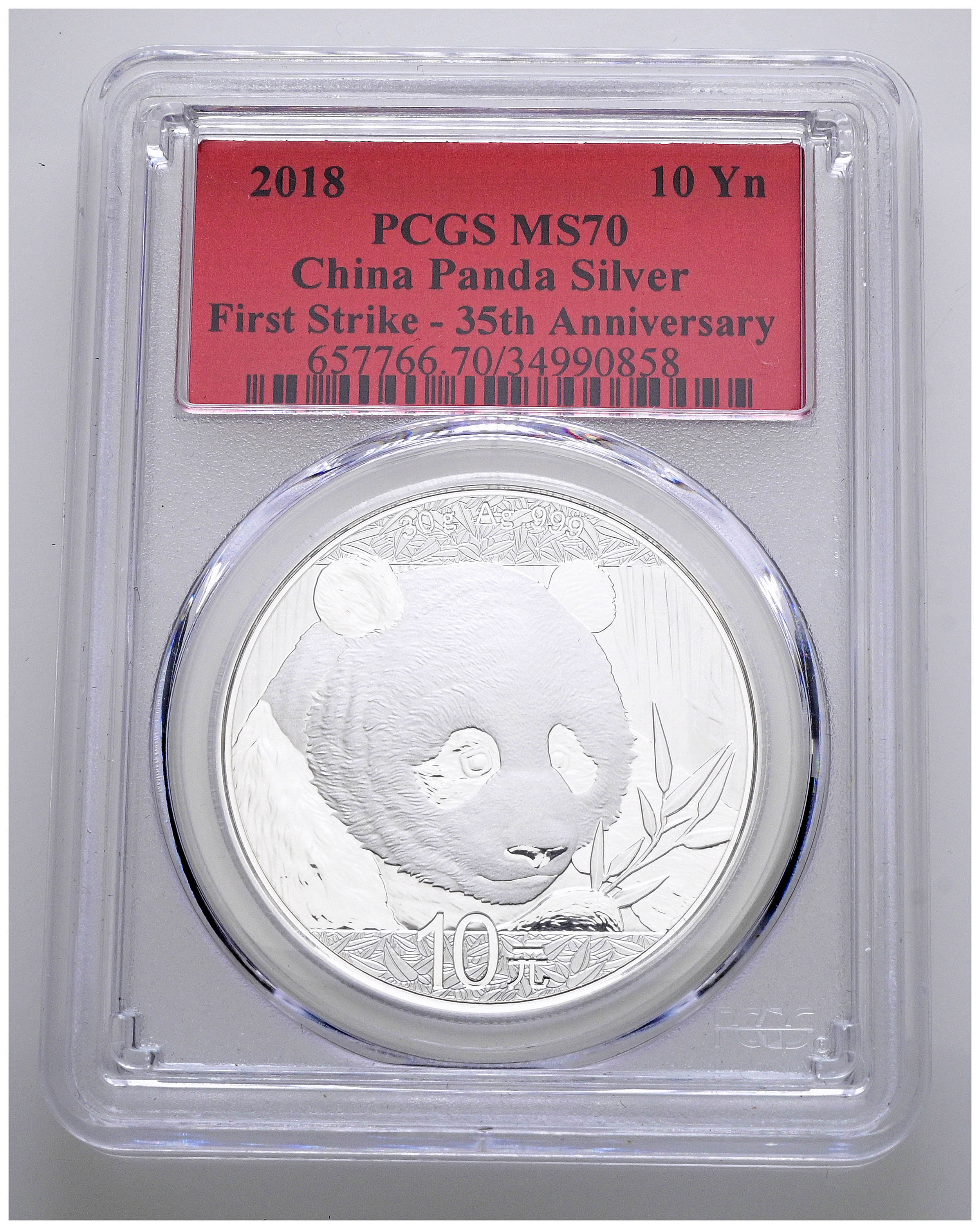 CHINA. 10 Yuan. (Ar. 30,00g/40mm)*. 2018. Serie Panda. First Strike-35 Anniversary. Encapsulado por PCGS MS 70. *Peso y medidas teóricos.