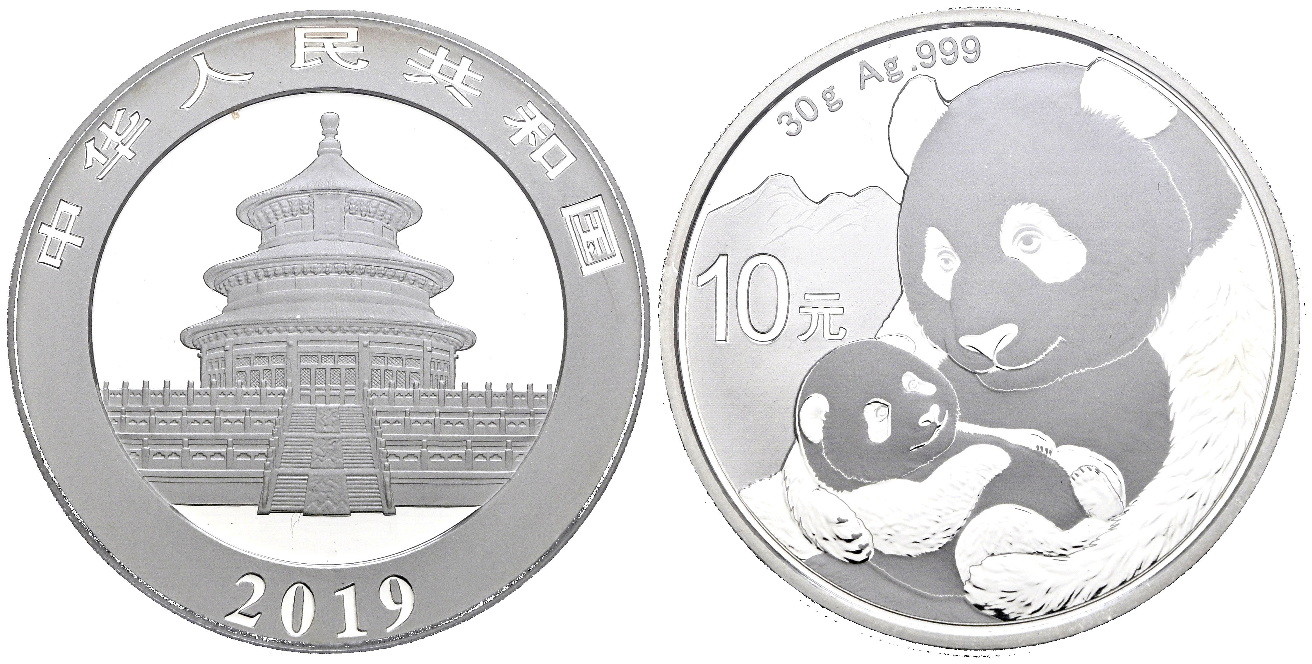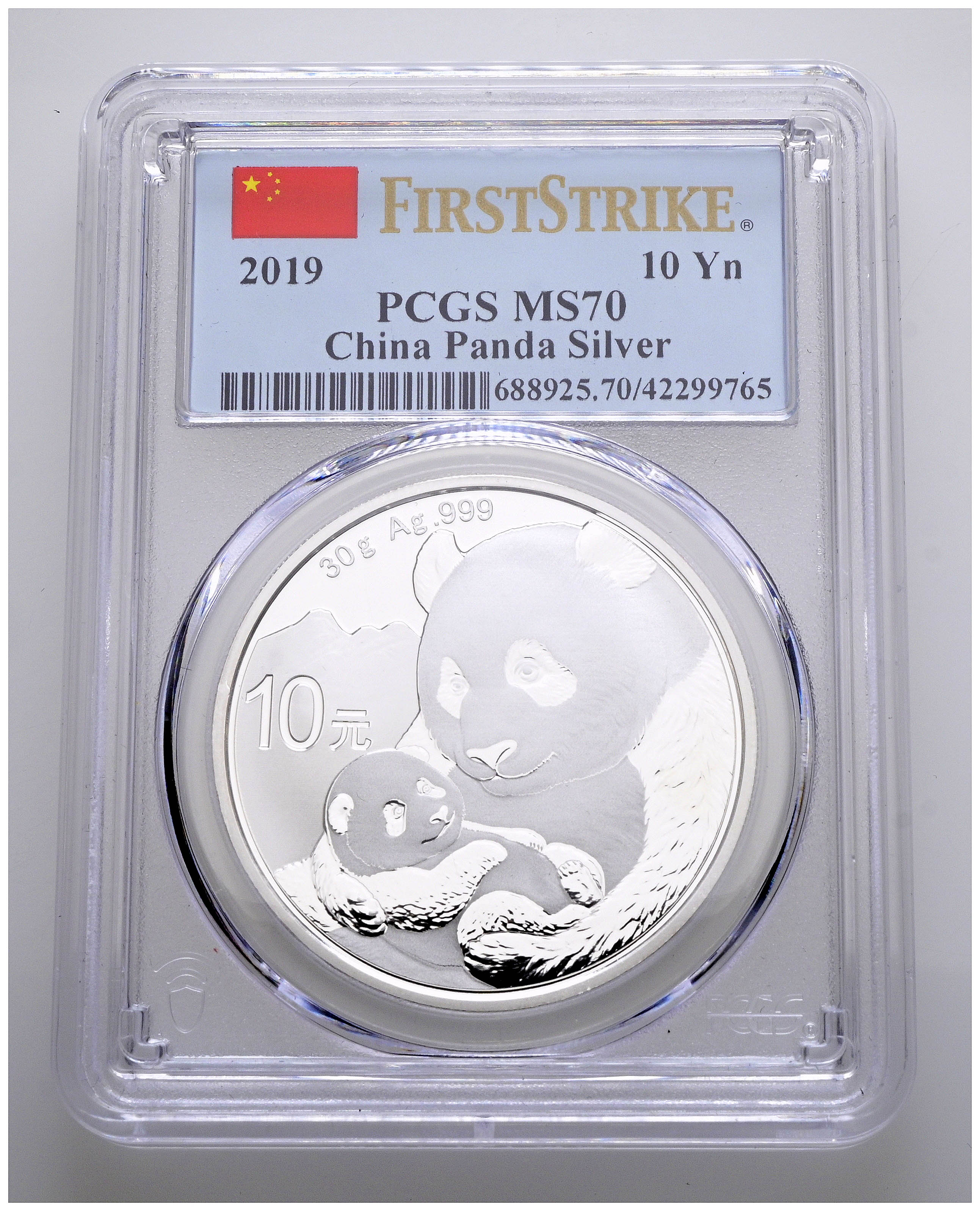 CHINA. 10 Yuan. (Ar. 30,00g/40mm)*. 2019. Serie Panda. First Strike. Encapsulado por PCGS MS 70. *Peso y medidas teóricos.