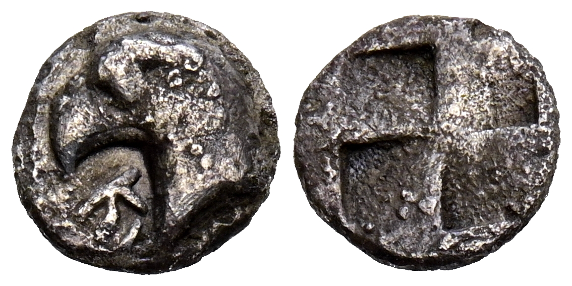 AEOLIS, Kyme. Hemióbolo. (Ar. 0,44g/8mm). 450-400 a.C. (SNG von Aulock 1623; SNG Copenhagen 31-3). Anv: Cabeza de águila a izquierda, delante K. Rev: Cuadrado incuso. MBC.