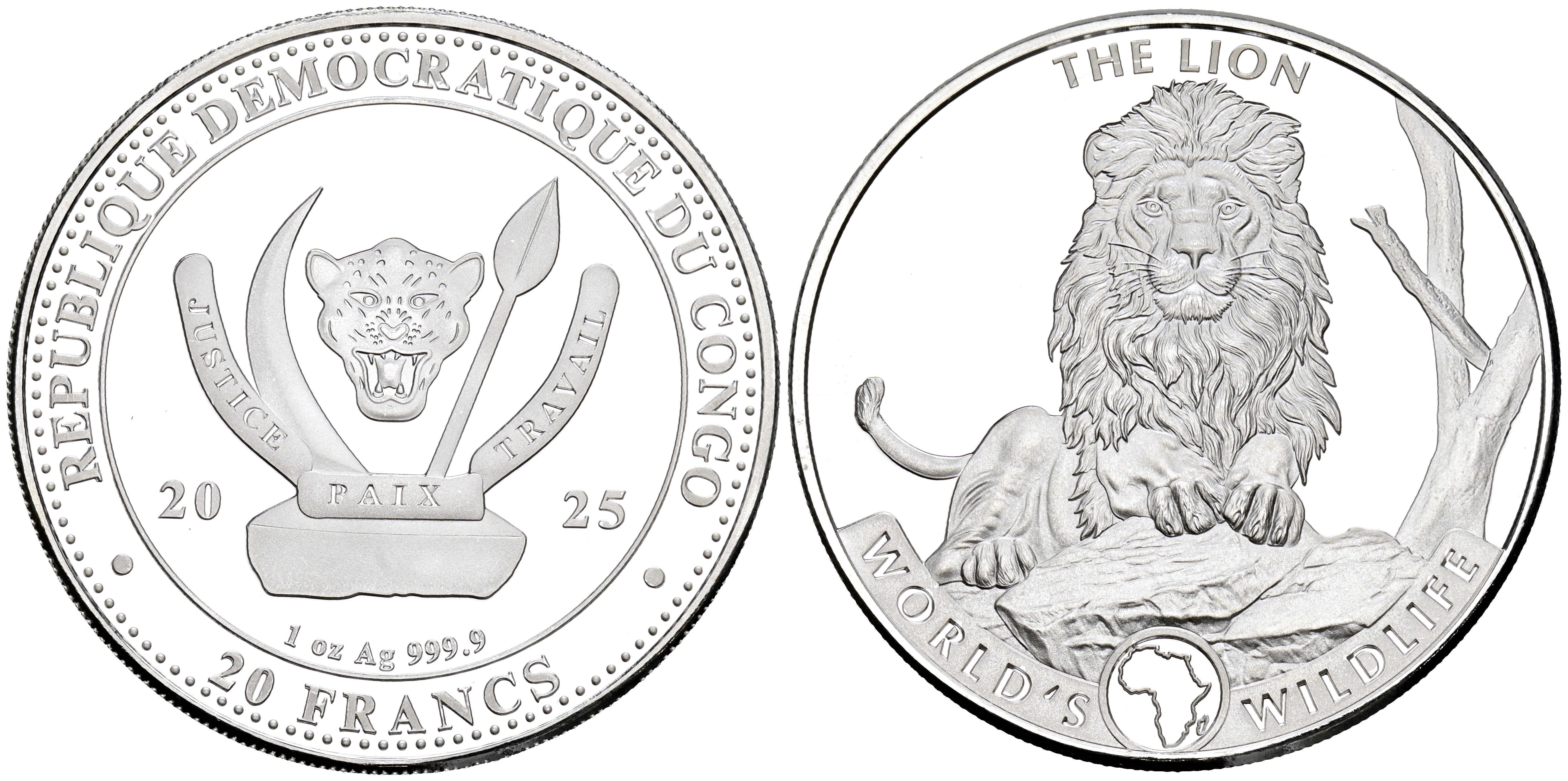 CONGO (REPÚBLICA DEMOCRÁTICA). 20 Francs (Ar. 31,10g/38mm). 2025. Serie Fauna mundial: León. (Km#417). PROOF.