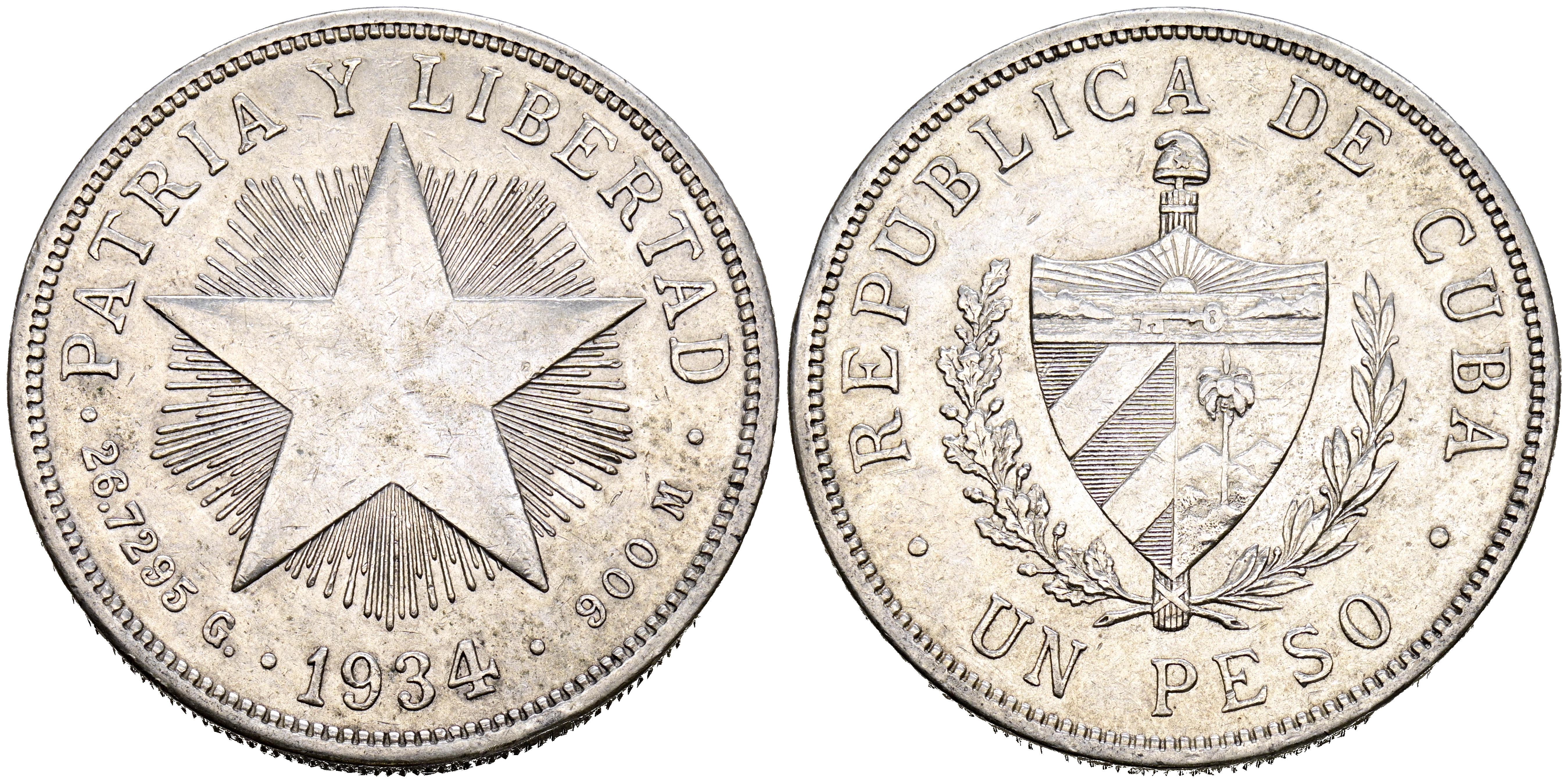 CUBA. 1 Peso. (Ar. 26,69g/38mm). 1934. (Km#15.2). MBC+.