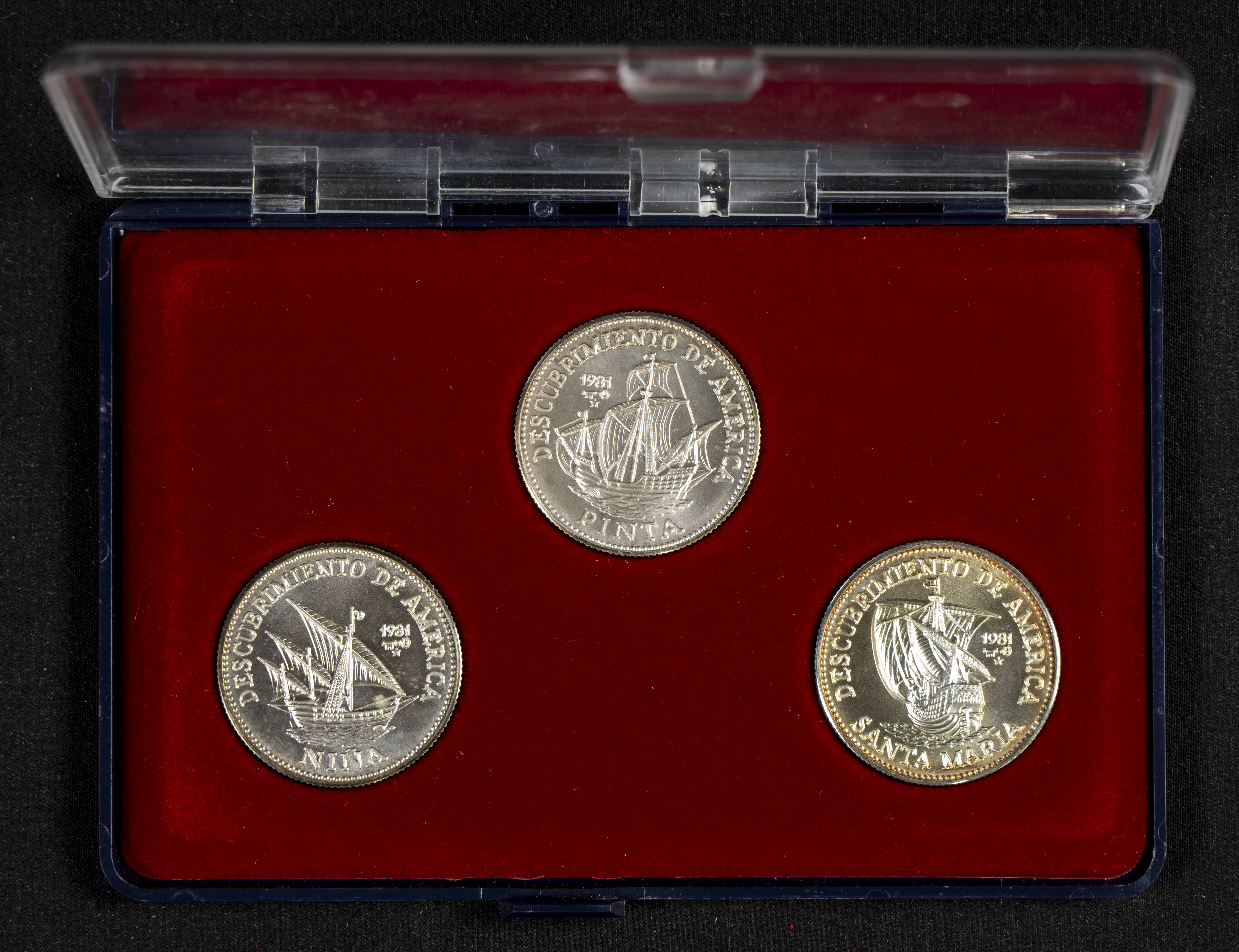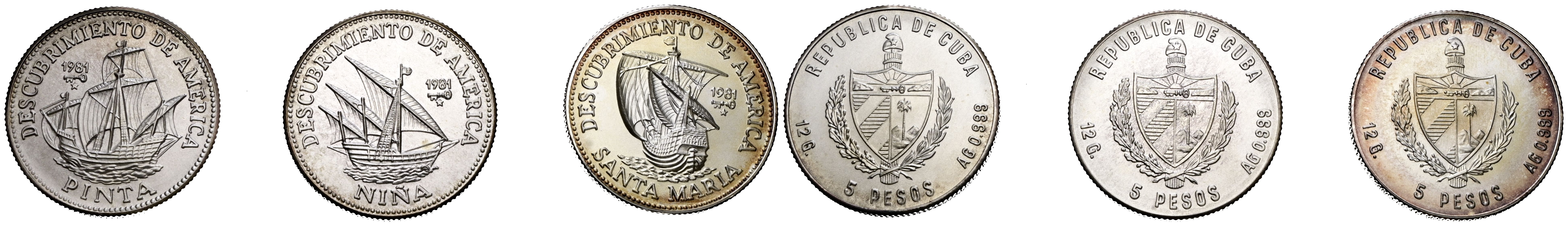 CUBA. Conjunto de 3 monedas en plata pura de 5 Pesos de 1981. Descubrimiento de América: Niña, Pinta y Santa María. SC. Presentadas en estuche.