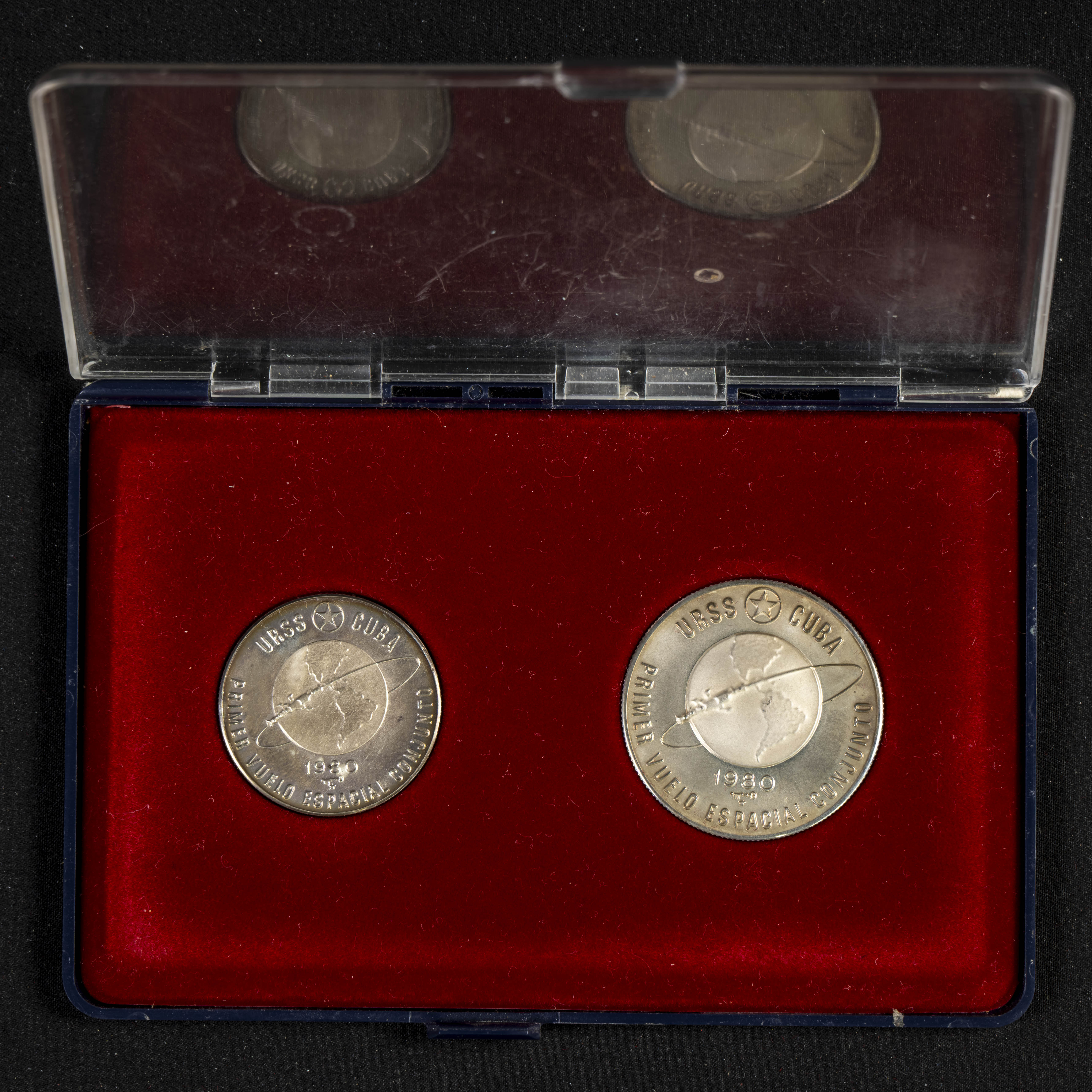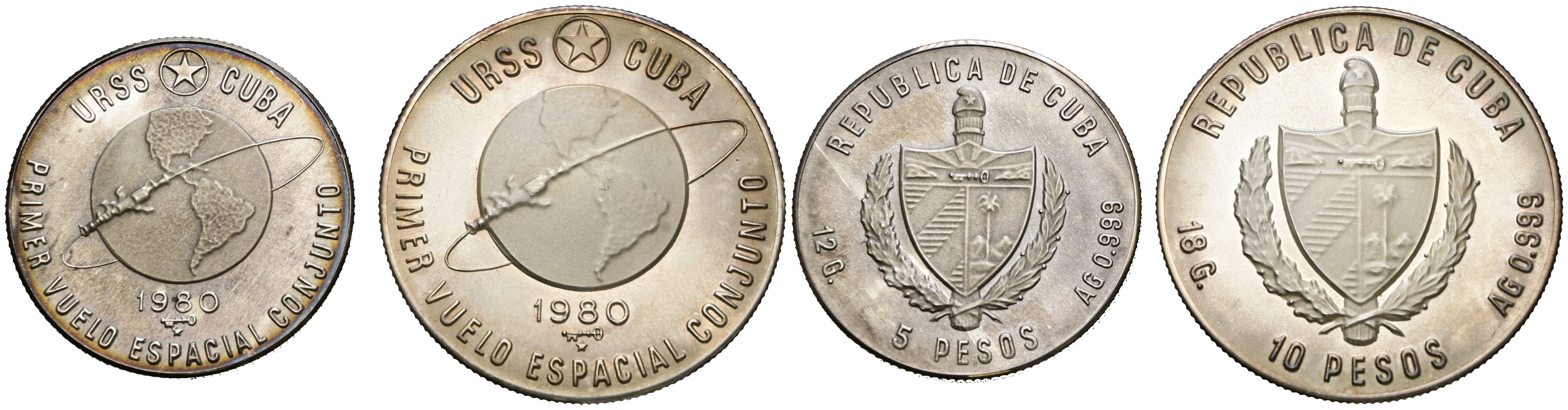 CUBA. Conjunto de 2 monedas de plata de 5 y 10 Pesos de 1980. Conmemoración del primer vuelo espacial conjunto Cuba & URSS. SC. Presentadas en estuche.
