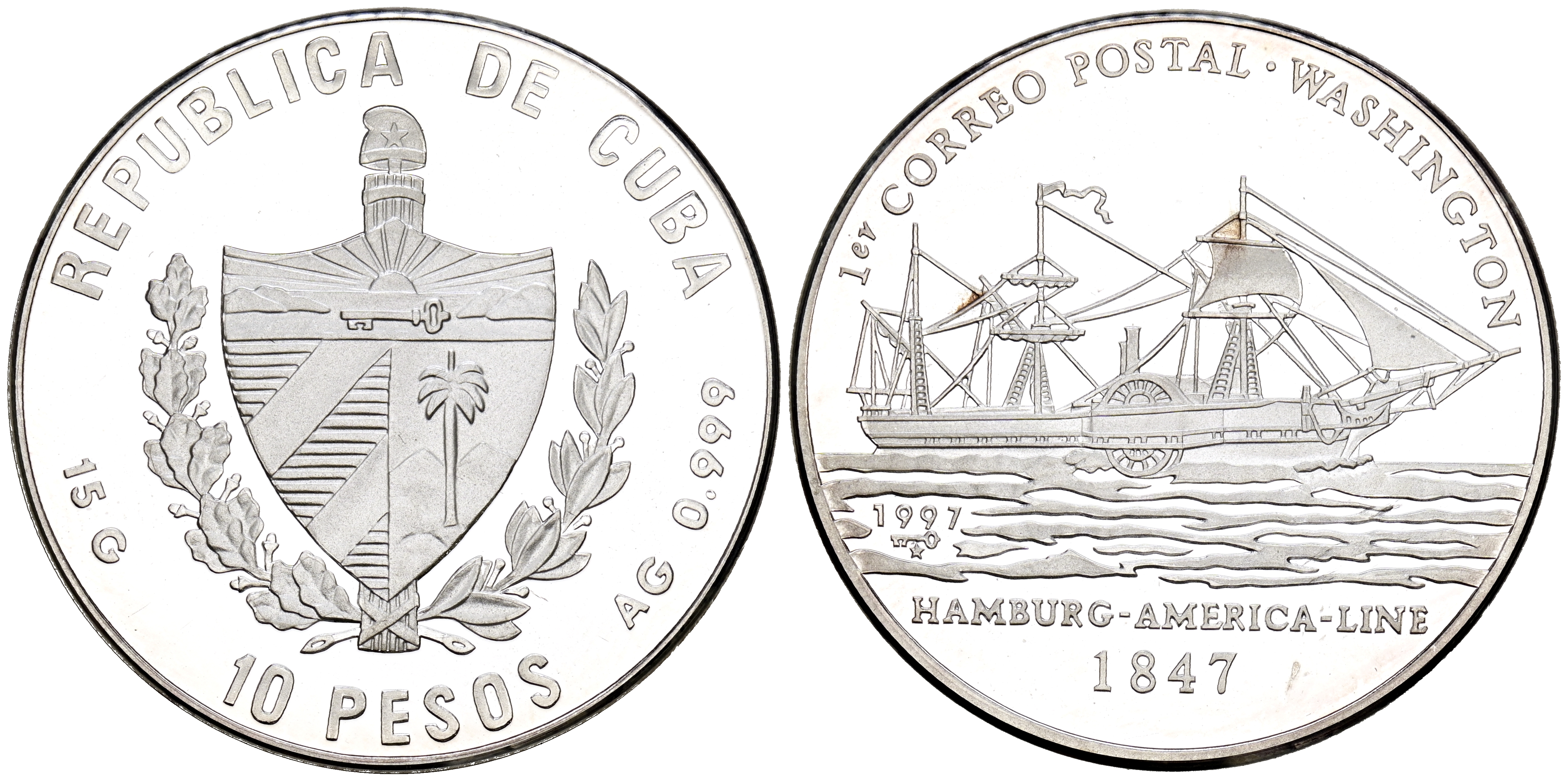 CUBA. 10 Pesos. (Ar. 14,92g/35mm). 1997. 150 Aniversario Primer Correo Postal. (Km#609). PROOF. Escasa.