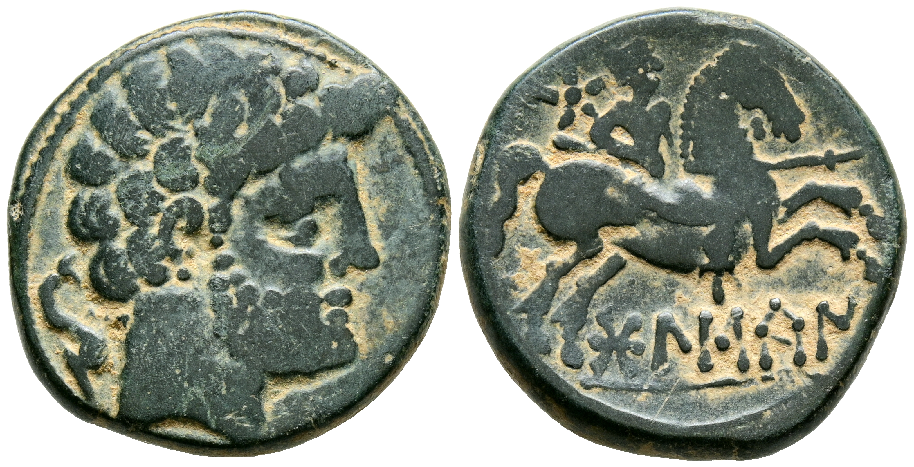 BOLSCAN (Huesca). As. (Ae. 7,72g/23mm). 180-20 a.C. (FAB-1918). Anv: Cabeza barbada masculina a derecha, detrás delfín. Rev: Jinete con lanza a derecha, encima estrella, debajo leyenda ibérica: BoLSCaN. MBC.
