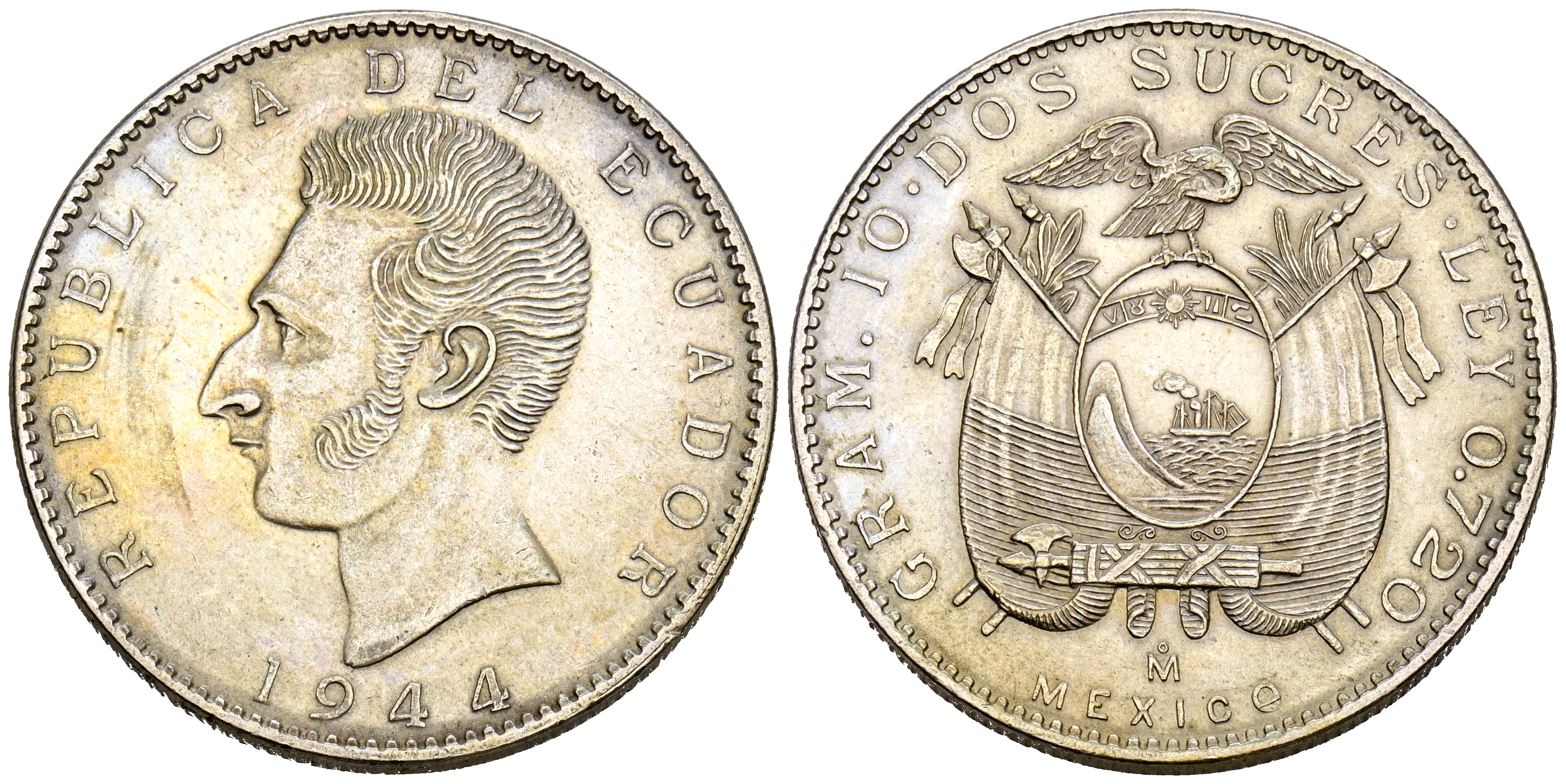 ECUADOR. 2 Sucres. (Ar. 9,93g/29mm). 1944. México. (Km#80). EBC.