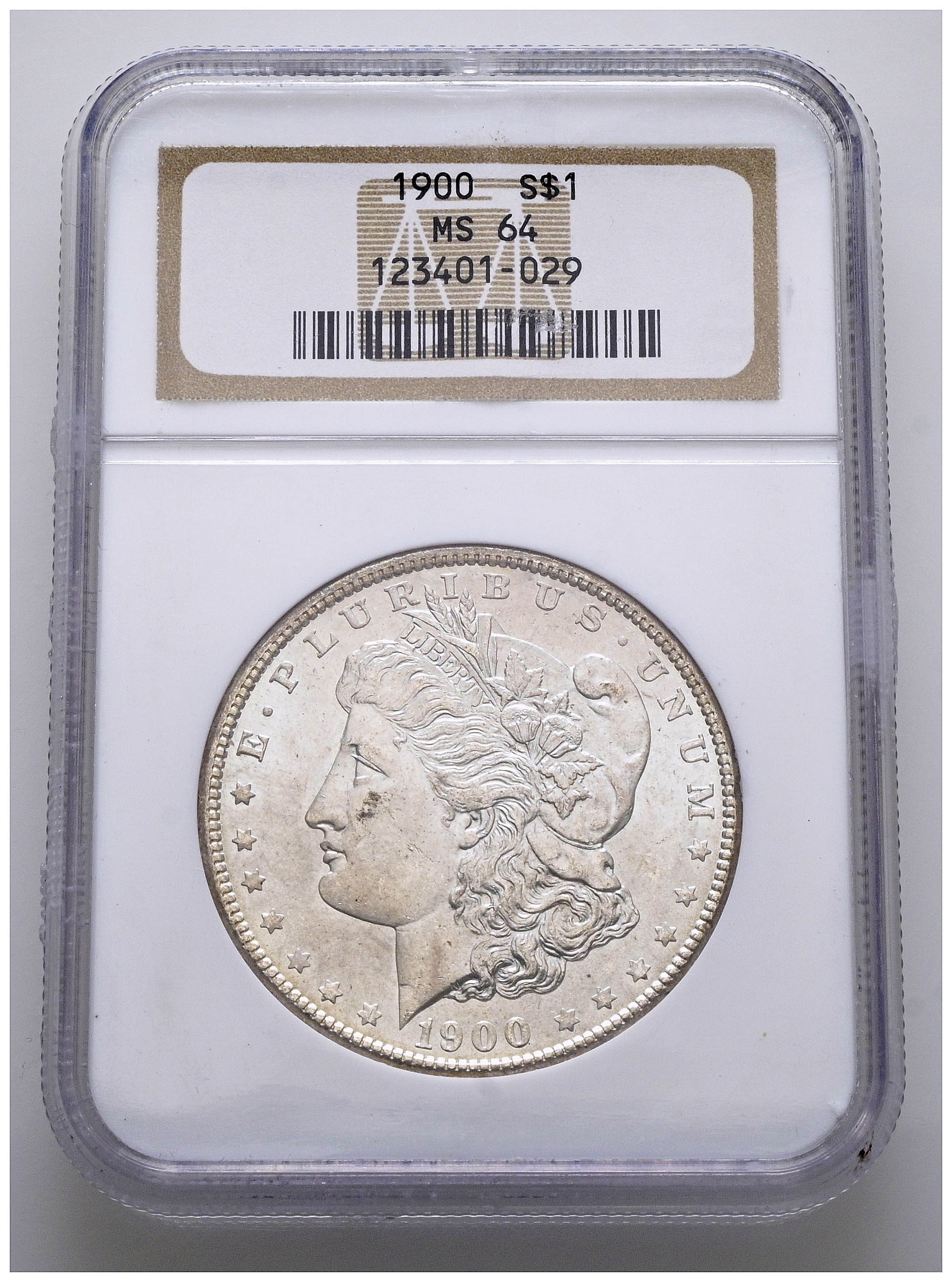 ESTADOS UNIDOS. 1 Dollar. (Ar. 27,00g/38mm)*. 1900. Philadelphia. (Km#110). Encapsulado por NGC MS 64. *Peso y medidas teóricos.
