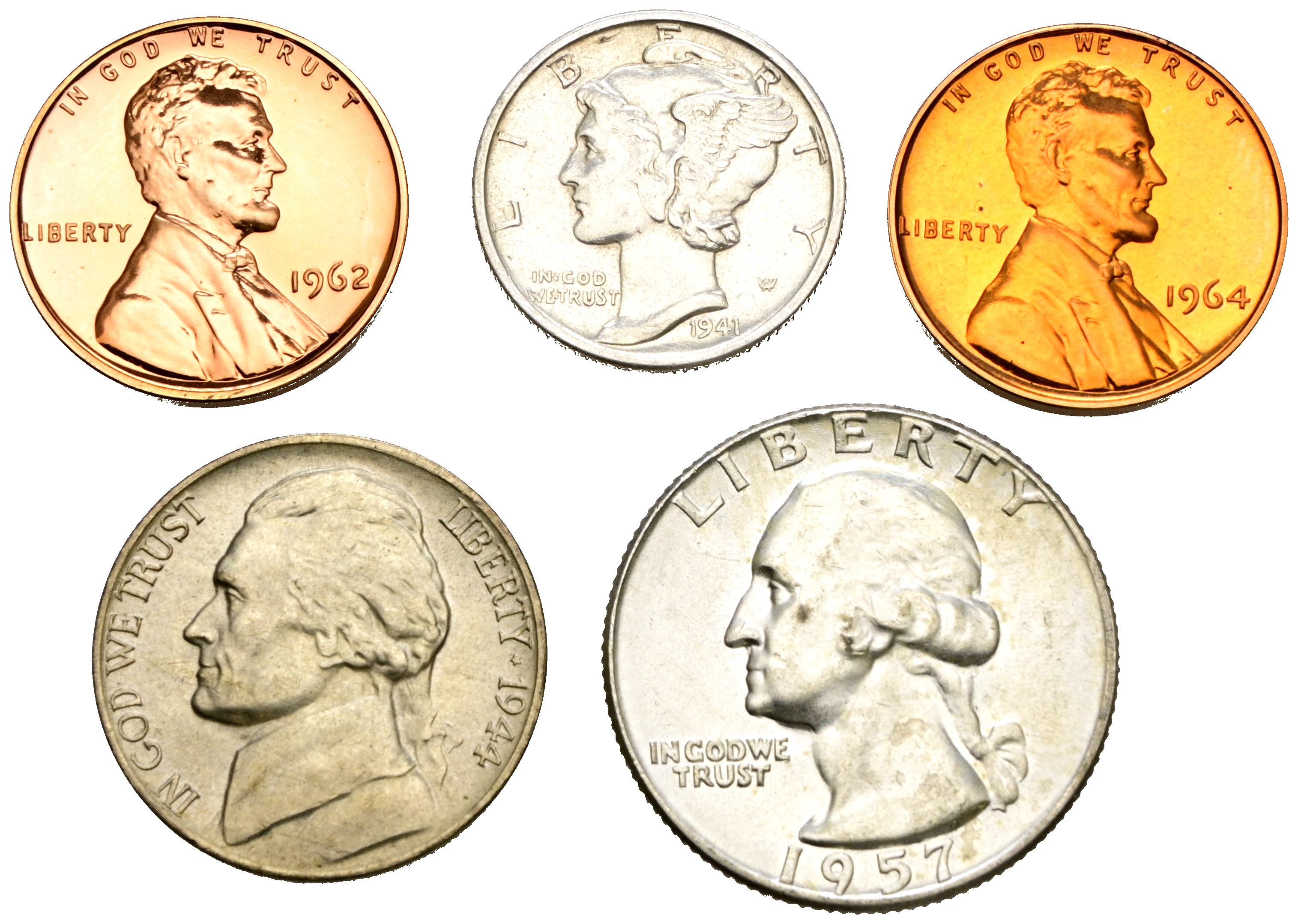 ESTADOS UNIDOS. Magnífico conjunto de 5 piezas diferentes acuñadas en el siglo XX con módulos de 1, 5, 25 Centavos y 1 Dime en altísima conservación general (EBC+/PROOF). A EXAMINAR.