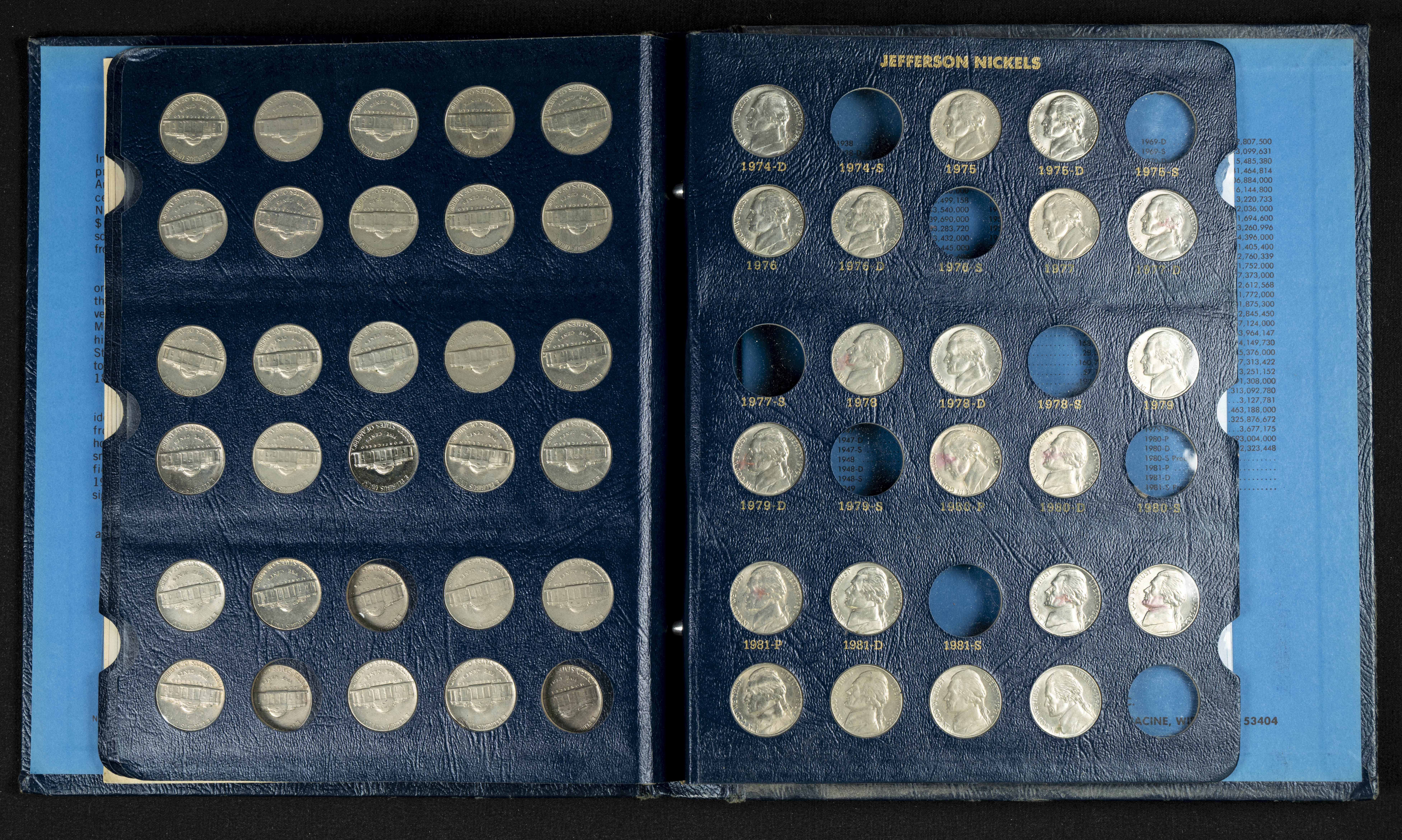 ESTADOS UNIDOS. Jefferson Nickel Collection. Álbum Whitman (no completo) con alrededor de 90 piezas de 5 Cents acuñados entre 1938 y 1981. Diferentes estados de conservación. A EXAMINAR.