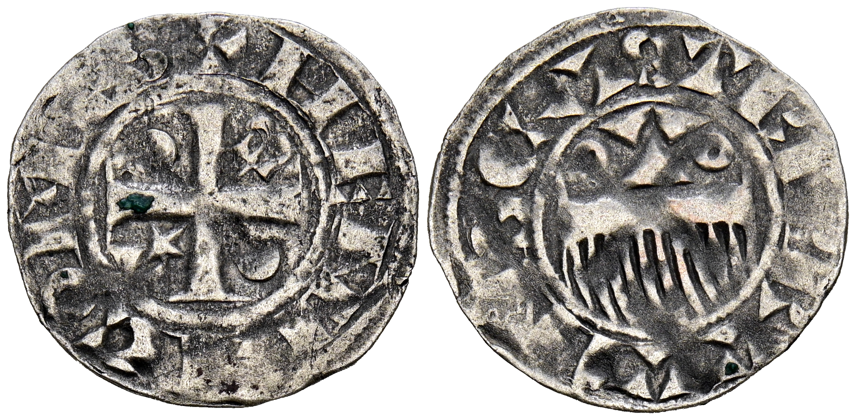 FRANCIA, Teobaldo II (1125-1152). Dinero. (Ar. 0,87g/19mm). Ciudad de Provins. (Provincia de Sens). (Metcalf 23, 588 s; Poey d'Avant 5971). Anv: Cruz patada, punto en 1º y 4º cuadrante, M y A en 2º y 3º, todo dentro de una gráfila circular, alrededor leyenda: TEBALT COMES. Rev: Y entre dos círculos sobre cresta, todo dentro de gráfila circular, alrededor leyenda: CASTRI PRVVINS. MBC-.