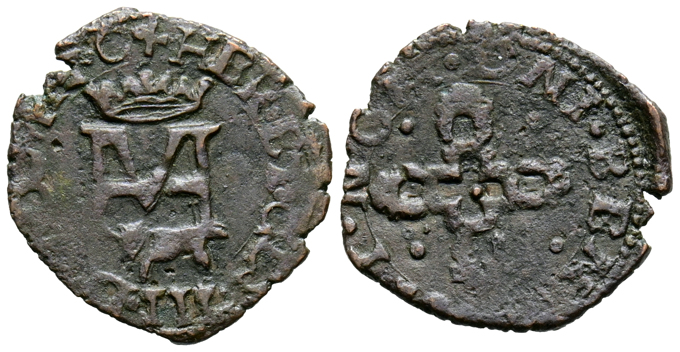 FRANCIA, Enrique III y Margarita de Valois (1527-1589). Liard. (Ve. 0,82g/16mm). Bearn (Navarra francesa). (SCMF. 5860). Anv: Monograma coronado formado por H y M, alrededor leyenda. Rev: Cruz, alrededor leyenda. MBC-.