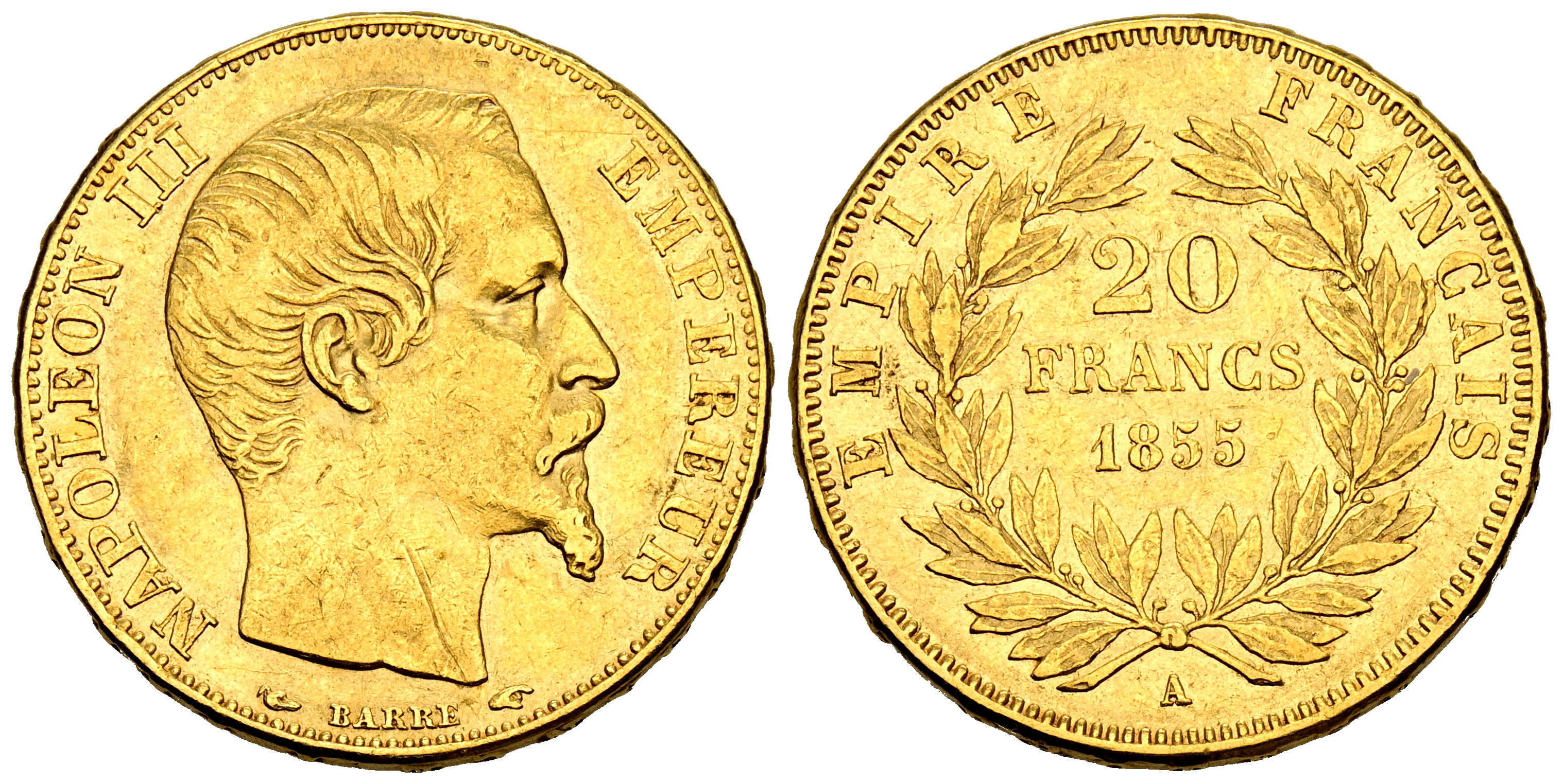 FRANCIA, Napoleón III (1852-1870). 20 Francos. (Au. 6,39g/21mm). 1855. París A. (Km#781.1). MBC.