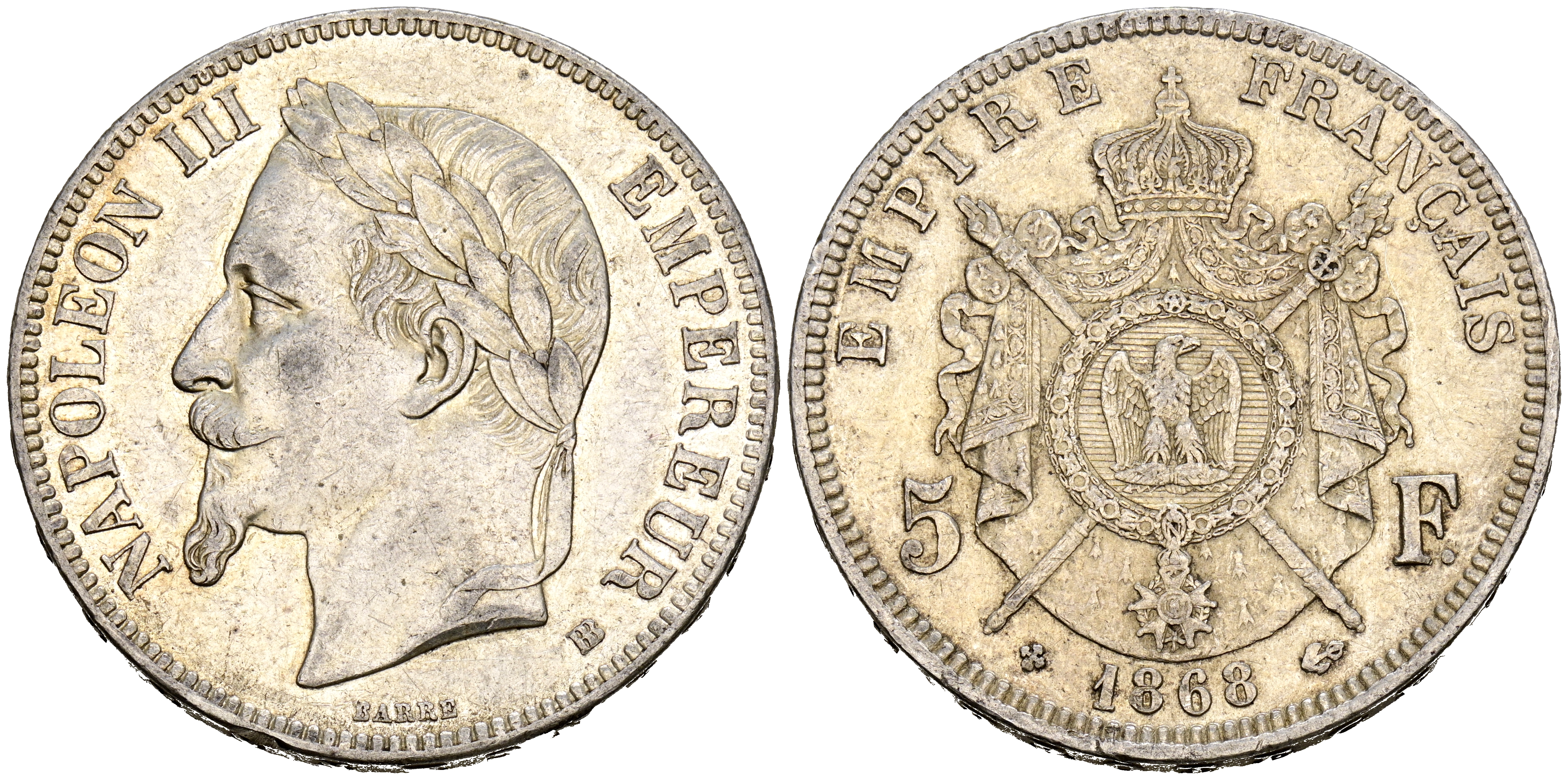 FRANCIA, Napoleón III. 5 Francs. (Ar. 24,94g/37mm). 1868. Estrasburgo BB. (Km#799.2). MBC+.