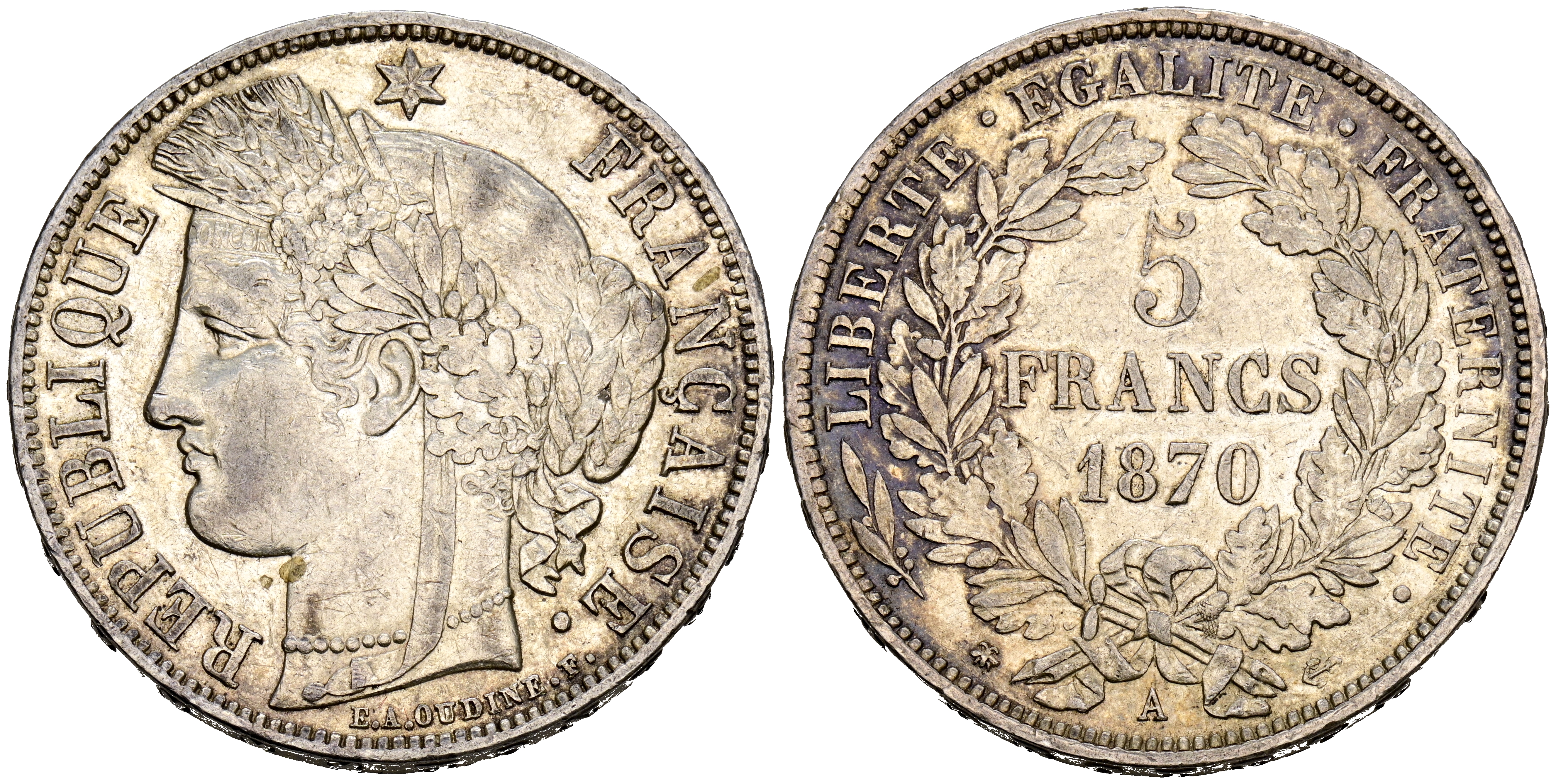 FRANCIA. 5 Francs. (Ar. 24,93g/37mm). 1870. Paris A. (Km#819). MBC+.