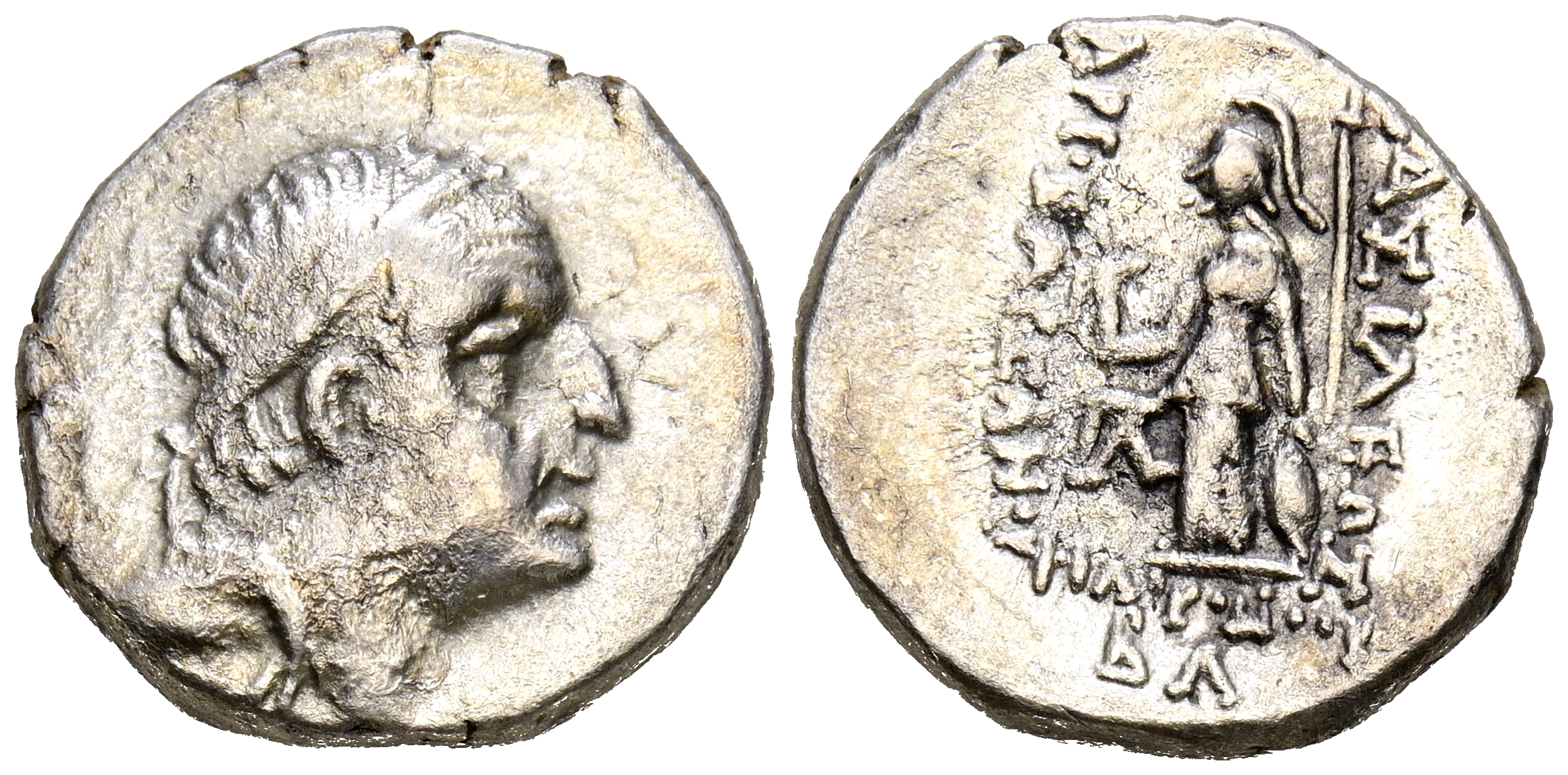 REYES DE CAPADOCIA, Ariobarzanes I Philoromaios. Dracma. (Ar. 4,06g/16mm). 95-63 a.C. Eusebia. (Simonetta 45a; HGC 7, 846). Anv: Cabeza diademada a derecha. Rev: Atenas estante a izquierda portando Nike, lanza y escudo, delante monograma: ΓA, alreded or leyenda griega: ΒΑΣΙΛΕΩΣ ΑΡΙΟΒΑΡΖAΝOY ΦΙΛΟΡΩΜΑΙOY. MBC. Limpieda.