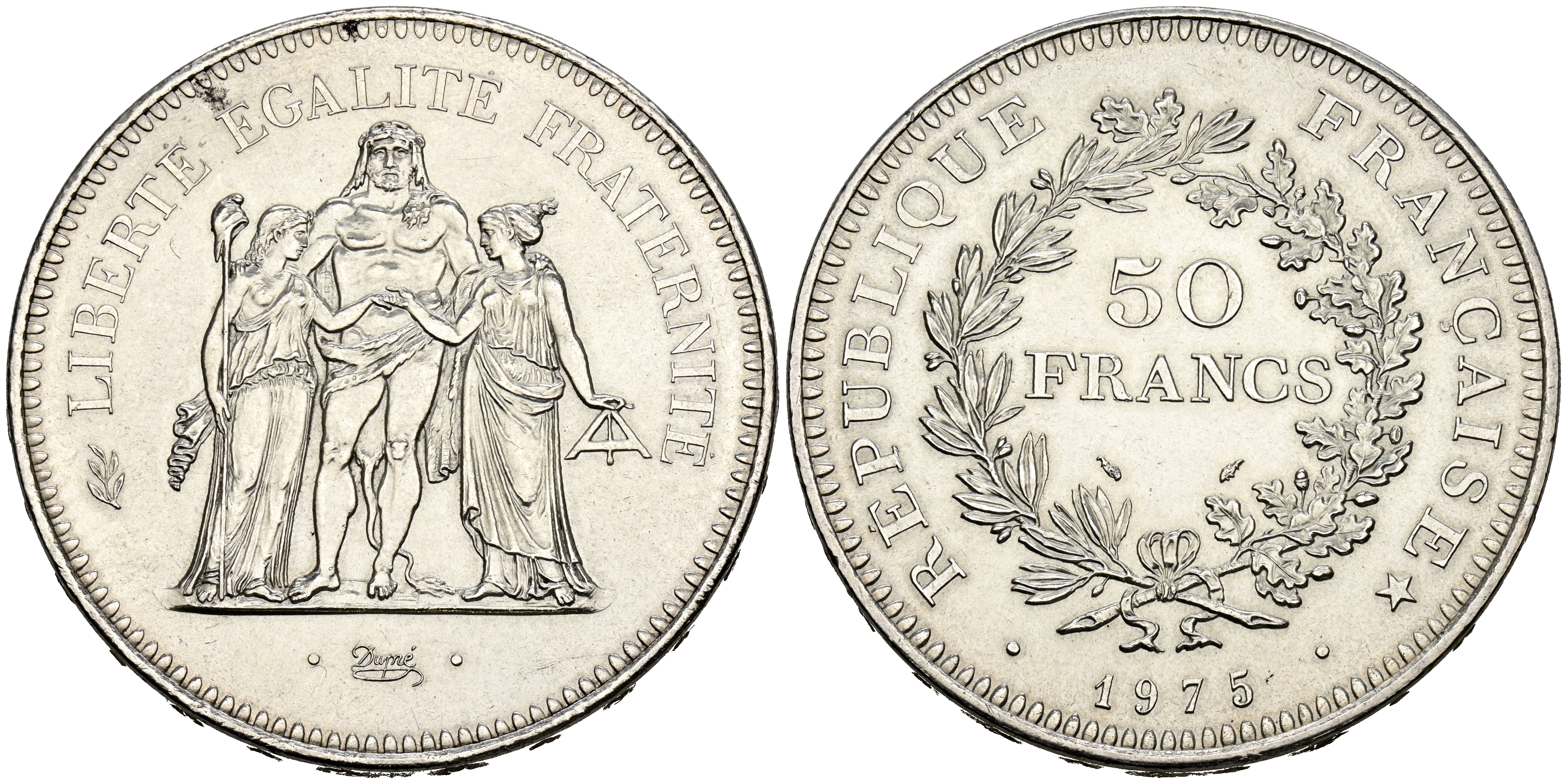 FRANCIA. 50 Francs. (Ar. 30,02g/41mm). 1975. Hércules. (Km#941). EBC-.
