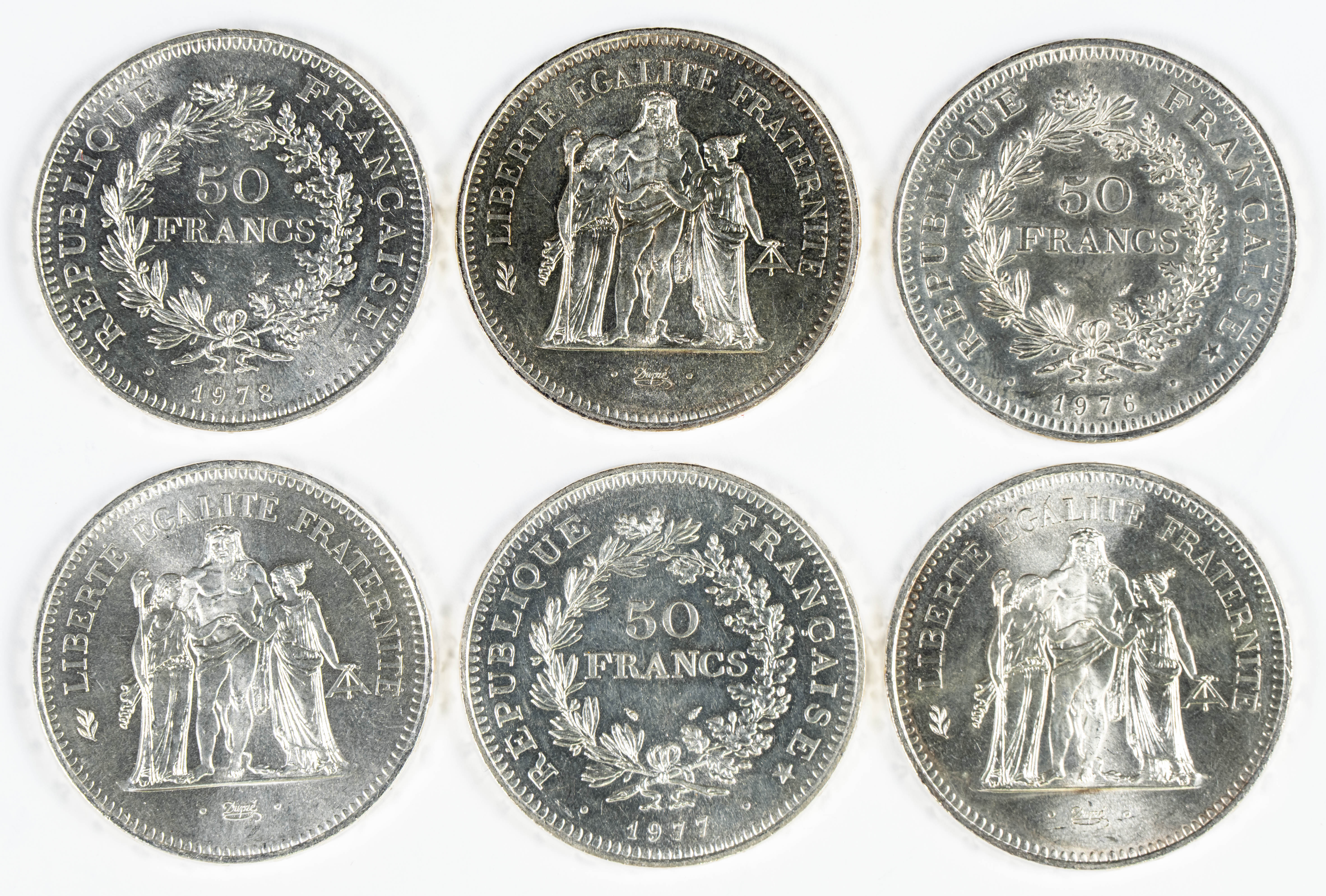 FRANCIA. Excelente conjunto de 6 monedas de 50 Francs, tipo Hércules, acuñadas entre 1974 y 1979. Sin piezas repetidas. Excelente estado de conservación general. A EXAMINAR.