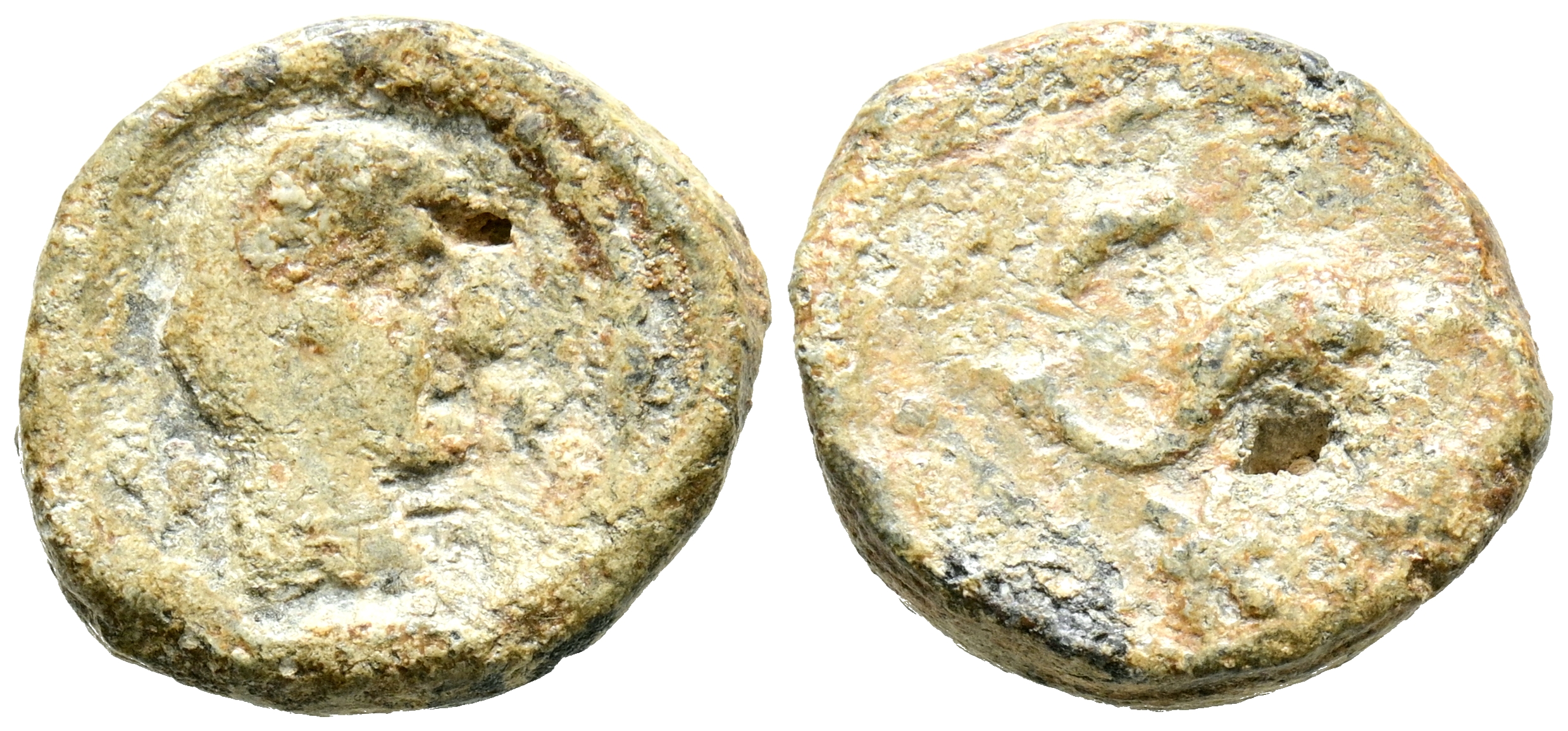 ¿BOLSCAN (Huesca)?. Plomo monetiforme. (Pb. 5,57g/17mm). (CCP no cita). Anv: Cabeza masculina a derecha. Rev: Delfín a derecha, encima creciente, debajo letras ibéricas: BoN. MBC. Perforación. Muy raro.