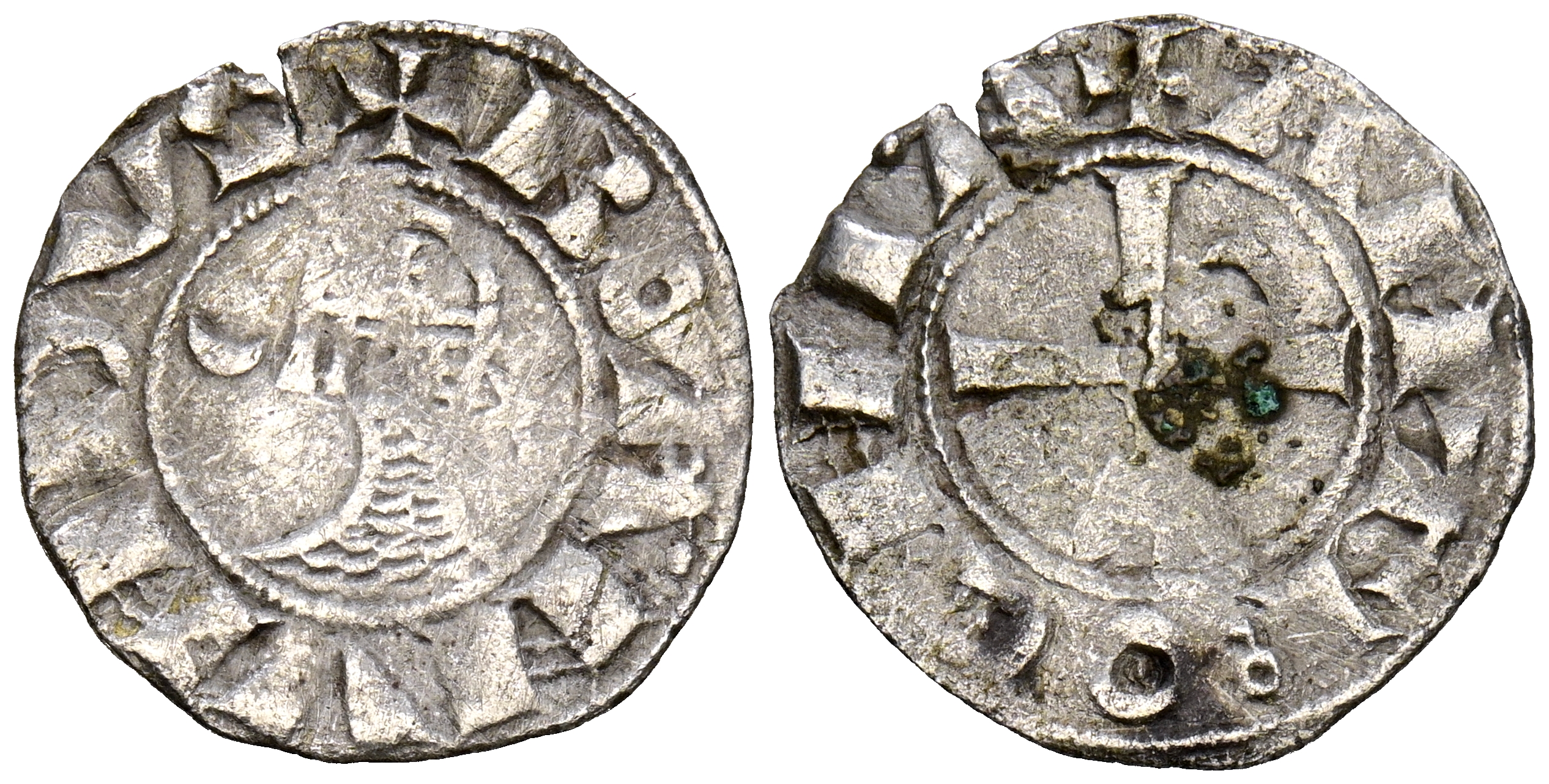 CRUZADOS, Bohemundo III. Dinero. (1163-1201). (Ve. 0,84g/18mm). Antioquía. (Schlumberger III, 4). Anv: Busto armado de Bohemundo III a izquierda, en campo creciente y estrella, todo dentro de gráfilar circular, alrededor leyenda: BOAMUNDUS. Rev: Cruz patada con creciente en el 3º cuadrante, todo dentro de gráfilar circular, alrededor leyenda: ANTIOCHIA MBC.