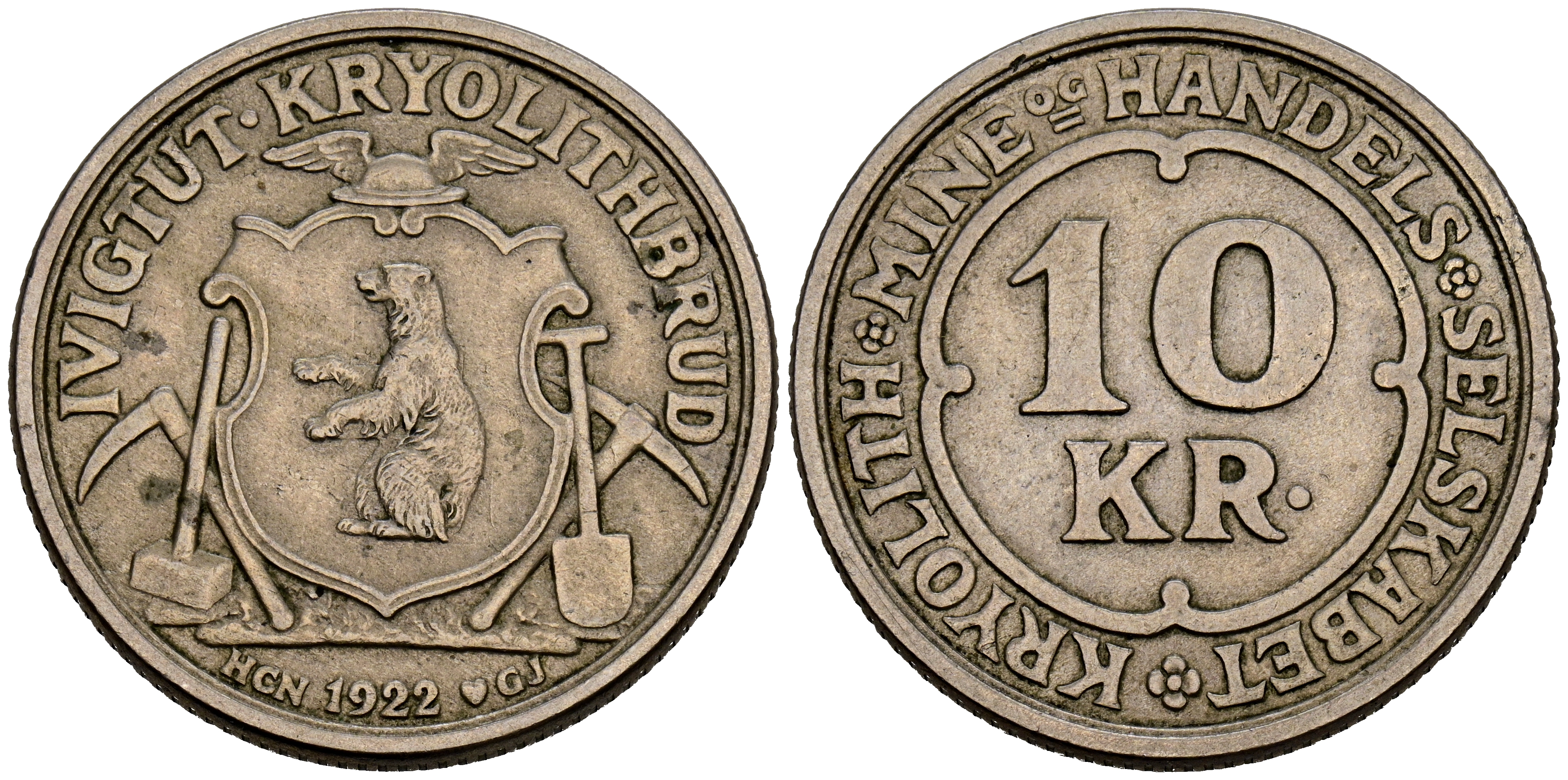 GROENLANDIA. 10 Kroner. (Ae-Ni. 11,76g/31mm). 1922. Considerado token y emitidas por la Cryolite Mining and Trade Company para transacciones dentro la colonia minera. (Km#Tn49). MBC+. Escasa.