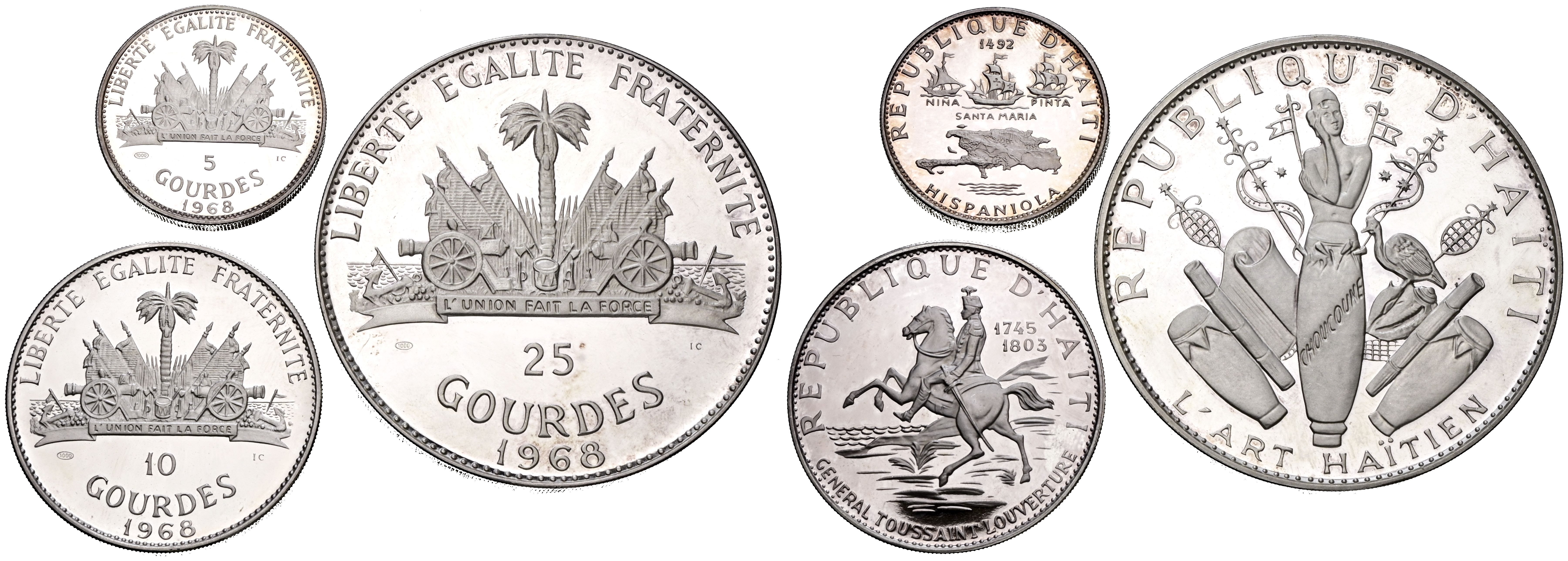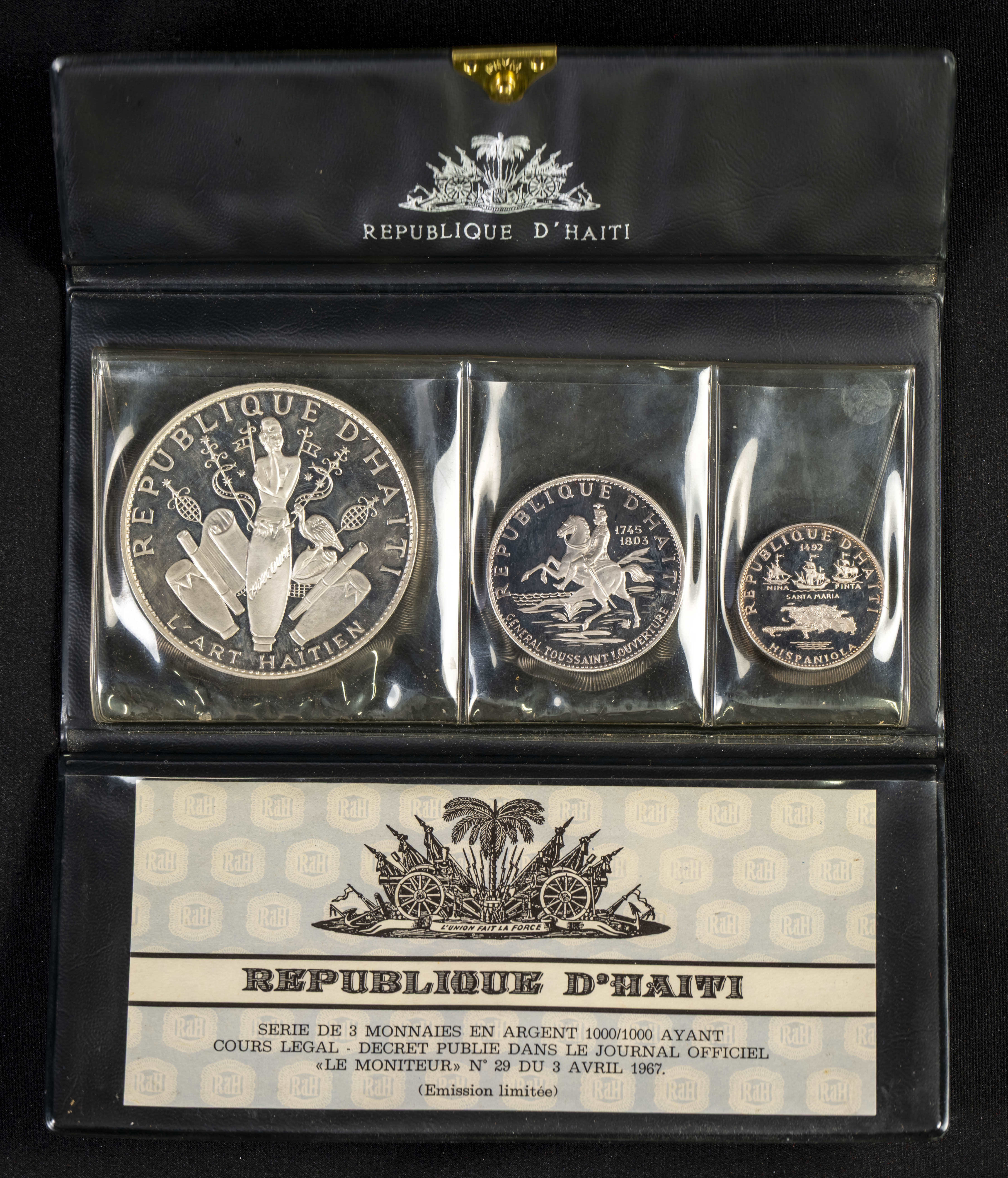 HAITÍ. Set conmemorativo de 1968. 3 monedas en plata pura con valores de 5, 10 y 25 Gourdes. PROOF. Peso total del conjunto en plata: 187g. Incluye certificado de autenticidad.