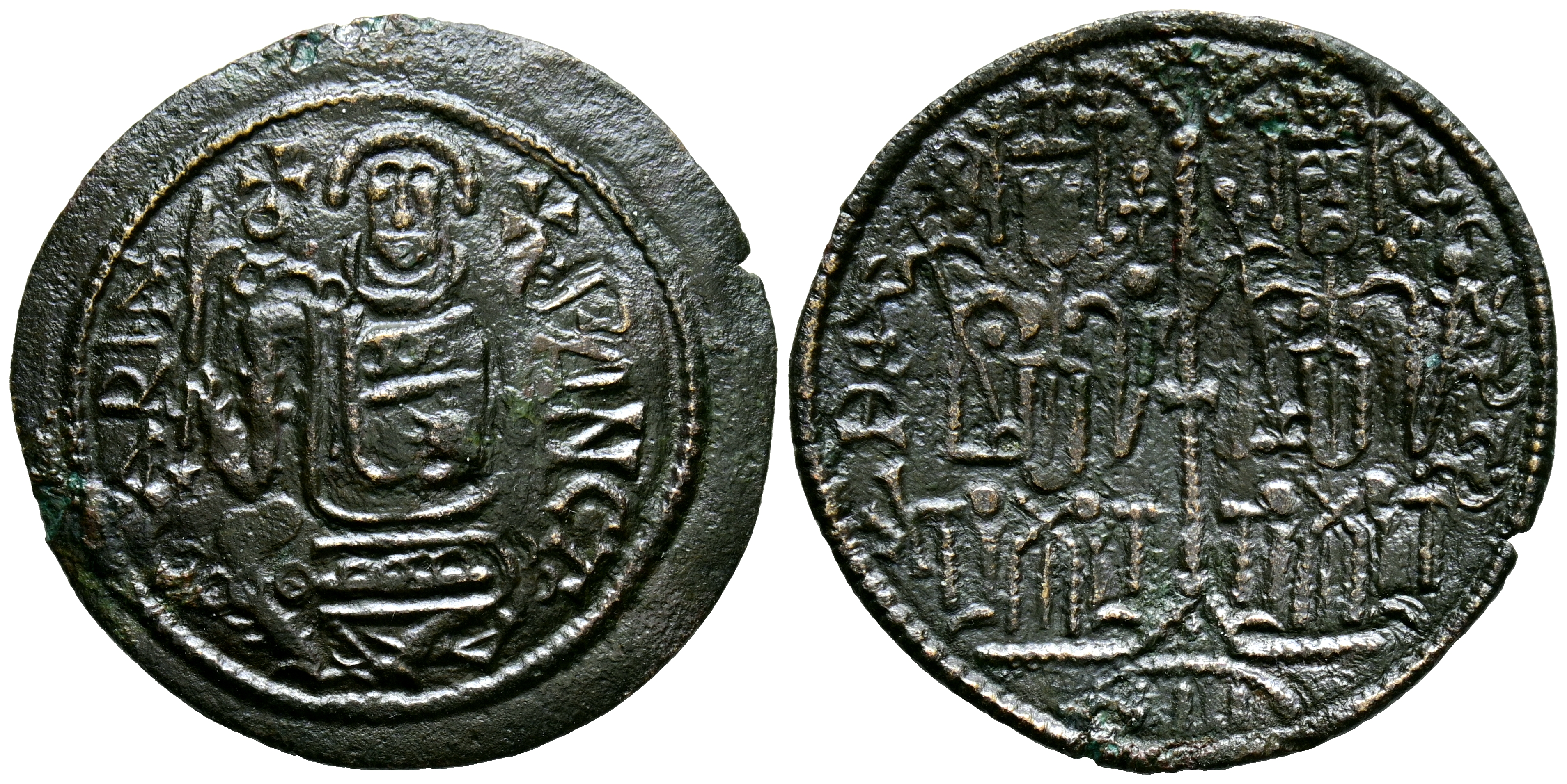 HUNGRIA, Bela III. Follis, tipo Trachy (cóncavo). (Ae. 2,91g/27mm). 1172-1196. (CAC 16.15). Anv: Virgen sentada de frente sosteniendo cetro y Niño, alrededor leyenda. Rev: Los reyes Béla y Esteban entronizados, entre ellos una cruz de palo largo. MBC+. Bonito ejemplar.
