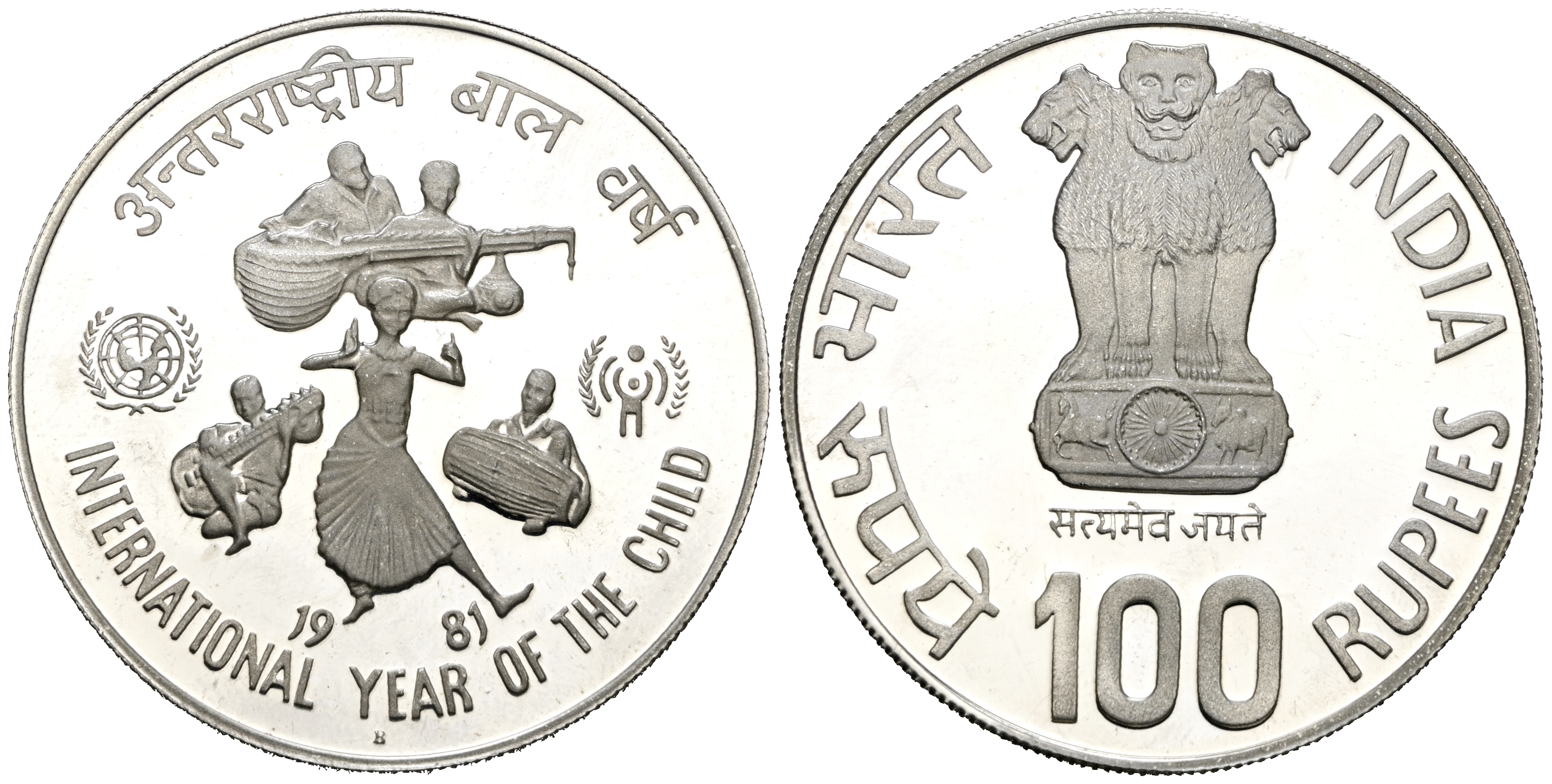 INDIA. 100 Rupias. (Ar. 29,44g/44mm). 1981. Año Internacional del Niño. (Km#277). PROOF. Leves rayitas. Escasa.
