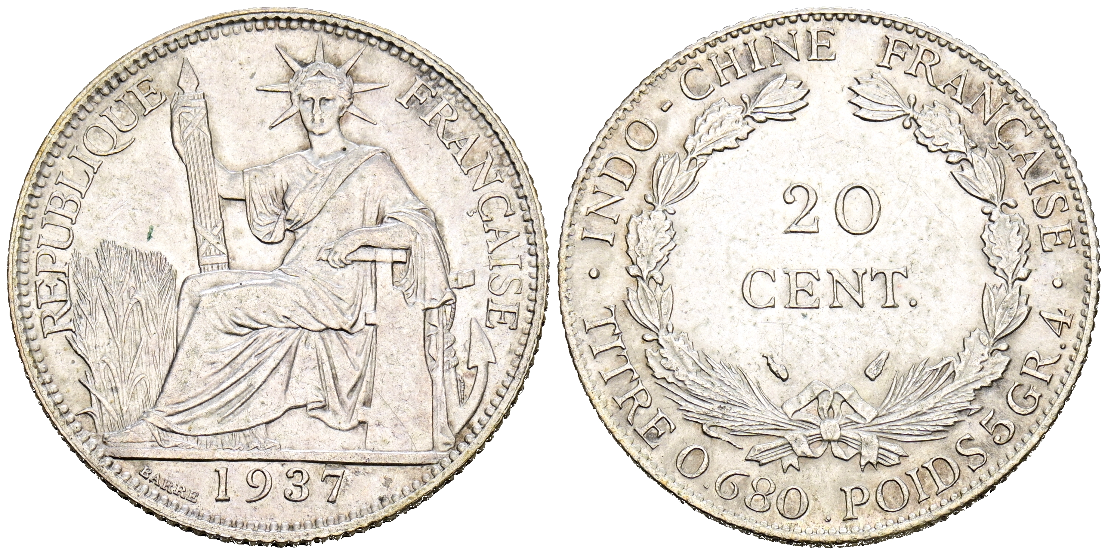 INDOCHINA (Francesa). 20 Cent (Ar. 5,39g/21mm). 1937. (Km#17.2). EBC-.