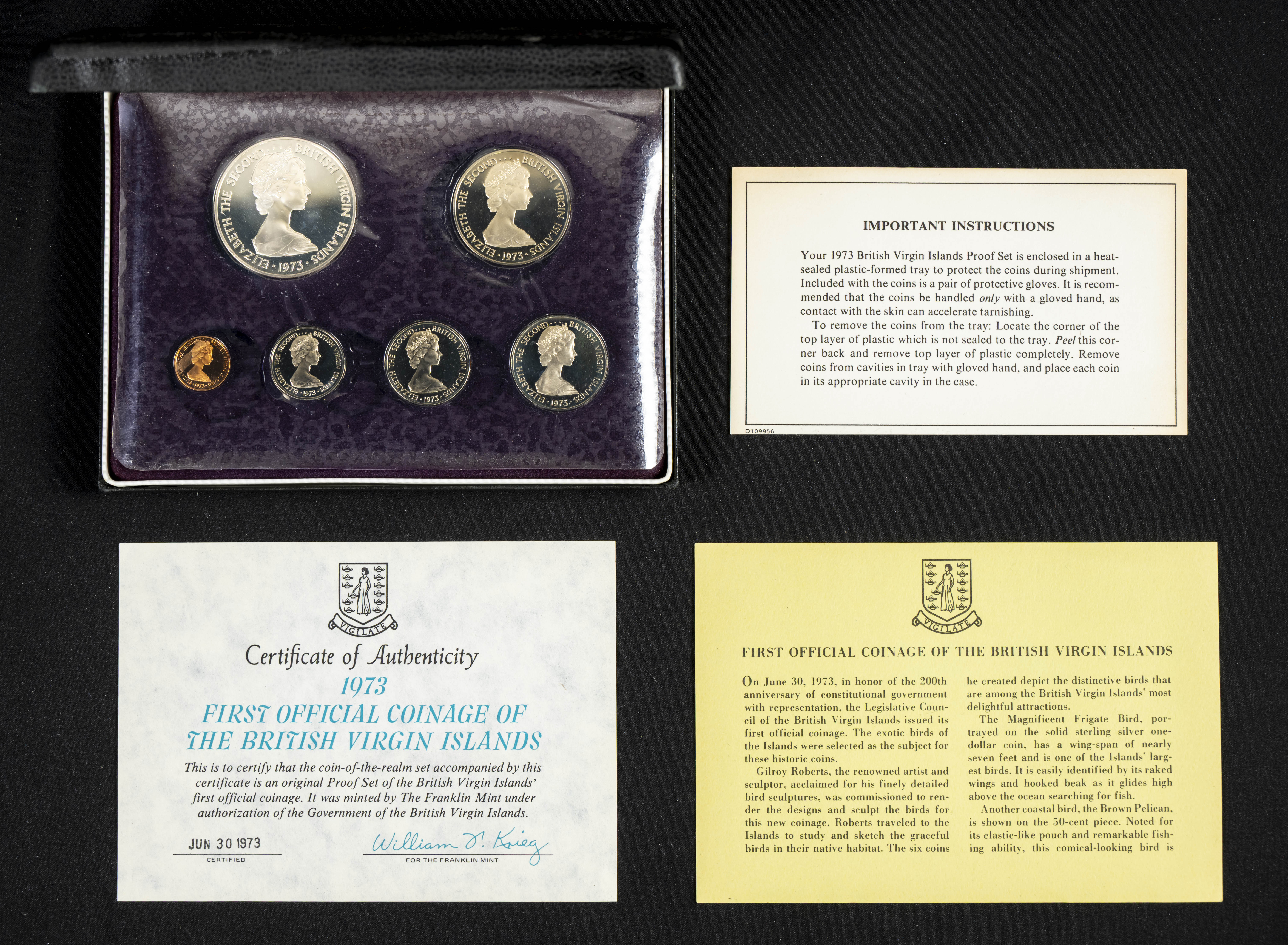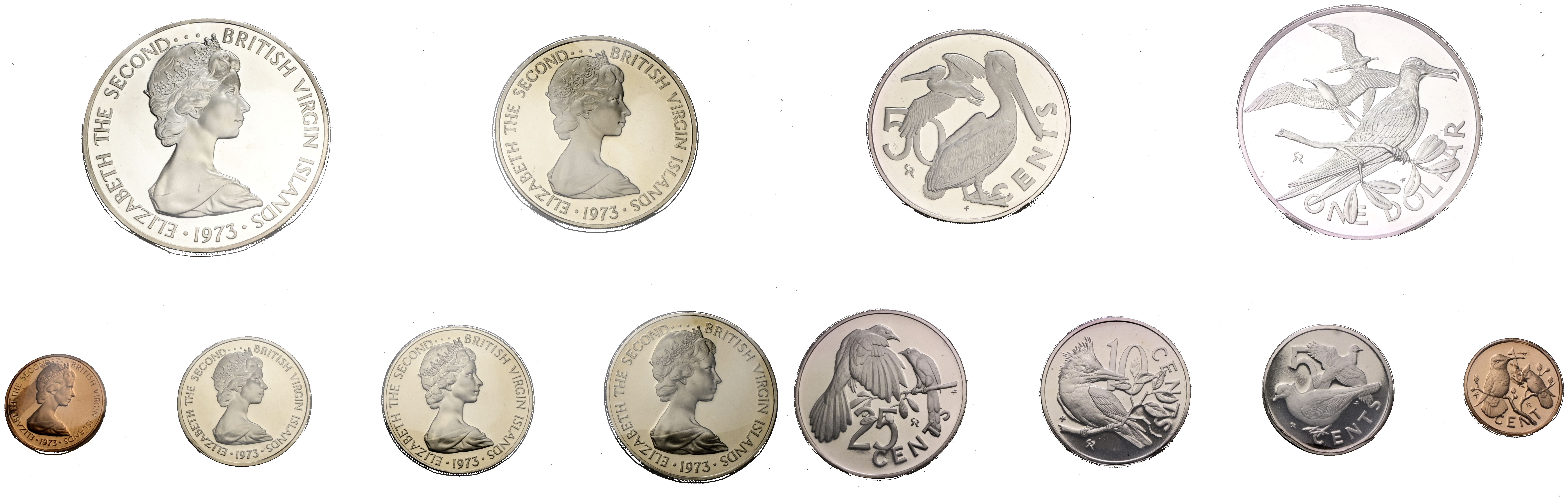 ISLAS VÍRGENES. Set completo y oficial de 1973 formado por 6 monedas. Valores comprendidos entre 1 Cent y 1 Dollar. Acuñado por The Franklin Mint. PROOF. Incluye estuche (monedas en blister sin sacar) y certificado de auntenticidad.