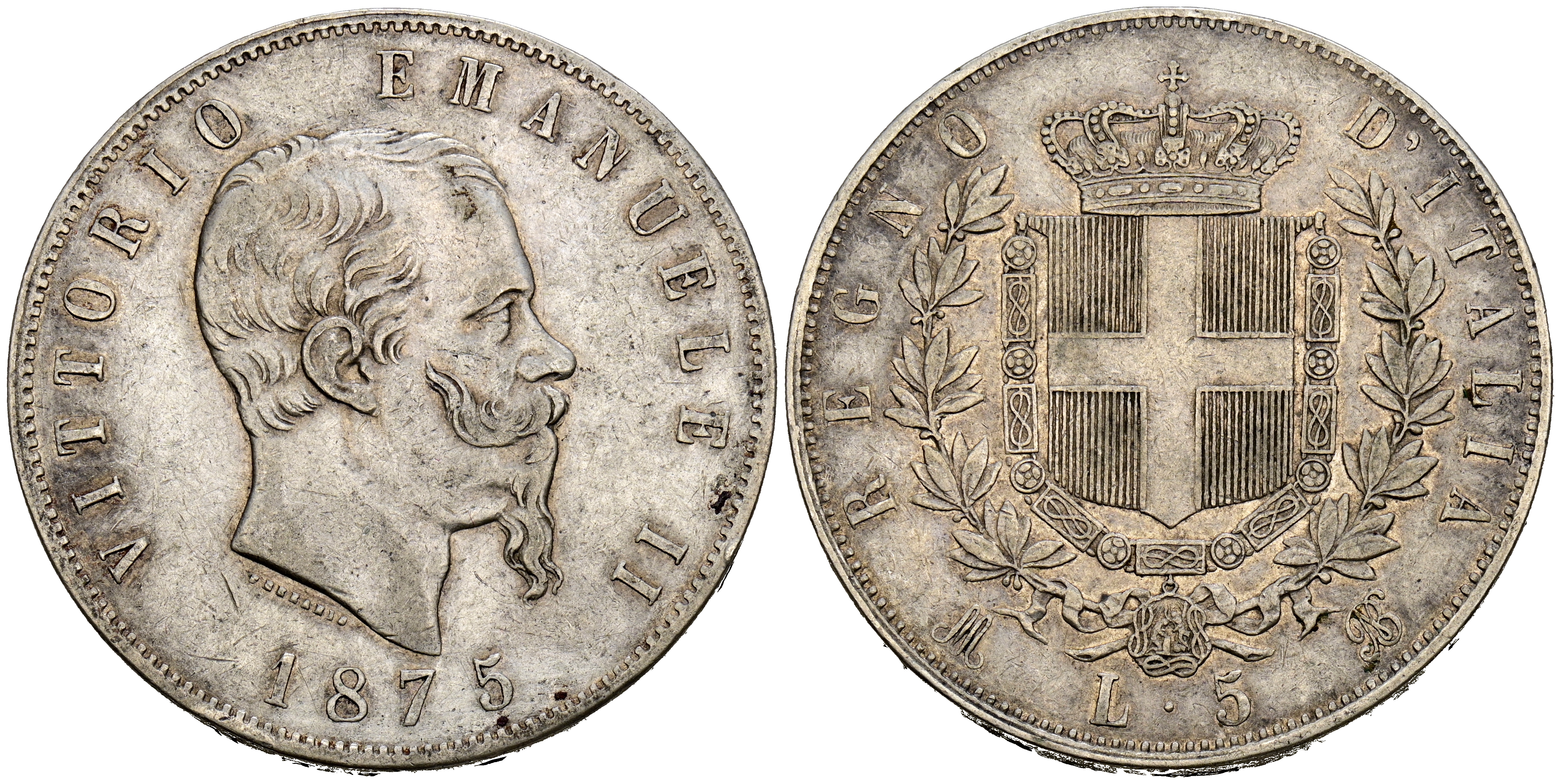 ITALIA, Victor Manuel II. 5 Liras. (Ar. 24,50g/37mm). 1875. Milán. (Km#8.3). MBC.