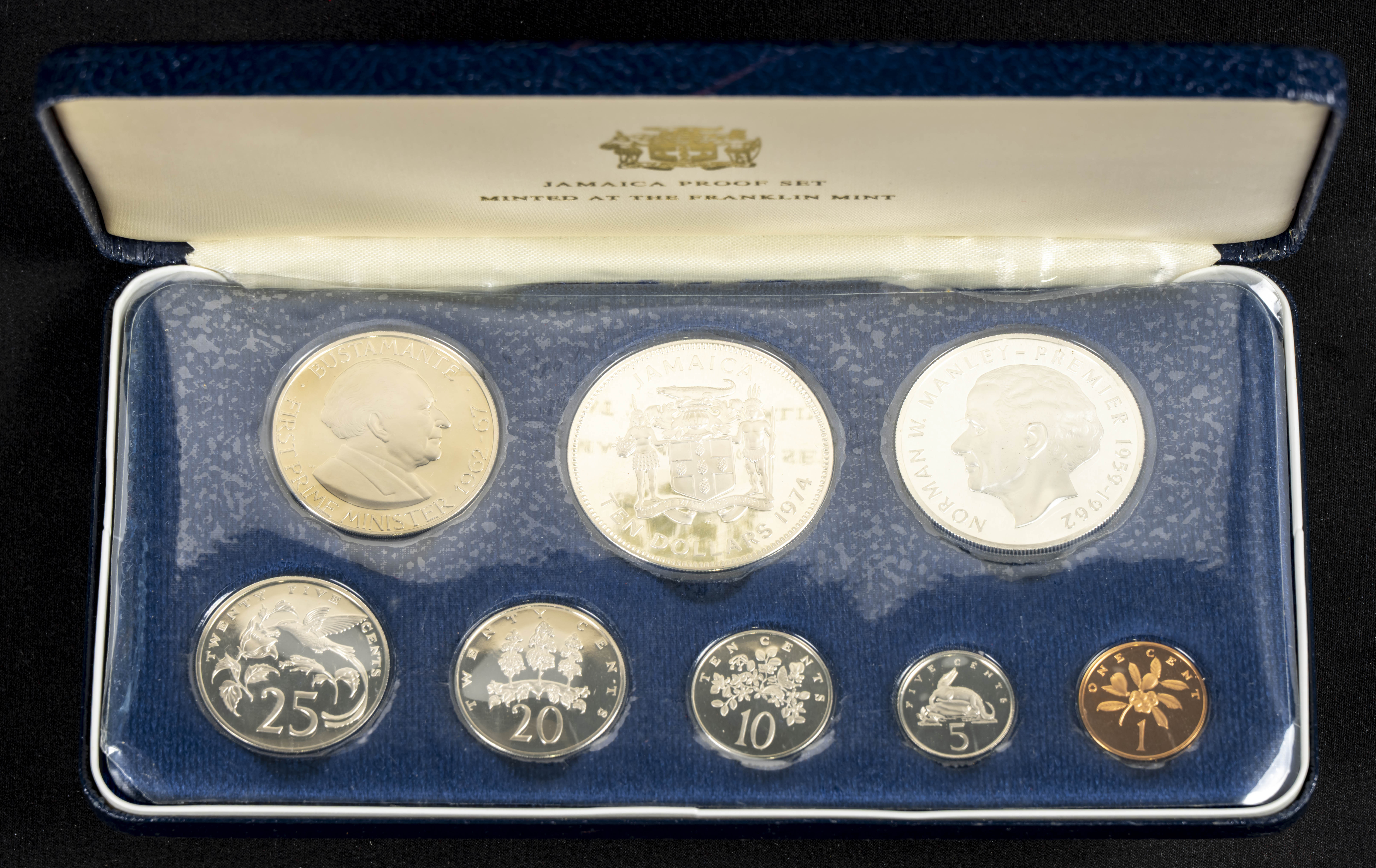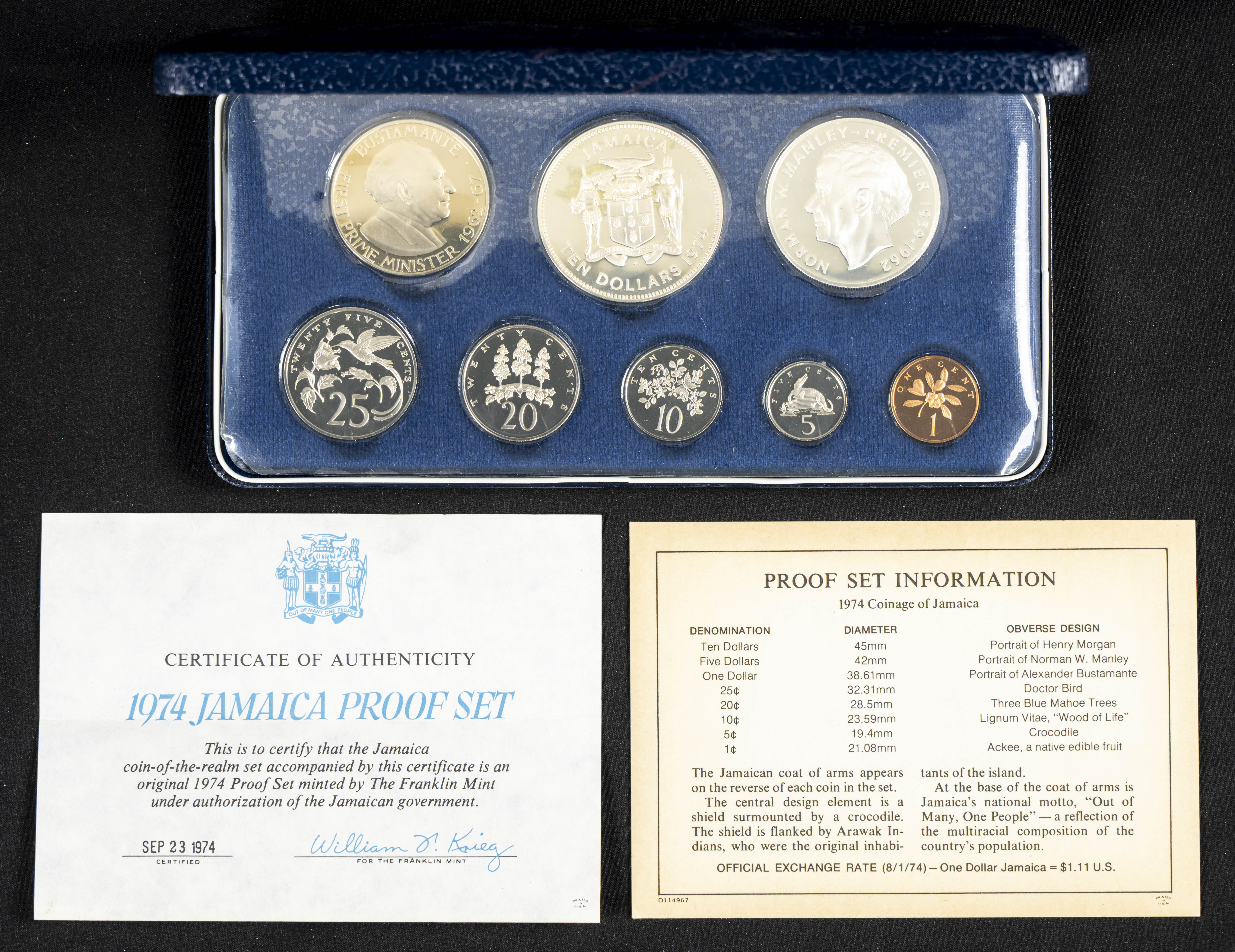 JAMAICA. Set completo y oficial de 1974 formado por 8 monedas. Valores comprendidos entre 1 Cent y 10 Dollars. Acuñado por The Franklin Mint. PROOF. Incluye estuche (monedas en blister sin sacar) y certificado de auntenticidad.