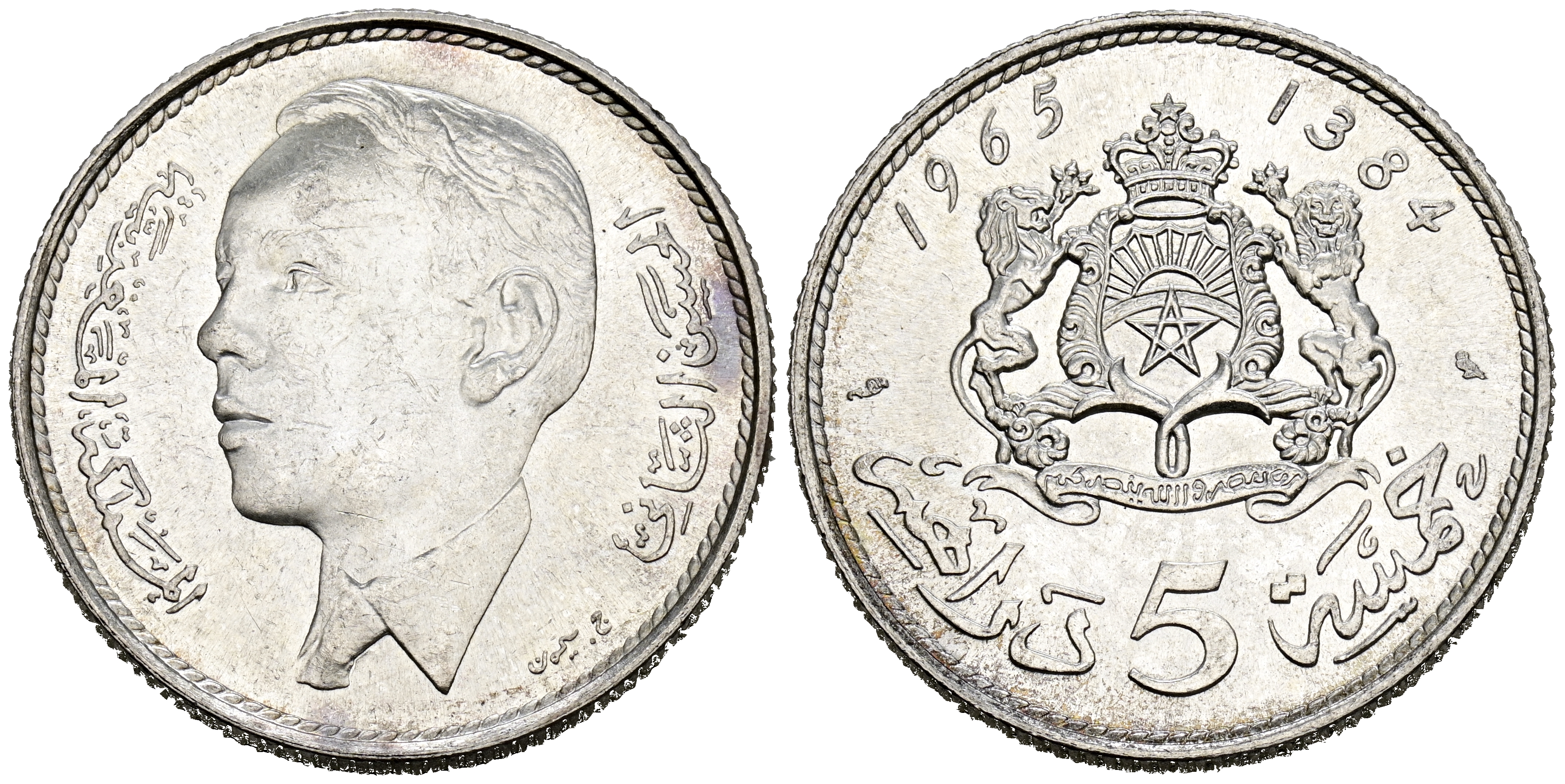 MARRUECOS. 5 Dirhams. (Ar. 11,79g/29mm). 1965. (AH 1384). SC-.