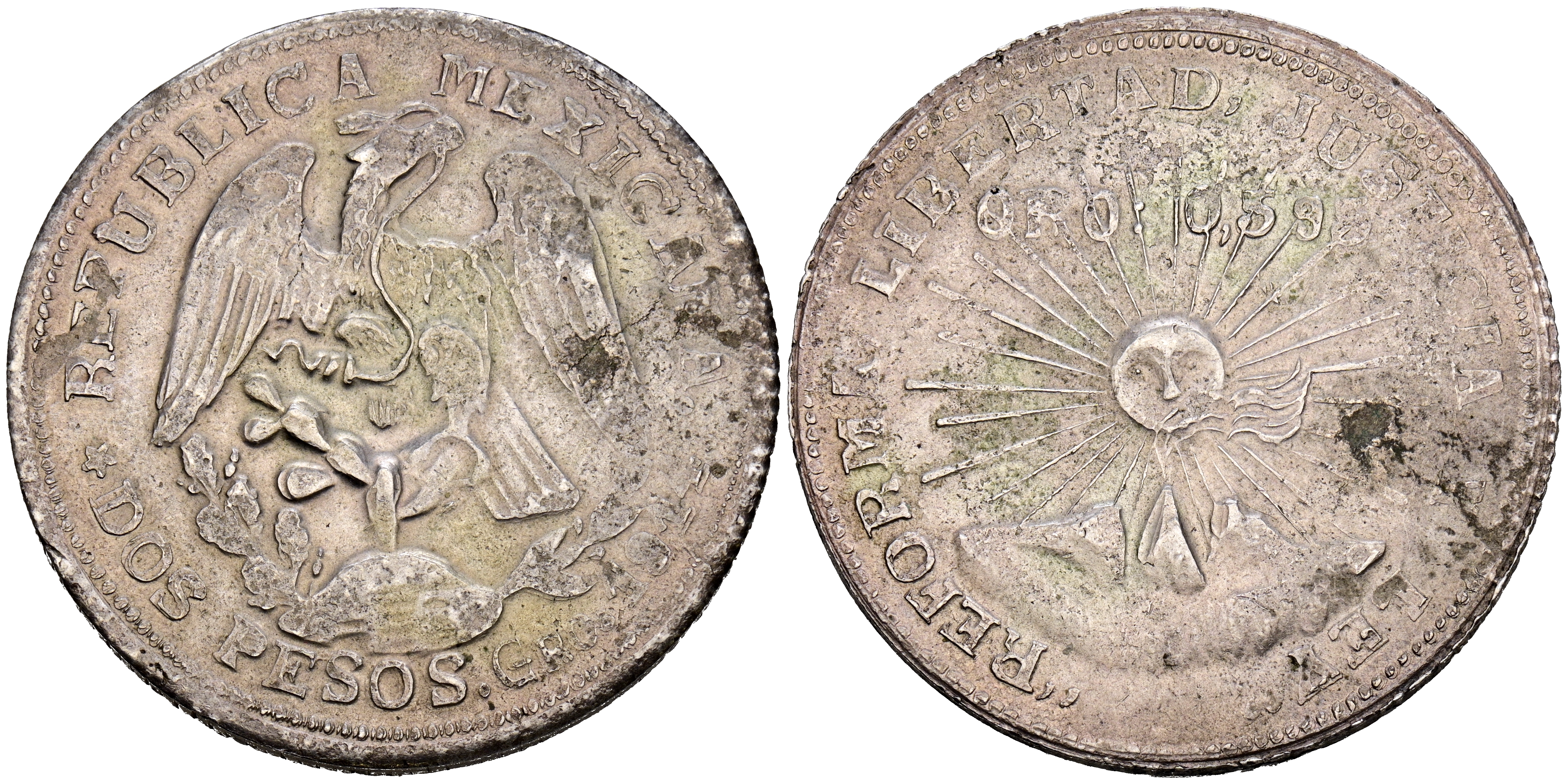 MÉXICO. 2 Pesos. (Ar. 25,92g/39mm). 1914. Estado de Guerrero (Emiliano Zapata). (Km#643). MBC. Buen ejemplar para esta serie caracterizada por ser acuñaciones toscas, descuidadas y con grandes variaciones de peso dado el contexto histórico del momento.