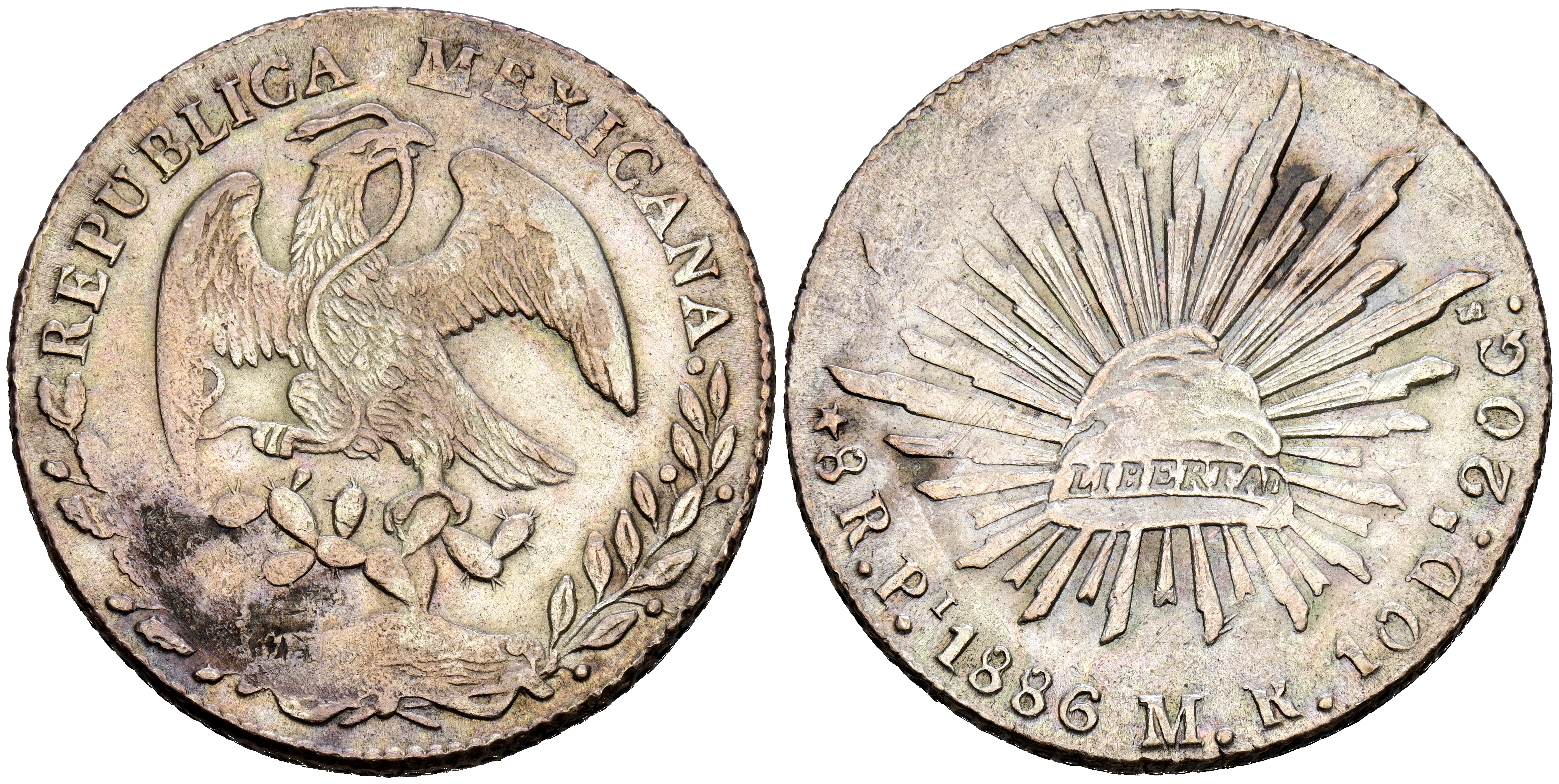 MÉXICO. 8 Reales. (Ar. 27,05g/39mm). 1886. San Luis de Potosí MR. (Km#377.12). MBC. Bonito tono.